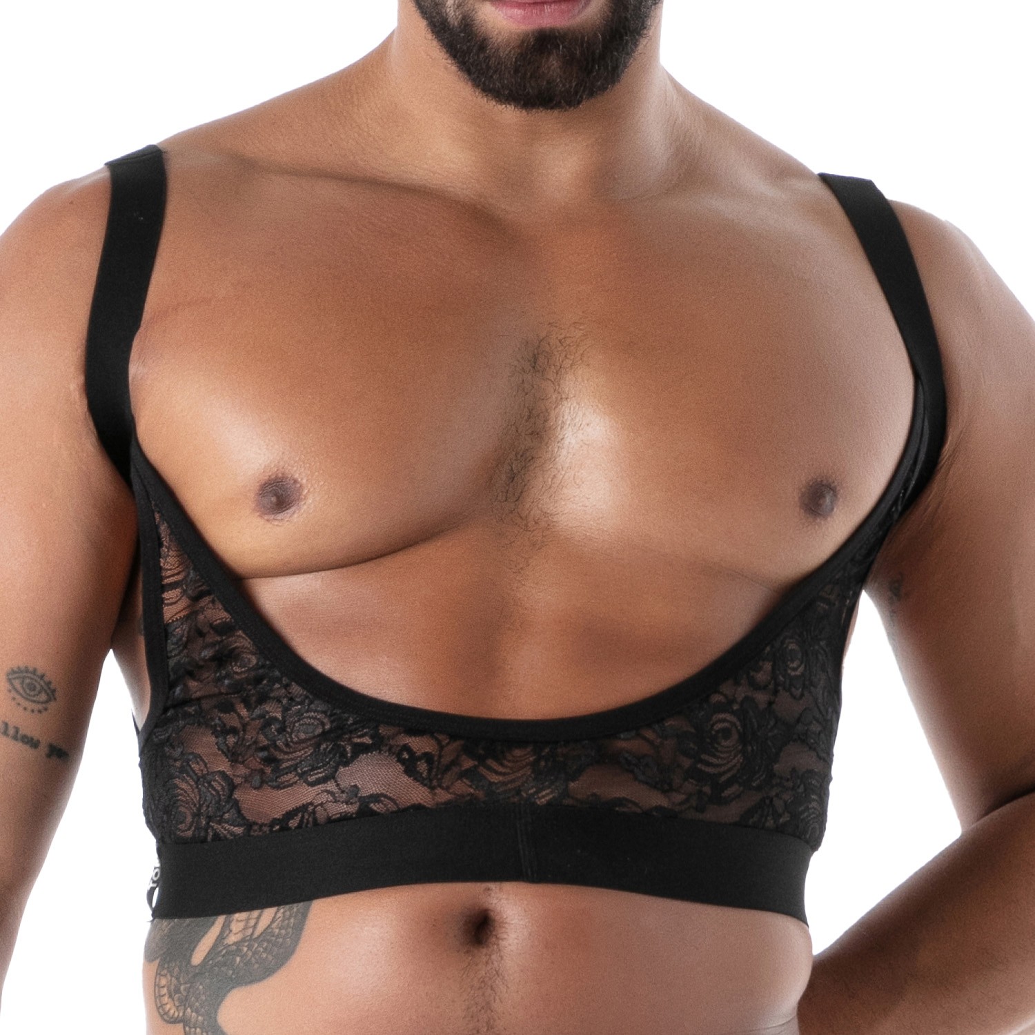 Confectionné dans une dentelle fluide de qualité, ce porte-jarretelles s'ajuste parfaitement à la morphologie masculine, offrant un confort inégalé. Les bandes élastiques, quant à elles, soulignent subtilement le torse, créant un effet visuel séduisant qui ne manquera pas d'attirer les regards admiratifs.