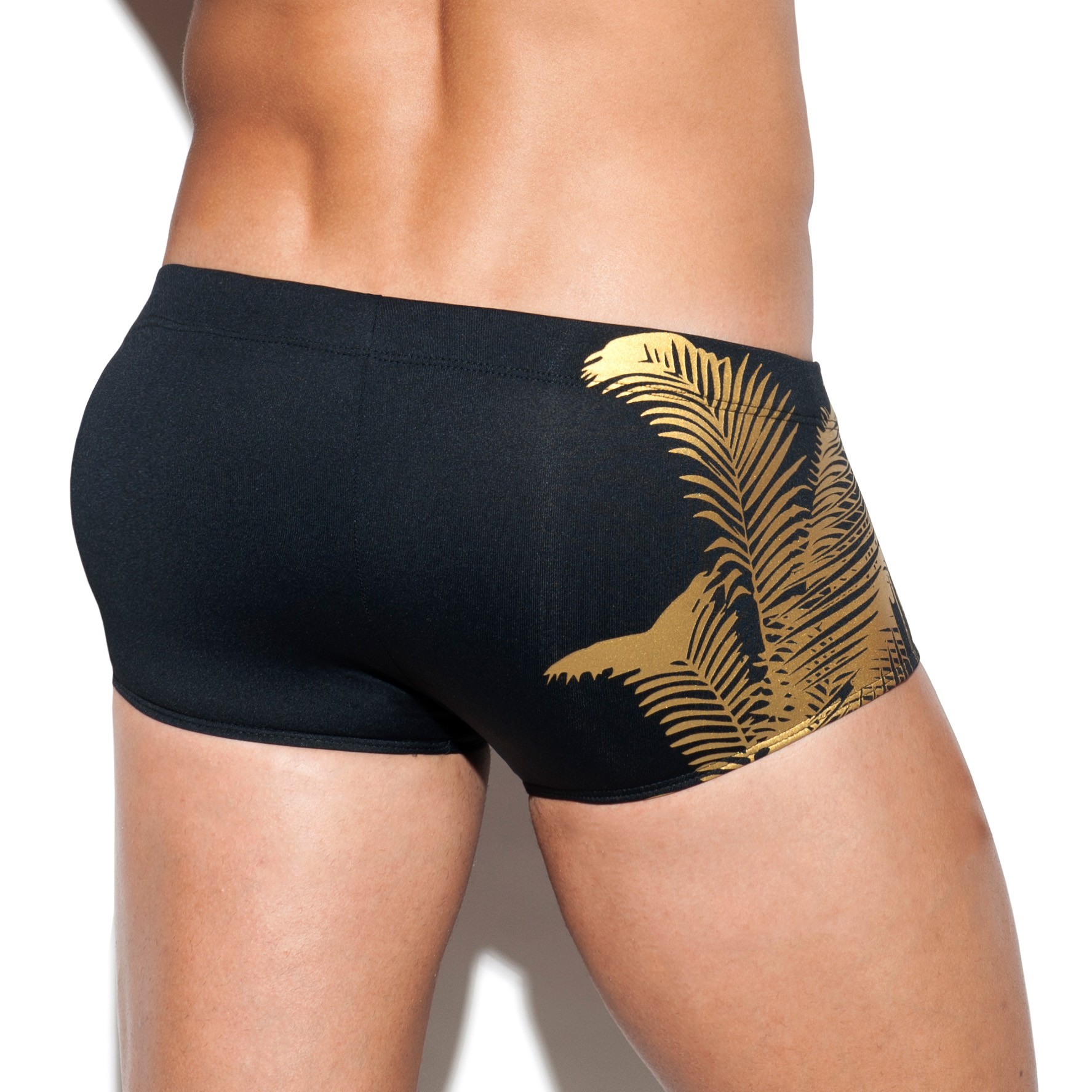 Shorty de bain très tendance, arboré d'une estampe de feuilles sur le côté.
