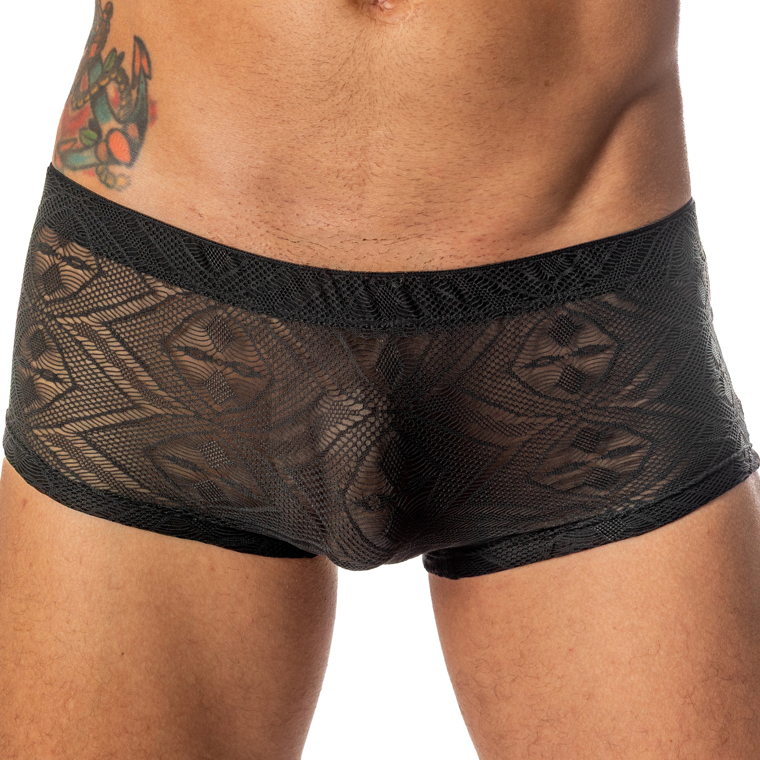 Shorty Bellevue court pour homme. La matière microfibres fluide et légère offre un confort et une liberté du mouvement. La coupe taille basse met en valeur le corps masculin et s’orne de jolis motifs ajourés. L’atout du shorty bellevue est l’absence de couture avant et arrière pour ne pas gêner le sexe et permettre une bonne ergonomie.