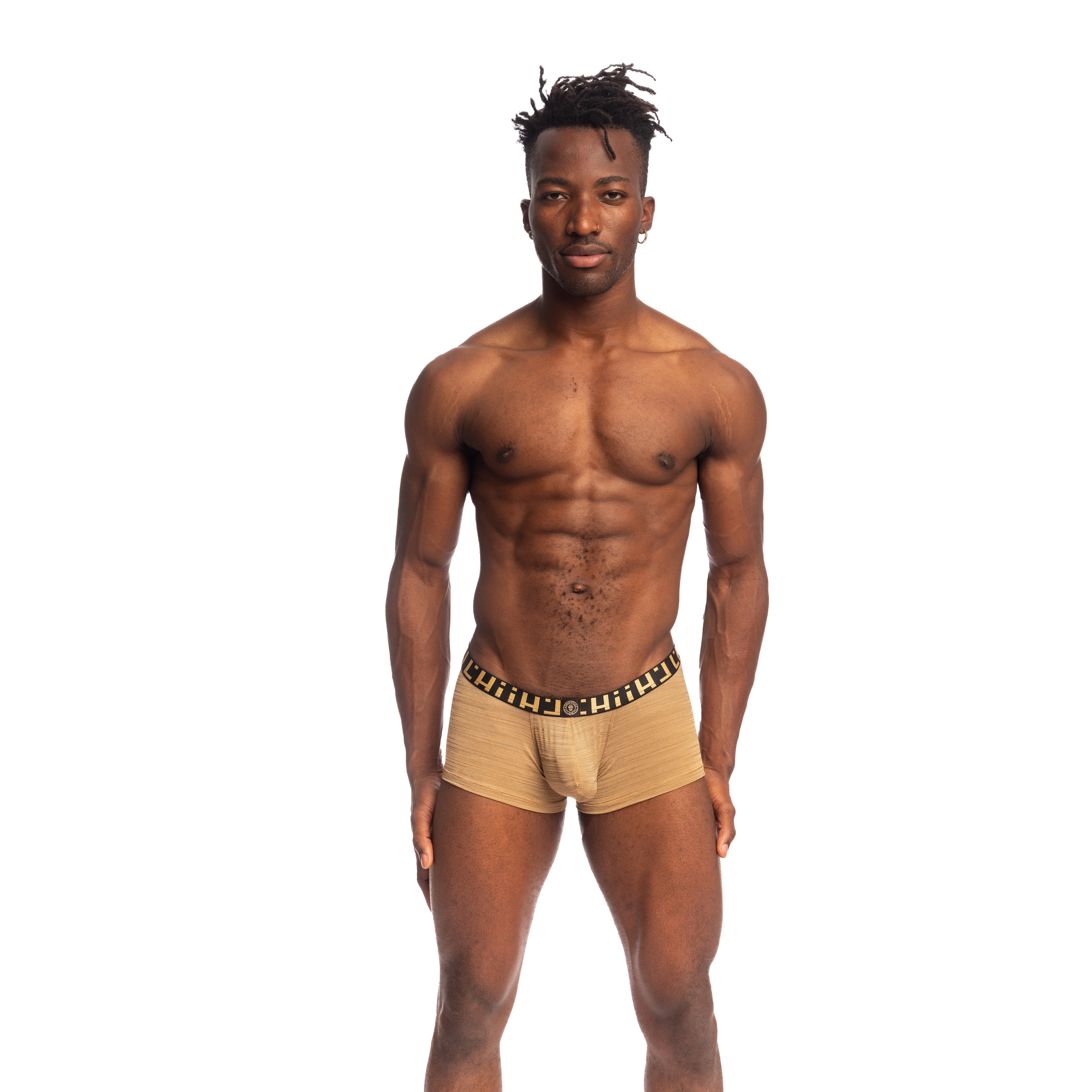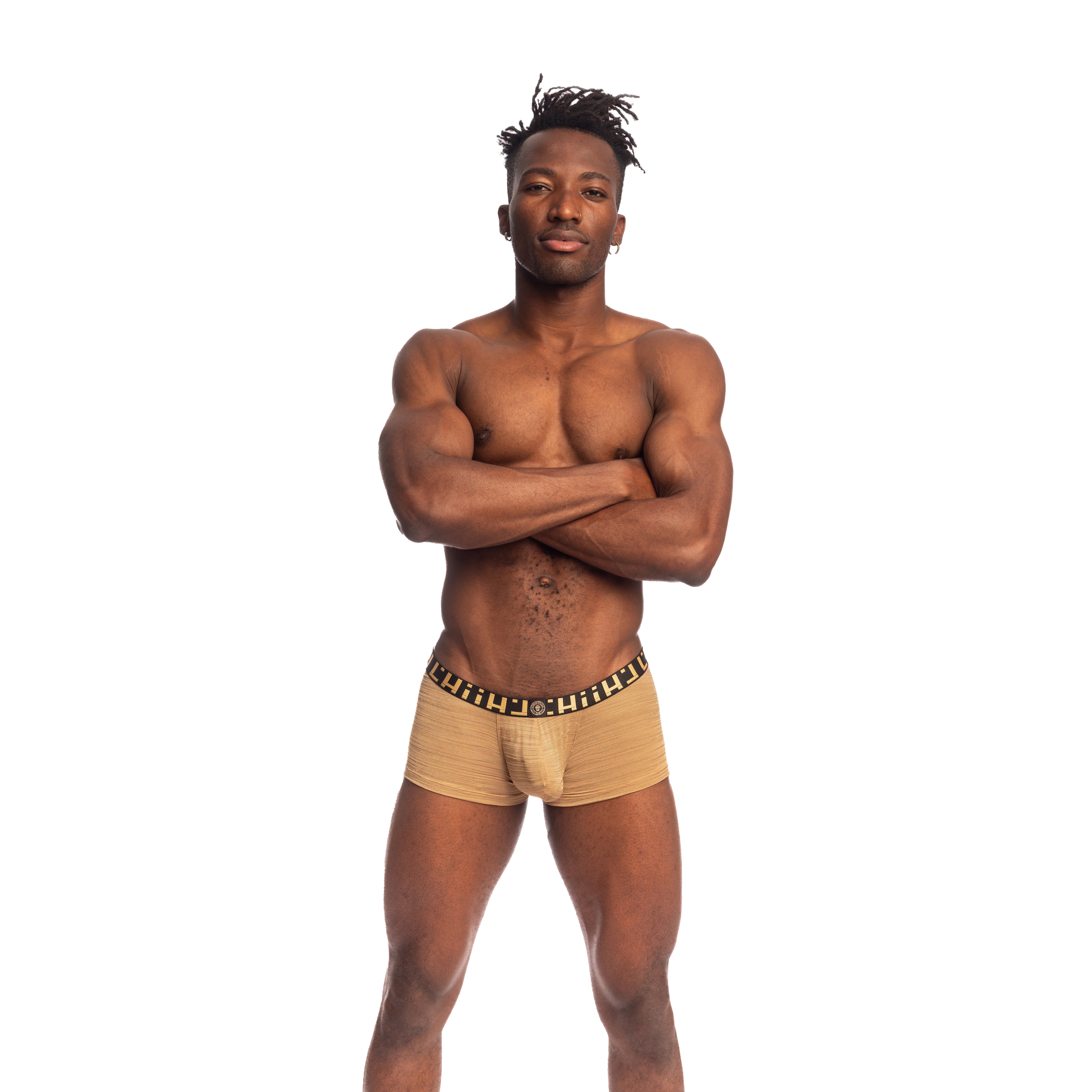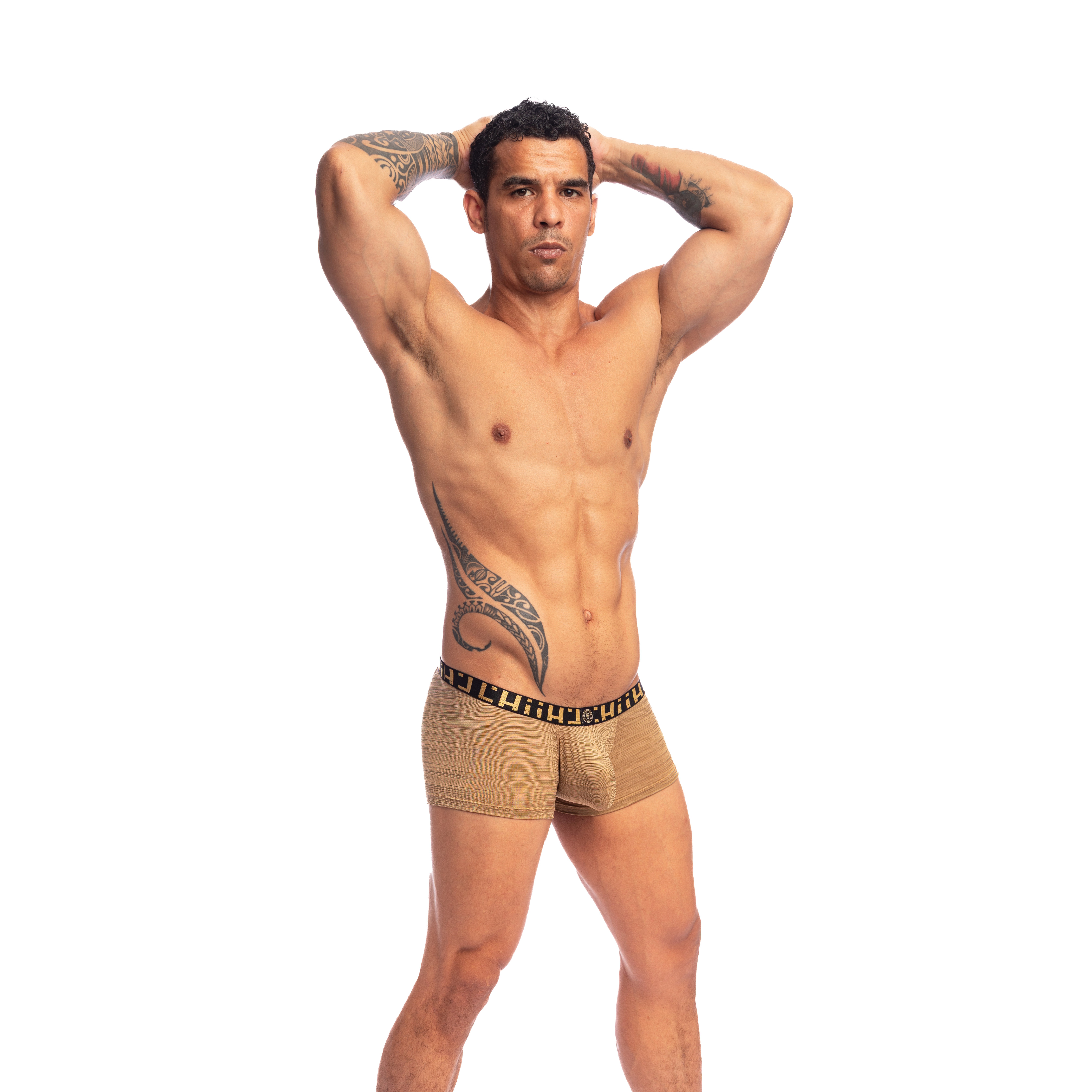 Confectionné dans une microfibre dorée d'une qualité exceptionnelle, le **Hipster Push** offre un éclat moiré qui attire le regard tout en apportant une profondeur visuelle unique. Ce tissu premium autrichien, soigneusement cousu au Portugal, épouse délicatement la peau, créant une sensation seconde peau qui accompagne tous vos mouvements avec fluidité et souplesse. L'effet push-up intégré n'est pas qu'un simple ajout ; il offre un maintien sculptant naturel qui met en valeur votre silhouette masculine sans jamais sacrifier votre confort.