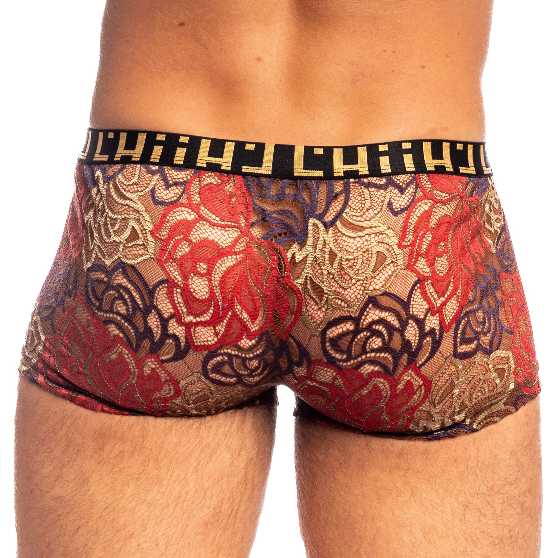 Conçu en dentelle italienne délicate, le **Hipster Push-Up Jardin Enchanté** présente des motifs floraux ajourés qui évoquent un jardin luxuriant. Les teintes riches de violet aubergine, bordeaux et doré dansent sur la peau, célébrant ainsi la coquetterie masculine avec une élégance sans pareille. Cet accessoire de mode se distingue non seulement par sa beauté visuelle, mais aussi par son confort inégalé. L'élastique de 2,5 cm, orné des lettres LHI en graphisme or et noir, affiche une signature luxueuse qui se marie harmonieusement avec la dentelle, affirmant ainsi votre appartenance à l'univers raffiné de L'Homme Invisible.
