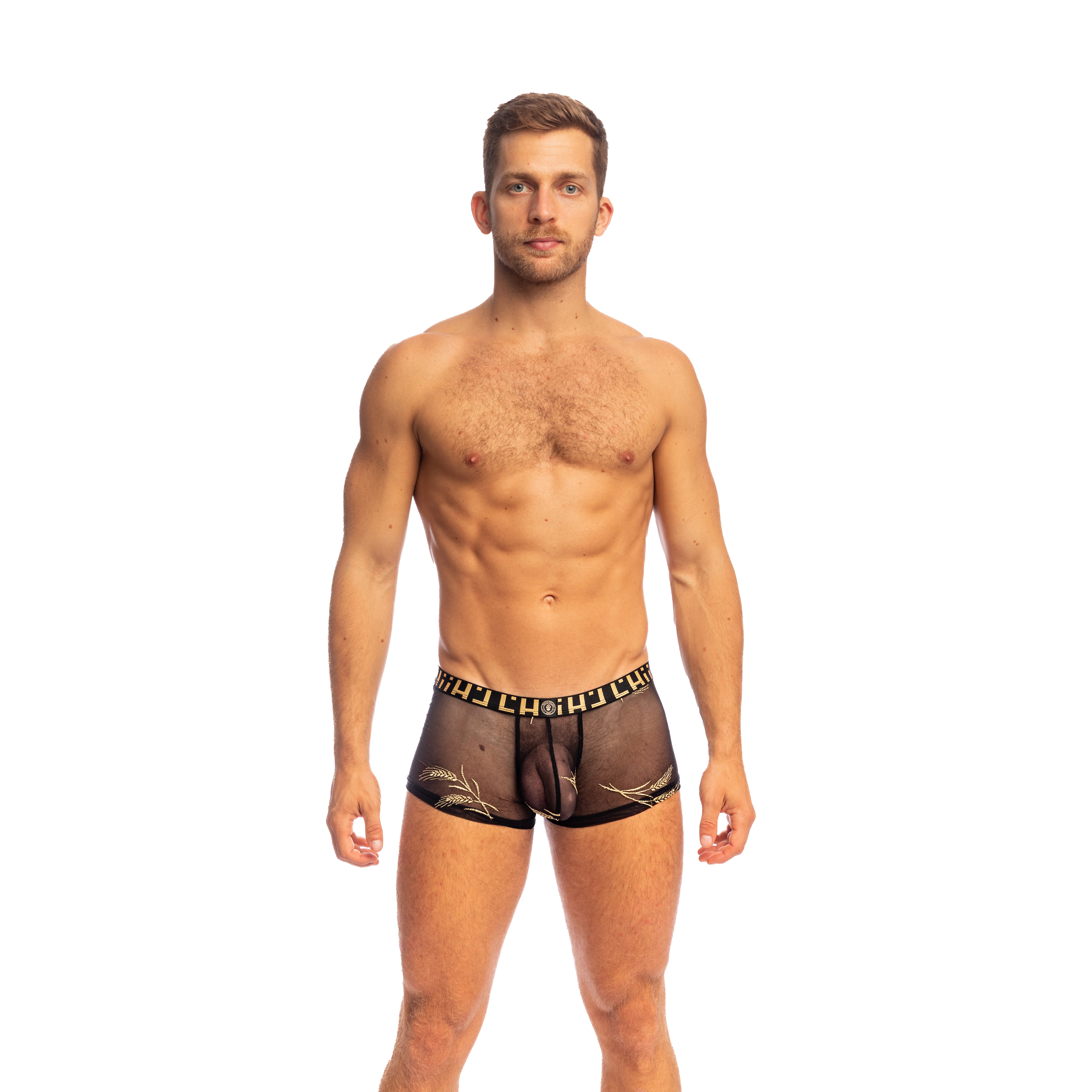 Réalisé en tulle noir transparent, le Hipster Push-up Épi d'Or se distingue par ses magnifiques broderies dorées en forme d’épis de blé, créant ainsi un motif unique pour chaque modèle. Cette attention au détail témoigne du savoir-faire artisanal qui caractérise L'Homme Invisible. La coupe basse de ce boxer met en valeur les lignes du corps, tandis que la ceinture de 2,5 cm, ornée du motif graphique noir et or, apporte une note de luxe indéniable.