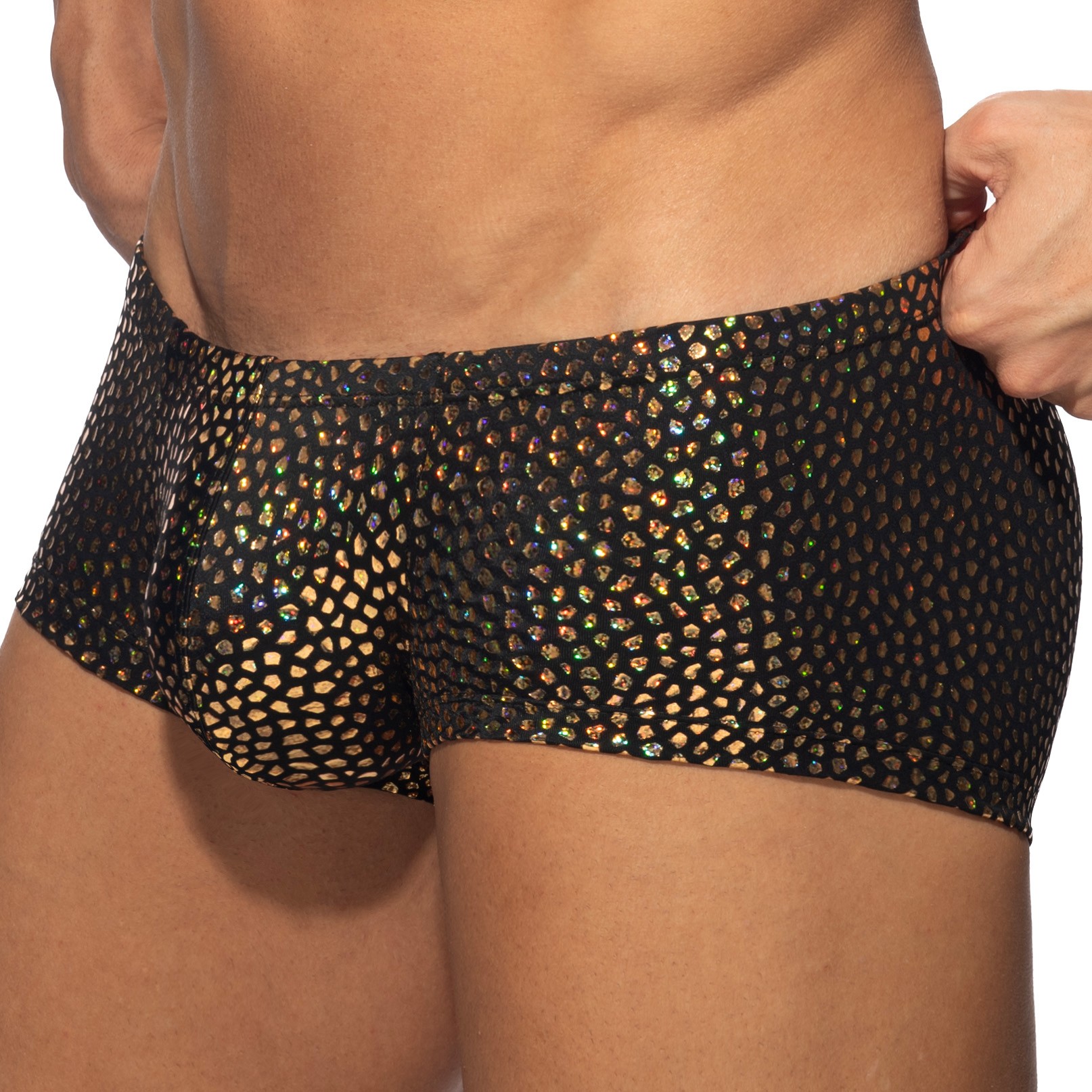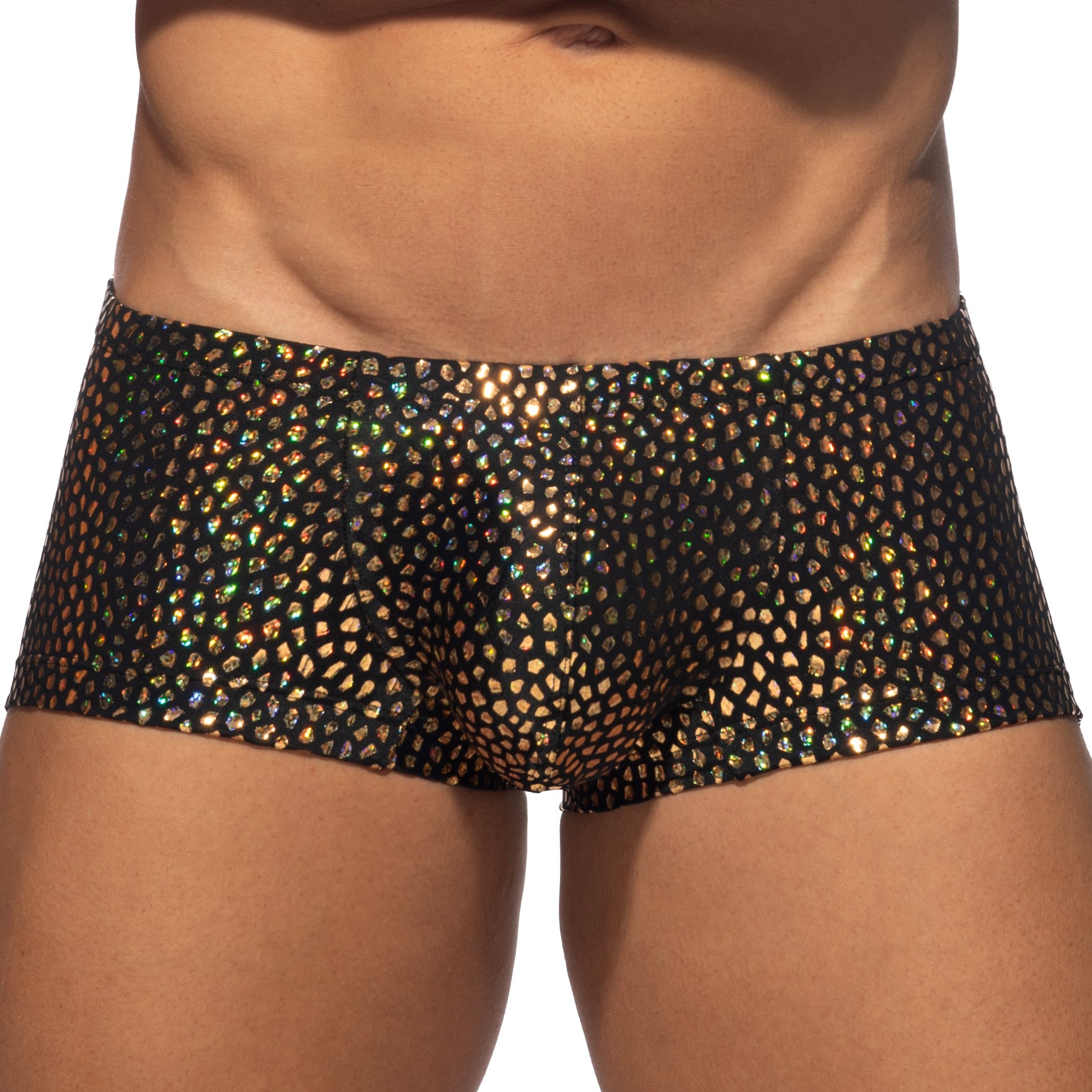 La première chose qui frappe avec ce modèle est son effet laminé scintillant et doré, inspiré des pierres précieuses. Tel un bijou, le **Trunk Gold Stones** est lourd sur le charme et magnifiquement brillant, vous permettant de capter tous les regards lors de vos soirées. Sa texture douce au toucher, conjuguée à un design qui épouse parfaitement les formes masculines, crée une sensation de luxe inégalée. En enfilant ce boxer, vous ne portez pas seulement un sous-vêtement, mais une véritable œuvre d’art qui reflète votre personnalité audacieuse et votre sens du style.