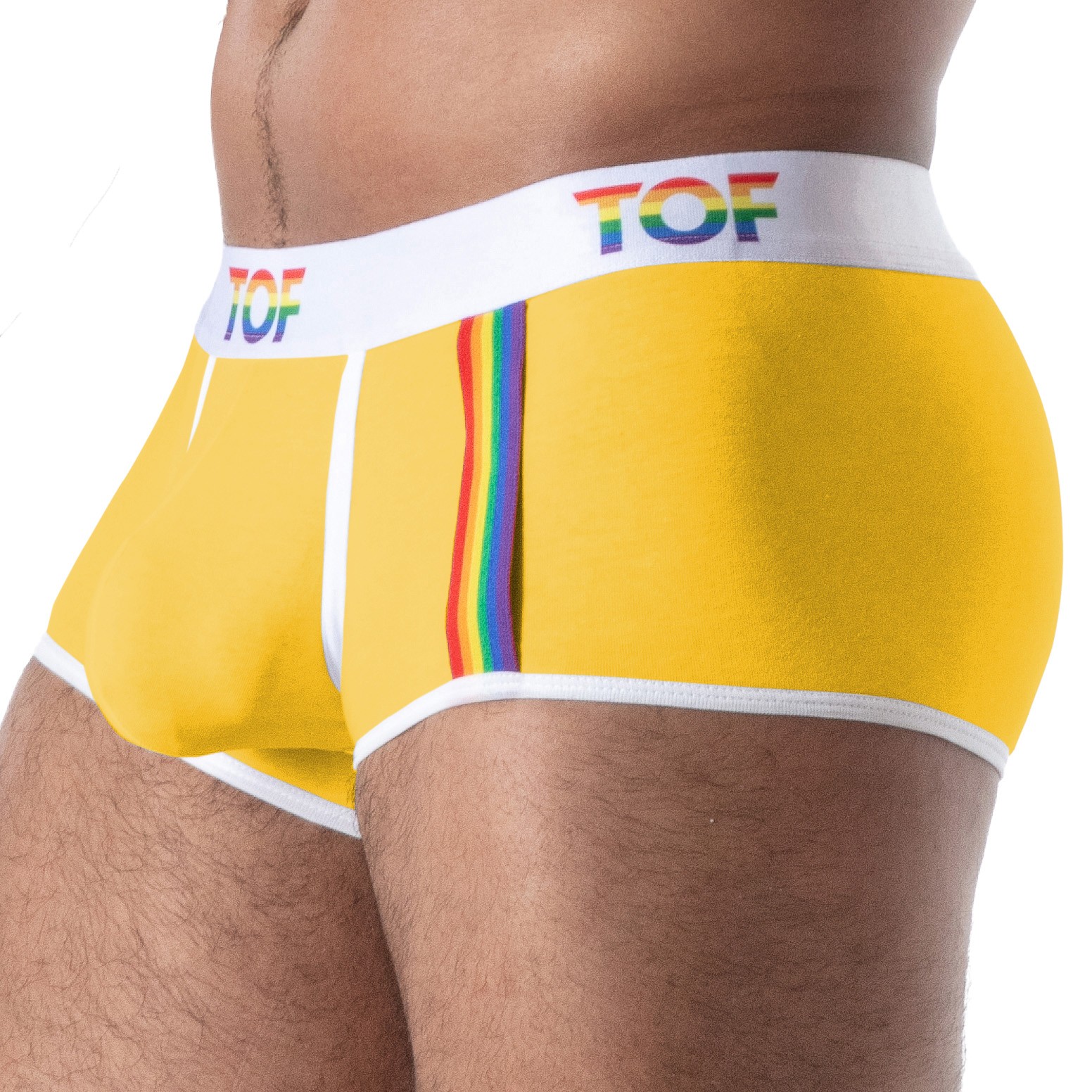 Ce boxer est bien plus qu’un simple sous-vêtement; il est une véritable déclaration de style. Avec sa belle poche frontale soigneusement élaborée, il met en valeur vos atouts tout en garantissant un maintien optimal. La bande latérale arc-en-ciel, véritable symbole de fierté et de diversité, vous permet d'accrocher facilement un débardeur ou un t-shirt, ajoutant ainsi une touche moderne et dynamique à votre look. Que ce soit pour une journée au bureau ou une soirée entre amis, le **Trunk Joyful Pride TOF Paris - Jaune** se prête à toutes les occasions.