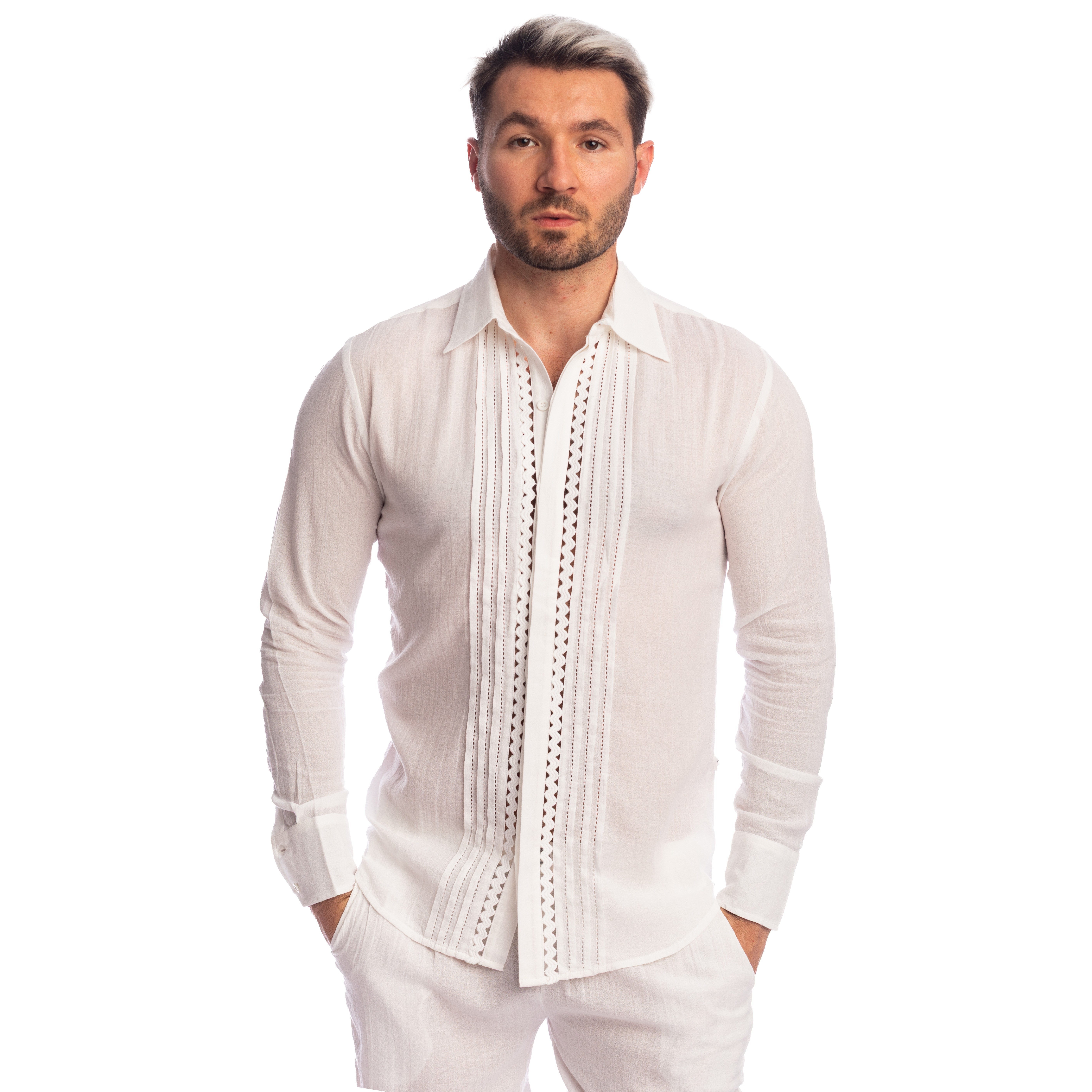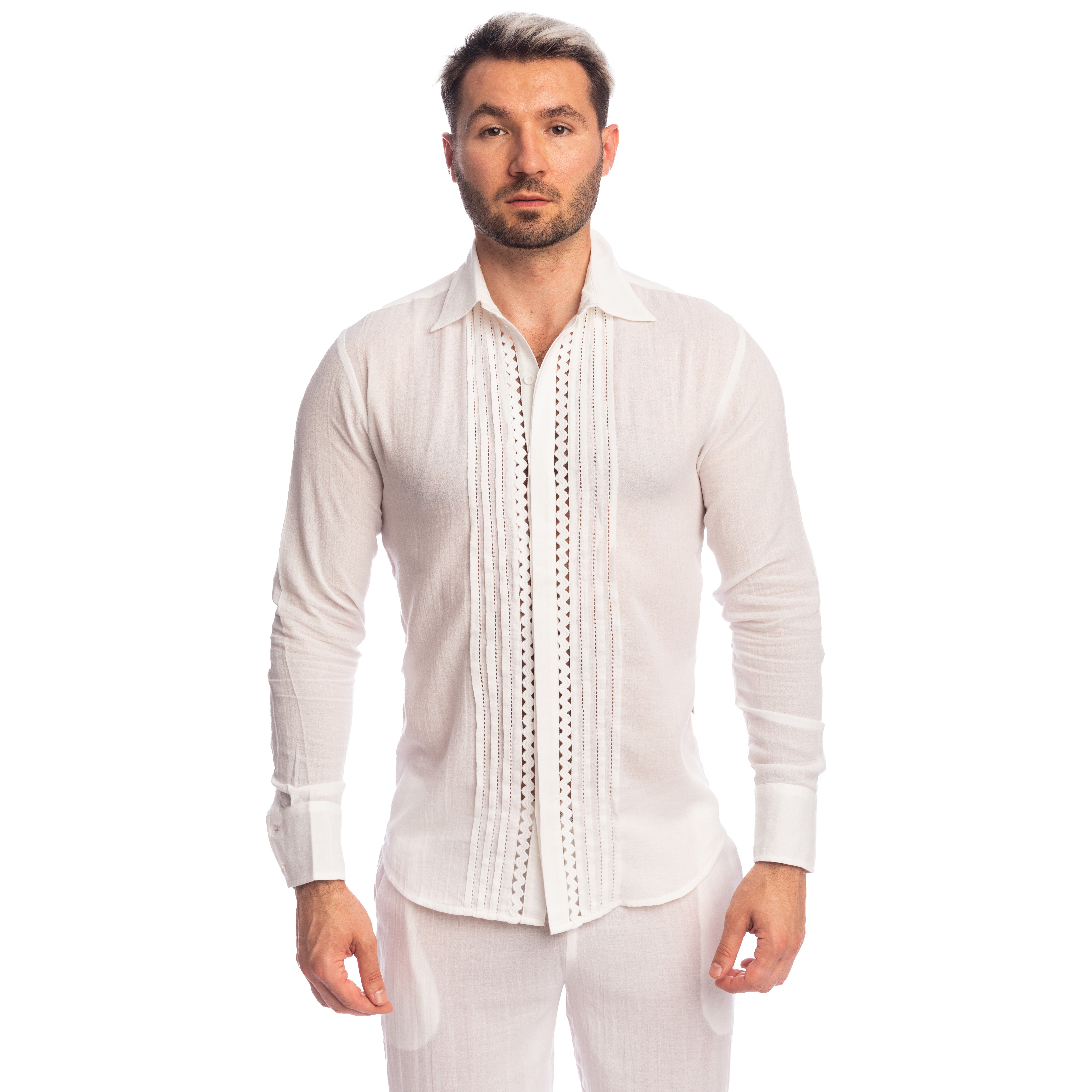Le devant de la chemise Amalfi se distingue par un plastron finement détaillé, orné d'empiècements en dentelle délicate, de plis raffinés et d'une broderie ajourée qui attire le regard. Ces éléments de design audacieux créent un jeu subtil de lumière et de transparence, tout en ajoutant une touche de sophistication à votre tenue. Que vous choisissiez de la porter boutonnée pour une allure soignée ou ouverte pour une approche décontractée, cette chemise vous permet de faire une déclaration estivale irrésistible.