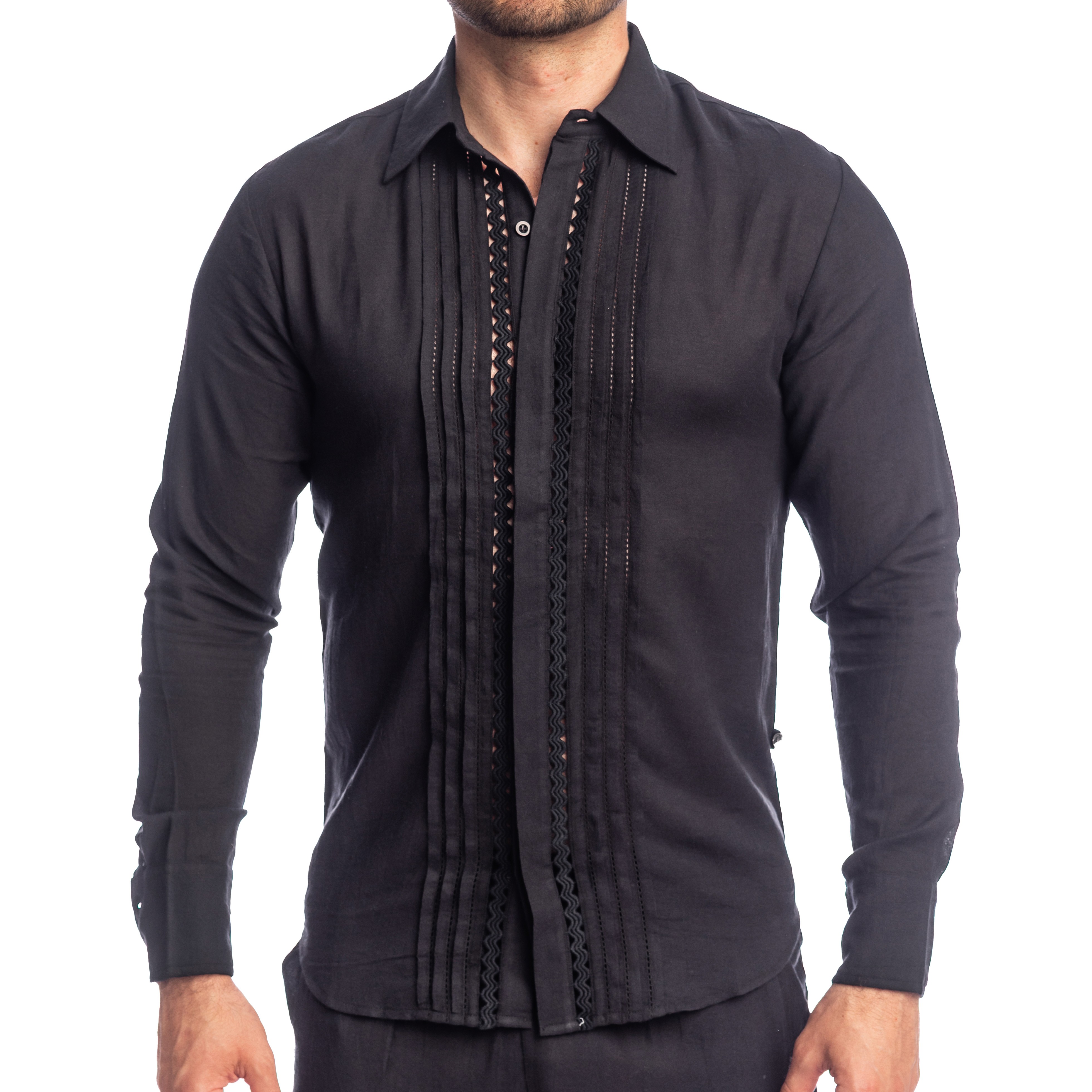 Le devant est orné d’un plastron finement détaillé, avec des empiècements en dentelle, des plis et une broderie ajourée de chaque côté d’une patte de boutonnage dissimulée—un design raffiné qui joue avec la lumière et la transparence.