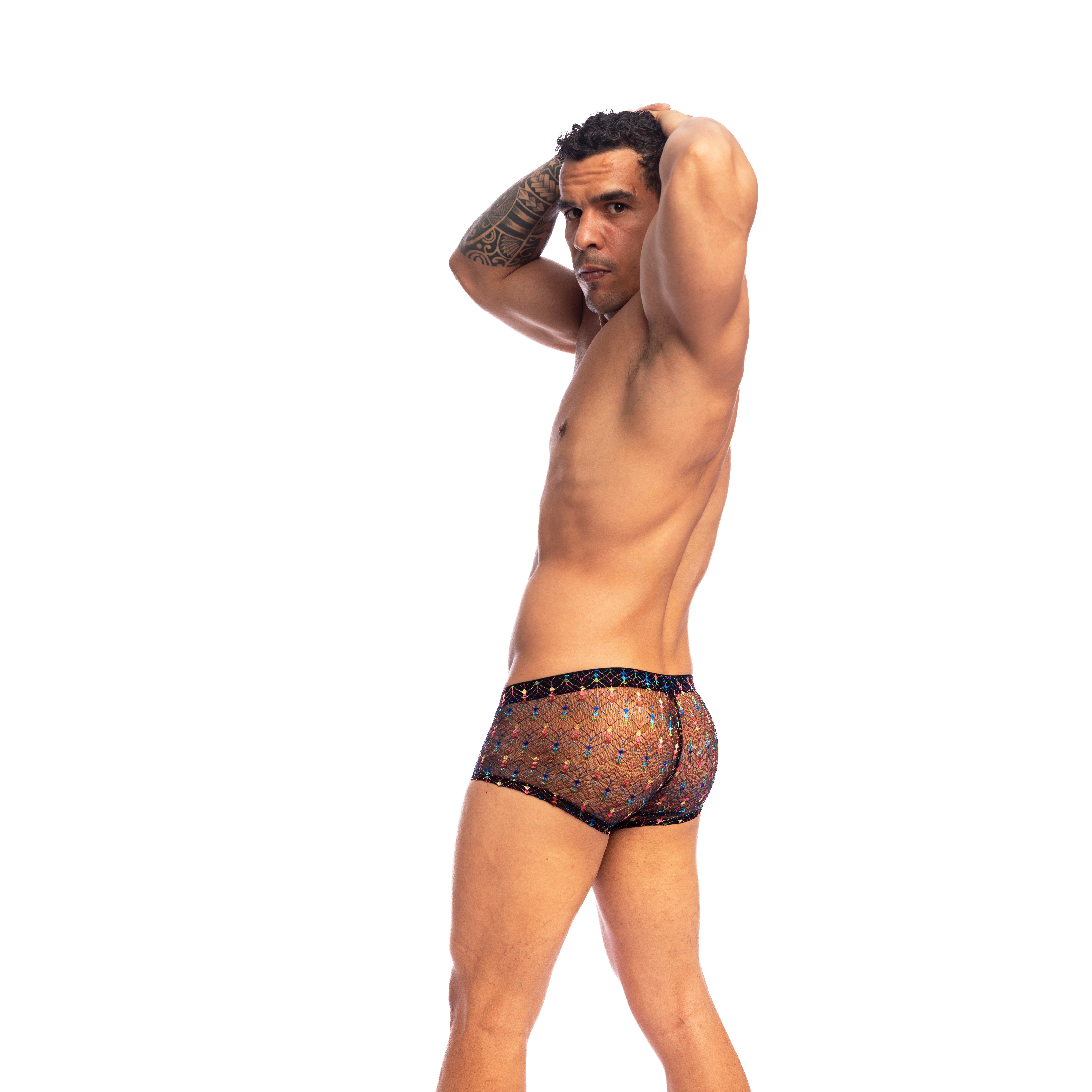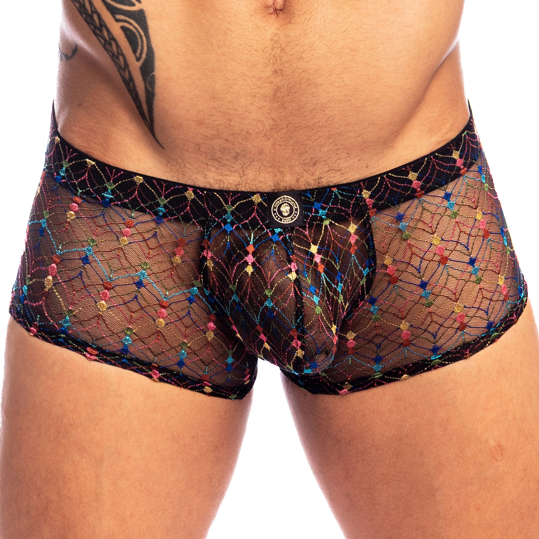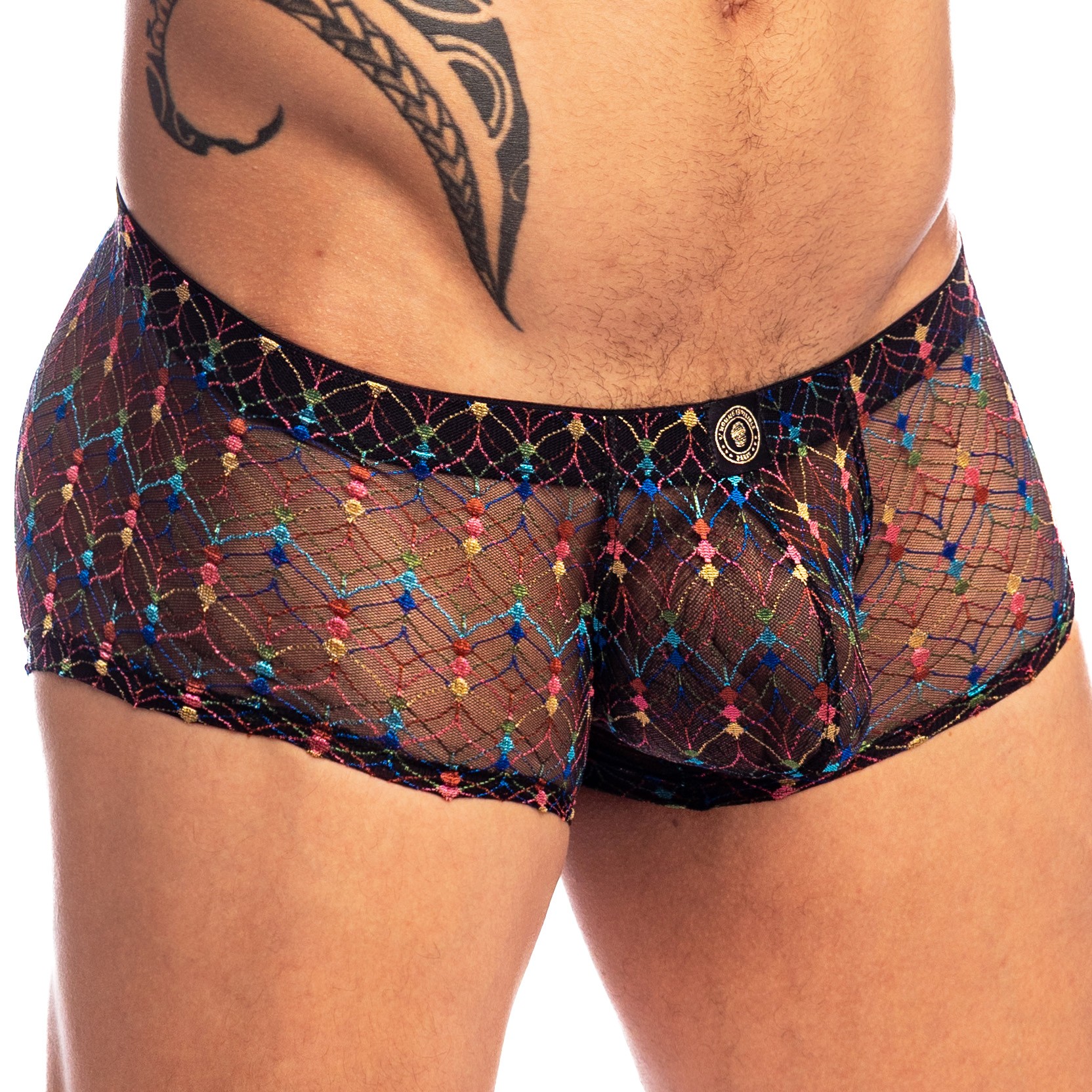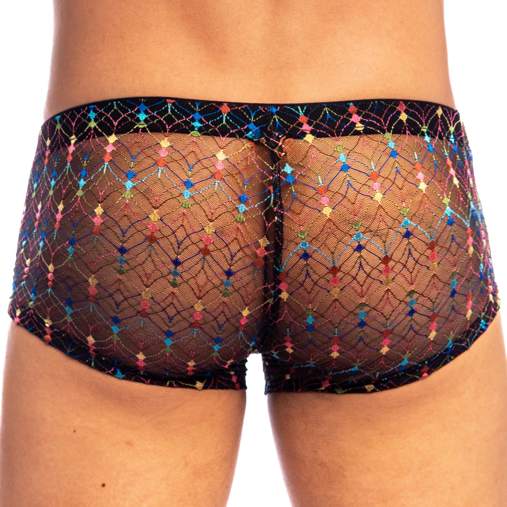 Der REVIVAL Push-Up MiniBoxer interpretiert die Herrenshorty in einer sinnlichen und leuchtenden Version neu. Gefertigt aus zart transparenter italienischer schwarzer Spitze, offenbart er seinen Reichtum im Hautkontakt und zeigt kleine, bunte quadratische Muster, die wie Konfetti verstreut sind.