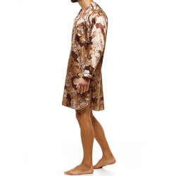 Dieses luxuriöse Lässigkeitskleidungsstück mit Satindruck, das ein florales Spitzenmuster imitiert, verfügt über eine Öffnung mit V-Ausschnitt.