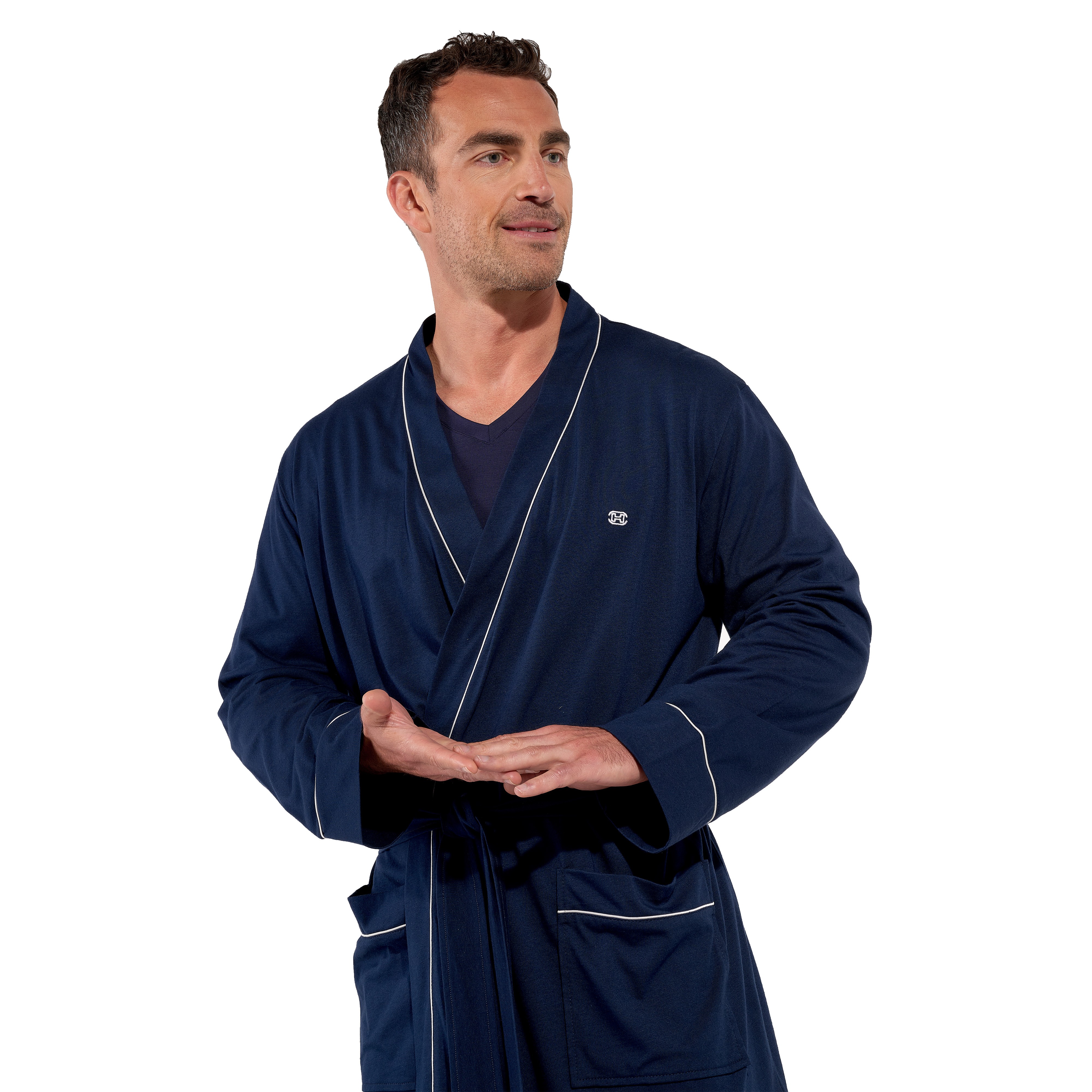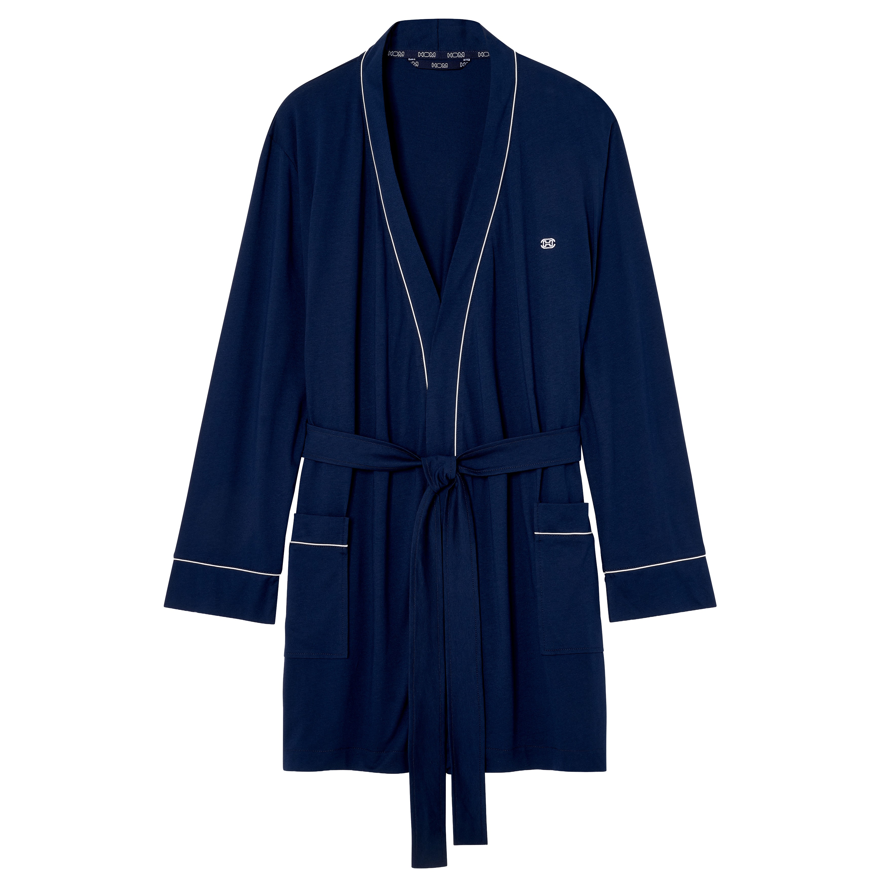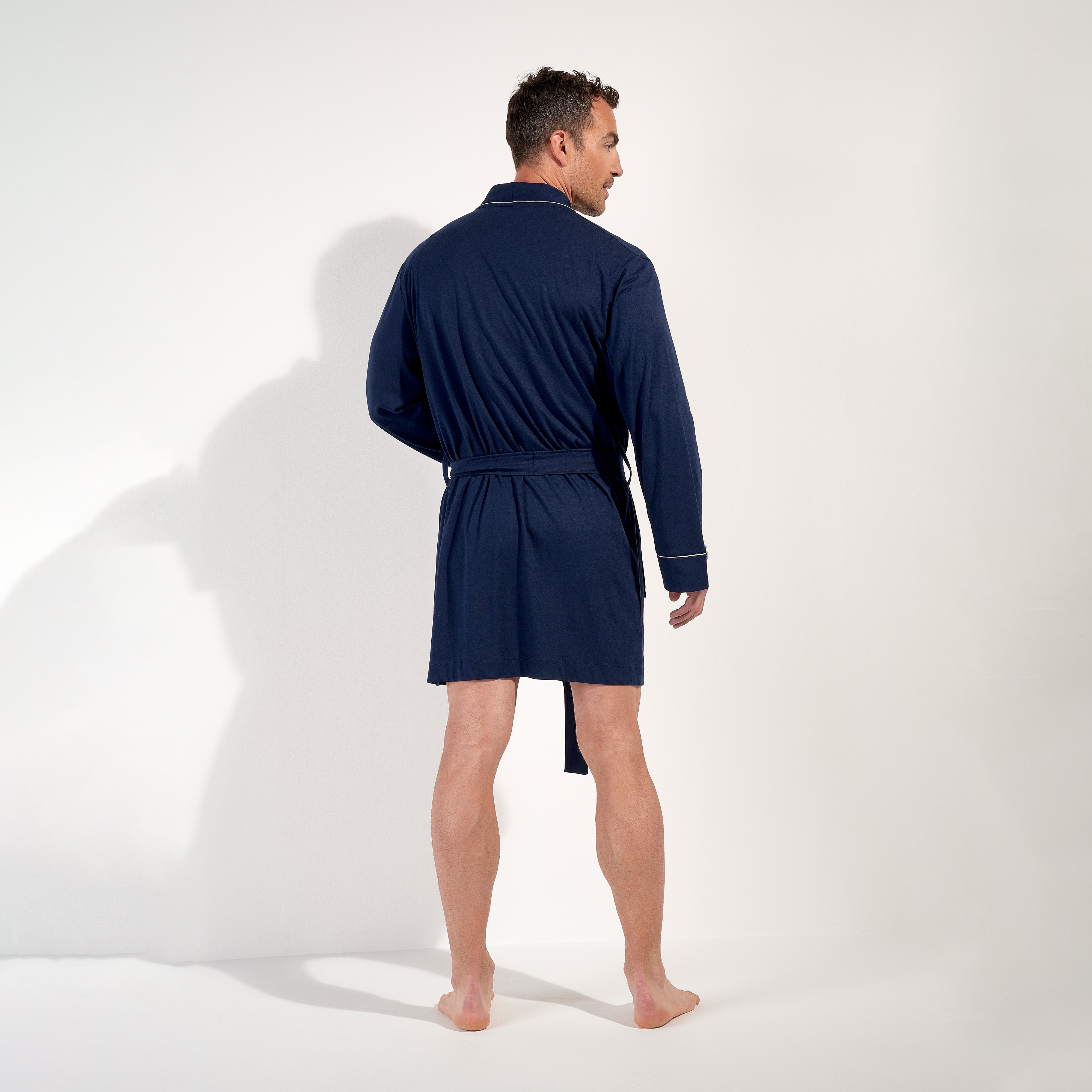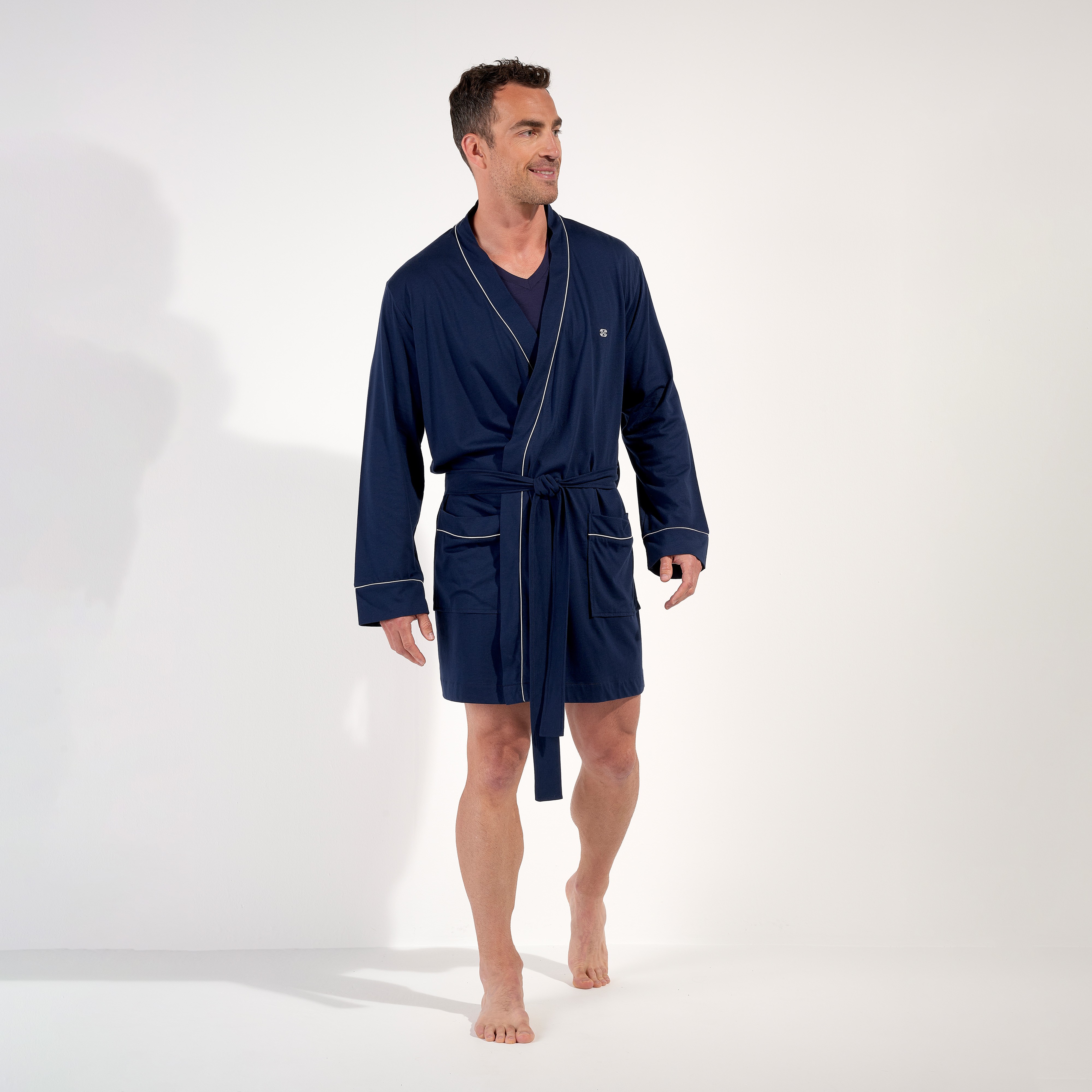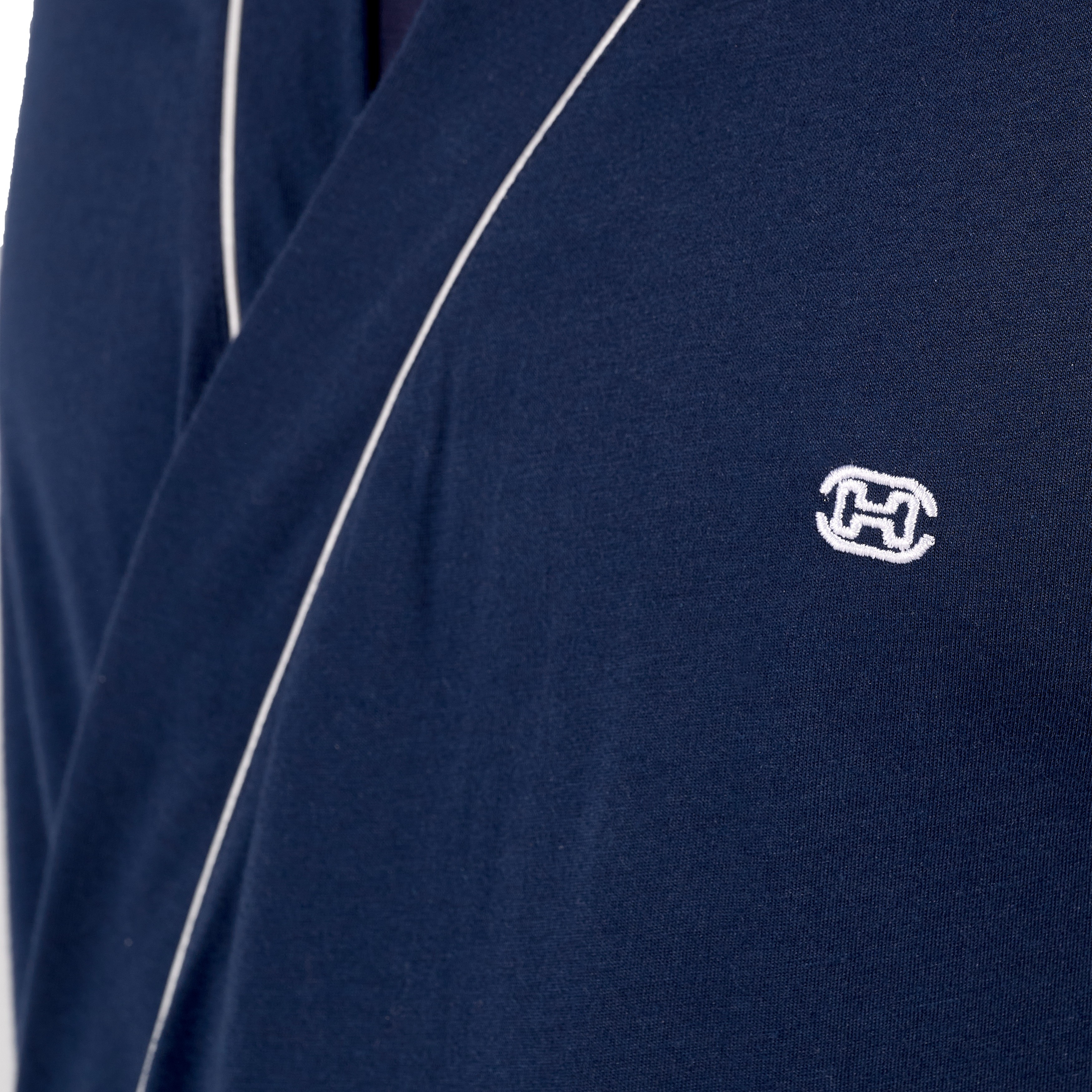 Der Rafael-Herrenkimono greift die Herren-Loungewear in einer modernen und anspruchsvollen Version auf. Hergestellt aus einer Mischung aus Baumwolle und Modal, bietet es ein flüssiges und seidiges Material mit bemerkenswertem Komfort. Die gekreuzten Bänder an der Taille sorgen für einen engen Sitz, während Stickereien auf der Brust und kontrastierende Paspels eine elegante Note verleihen. Das tiefe Mitternachtsblau betont die Nüchternheit und Raffinesse dieses Möbelstücks – ideal für entspannte Momente zu Hause oder morgens aufstehen.