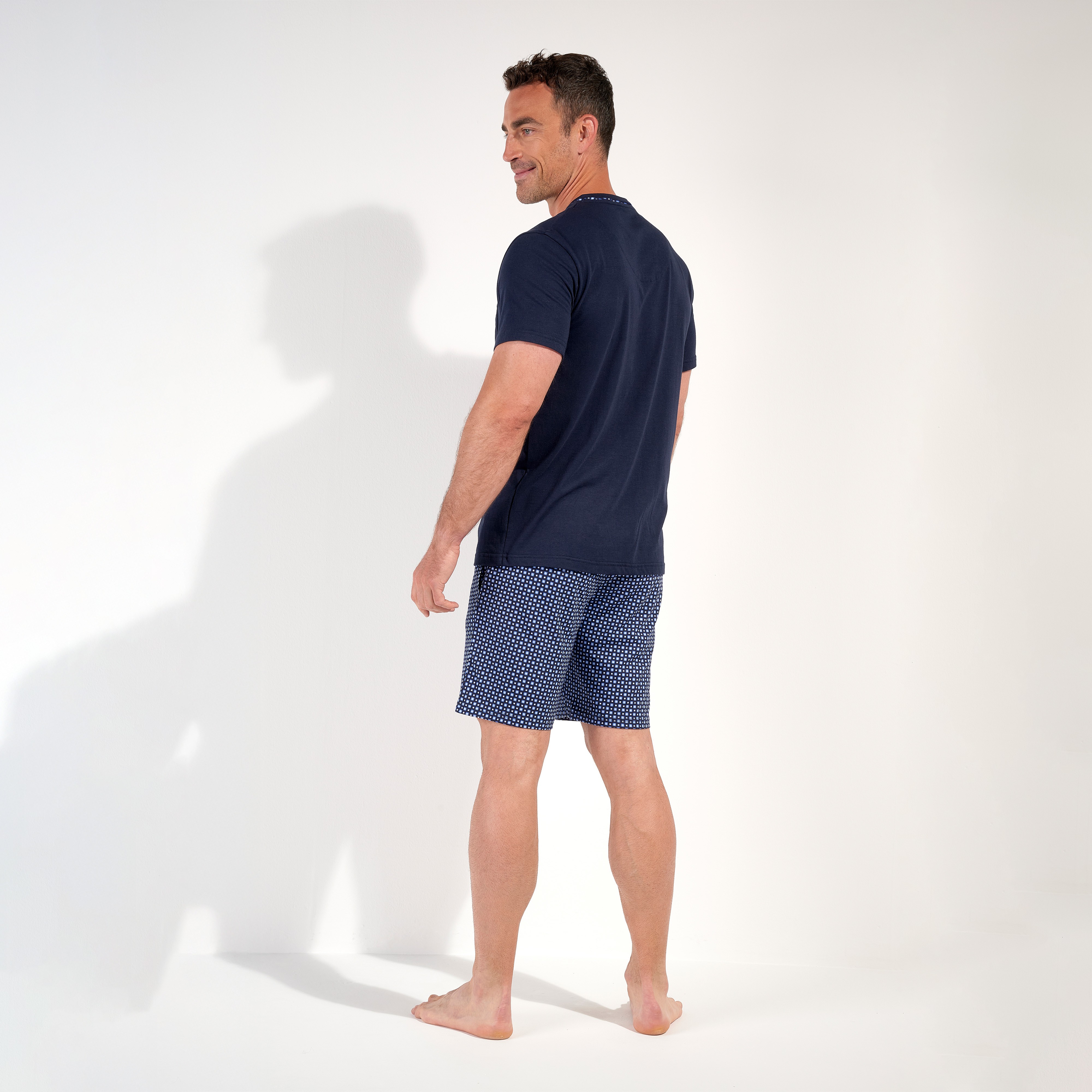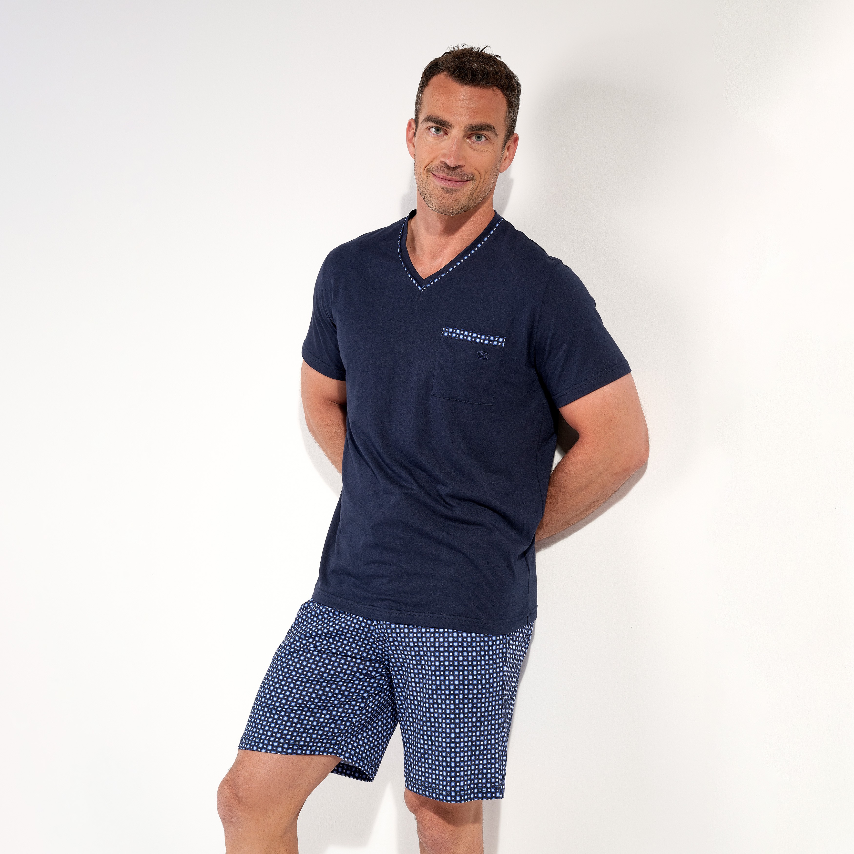 Die kurzen Herrenpyjamas der Hampton verkörpern den Luxus puren Komforts. Hergestellt aus modaler Baumwolle, bietet sie eine weiche und seidige Textur, die zu jeder Jahreszeit angenehm auf der Haut ist. Dieses Herren-Loungewear-Set besteht aus zwei Teilen: einem langärmligen V-Ausschnitt-T-Shirt mit kontrastierenden Paspeln und HOM-Stickerei, dezenten Details, die die Sorgfalt jedes Finishes unterstreichen, sowie sehr bequemen, fließenden Hosen. Stilistisch ist das Pyjamaoberteil ein schlichtes Mitternachtsblau und das Unterteil ein geometrischer Mikrodruck. Nehmen Sie diese langen Pyjamas für Männer an und kombinieren Sie Komfort mit einem lässigen, schicken Look für Ihre Abende und Ihre entspannten Momente zu Hause.