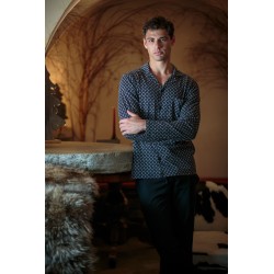 Der VINCE Herren-Pyjama besteht aus einem Top mit Knöpfen und langen Ärmeln auf einer Hose aus Baumwoll-Jersey. Sein geometrischer Druck besteht aus einer Basis aus kleinen grauen und weißen Blüten auf schwarzem Hintergrund. Diese Details entfalten sich auf dem gesamten Pyjama-Oberteil mit dem HOM-Logo in Stickerei, Herzseite, der Pyjama-Unterteil wurde in dunklem Kontrast gestaltet, schwarz, uni, er betont die Ästhetik des Pyjama-Oberteils.