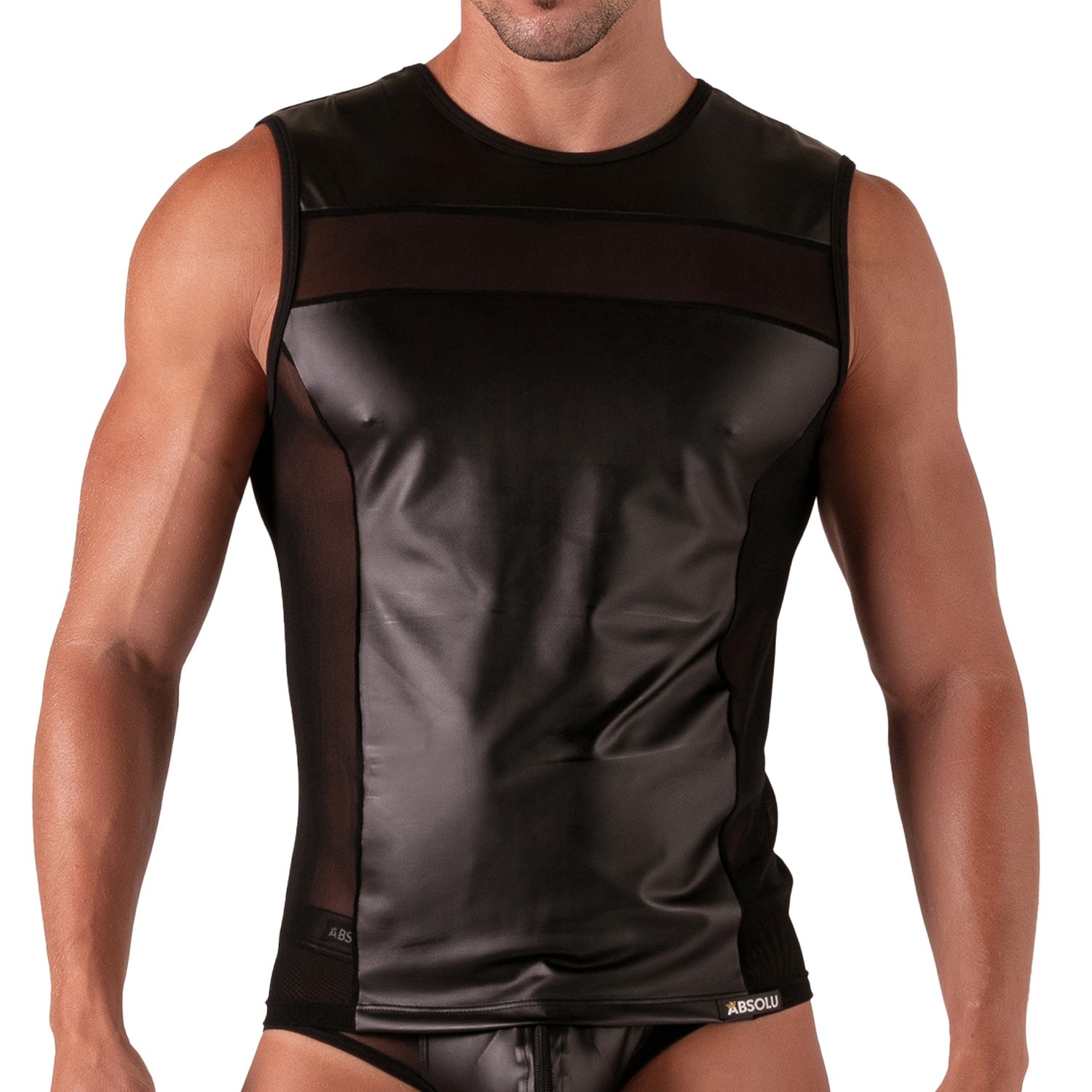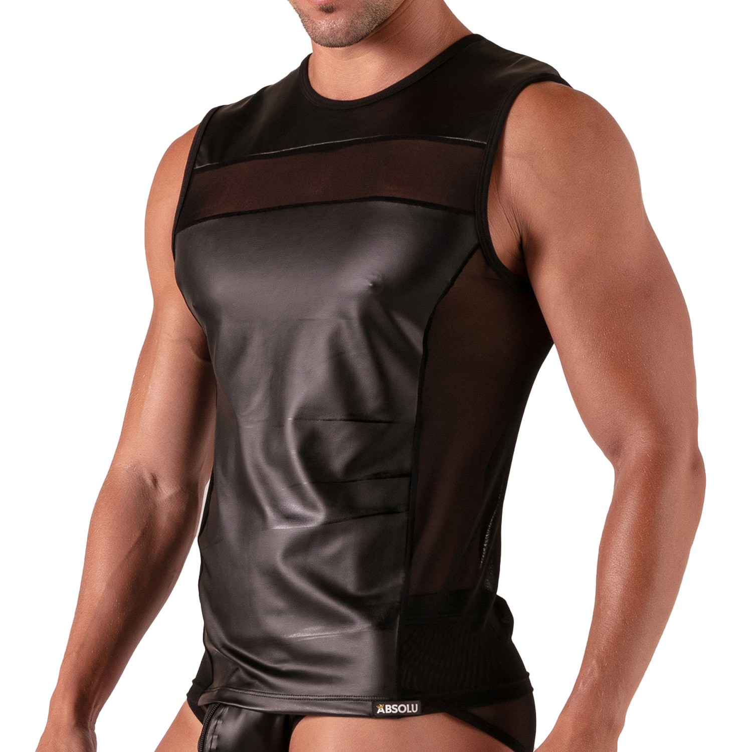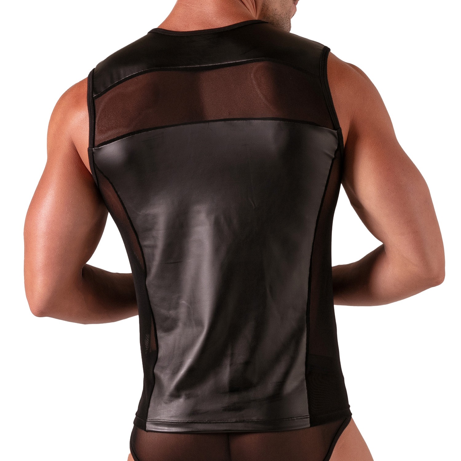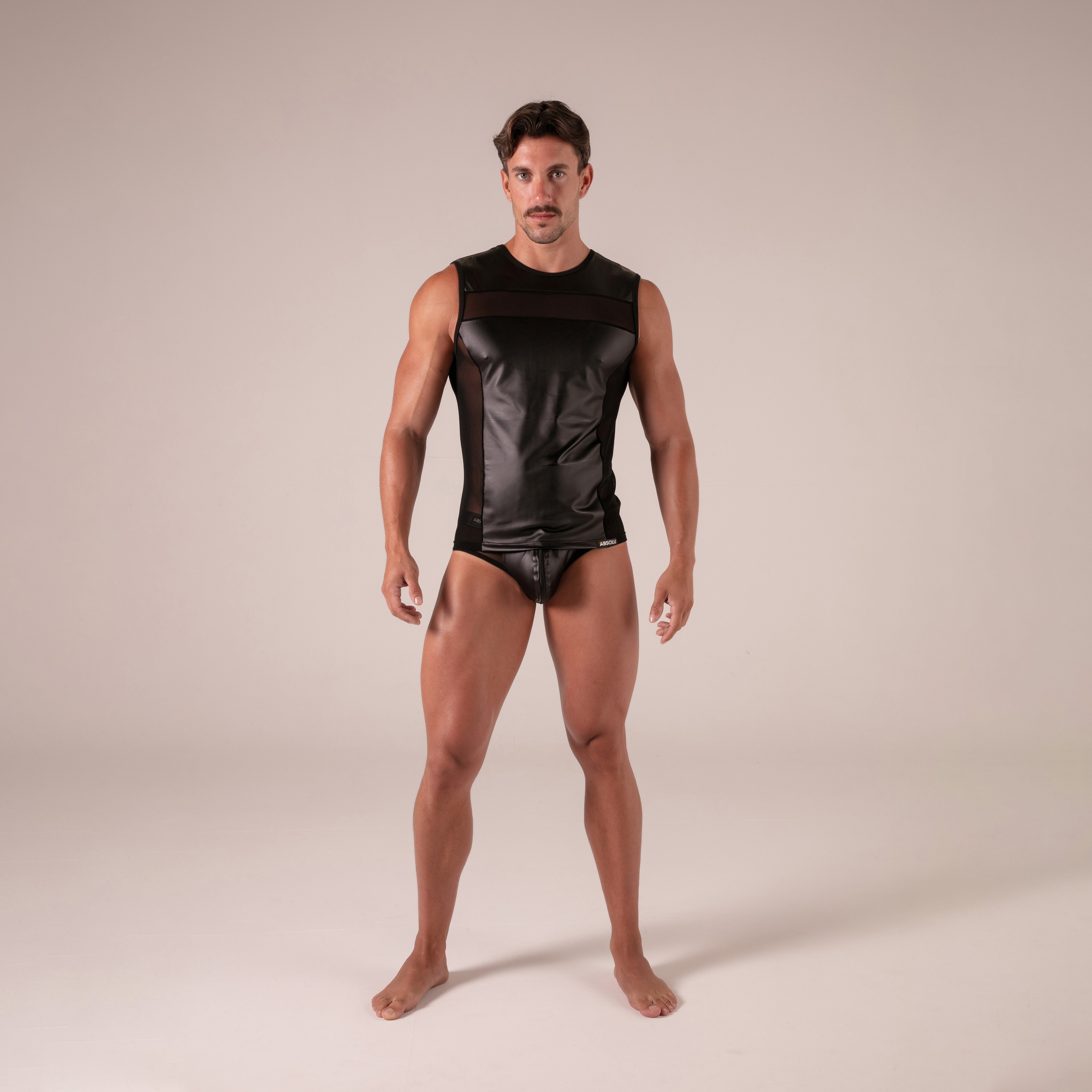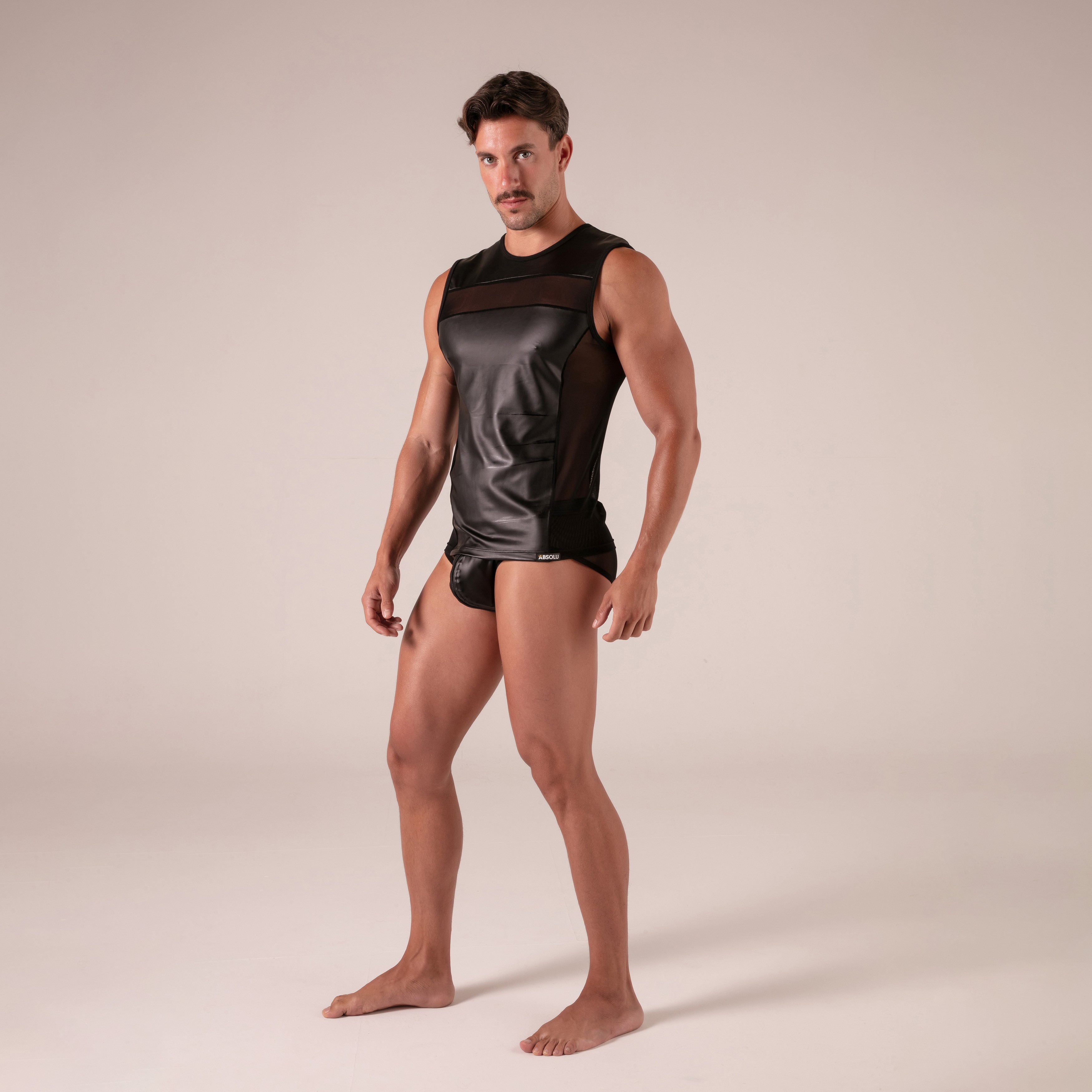 Le débardeur Rebel se distingue par son design unique, alliant un simili cuir noir mat à des empiècements en mesh transparent.