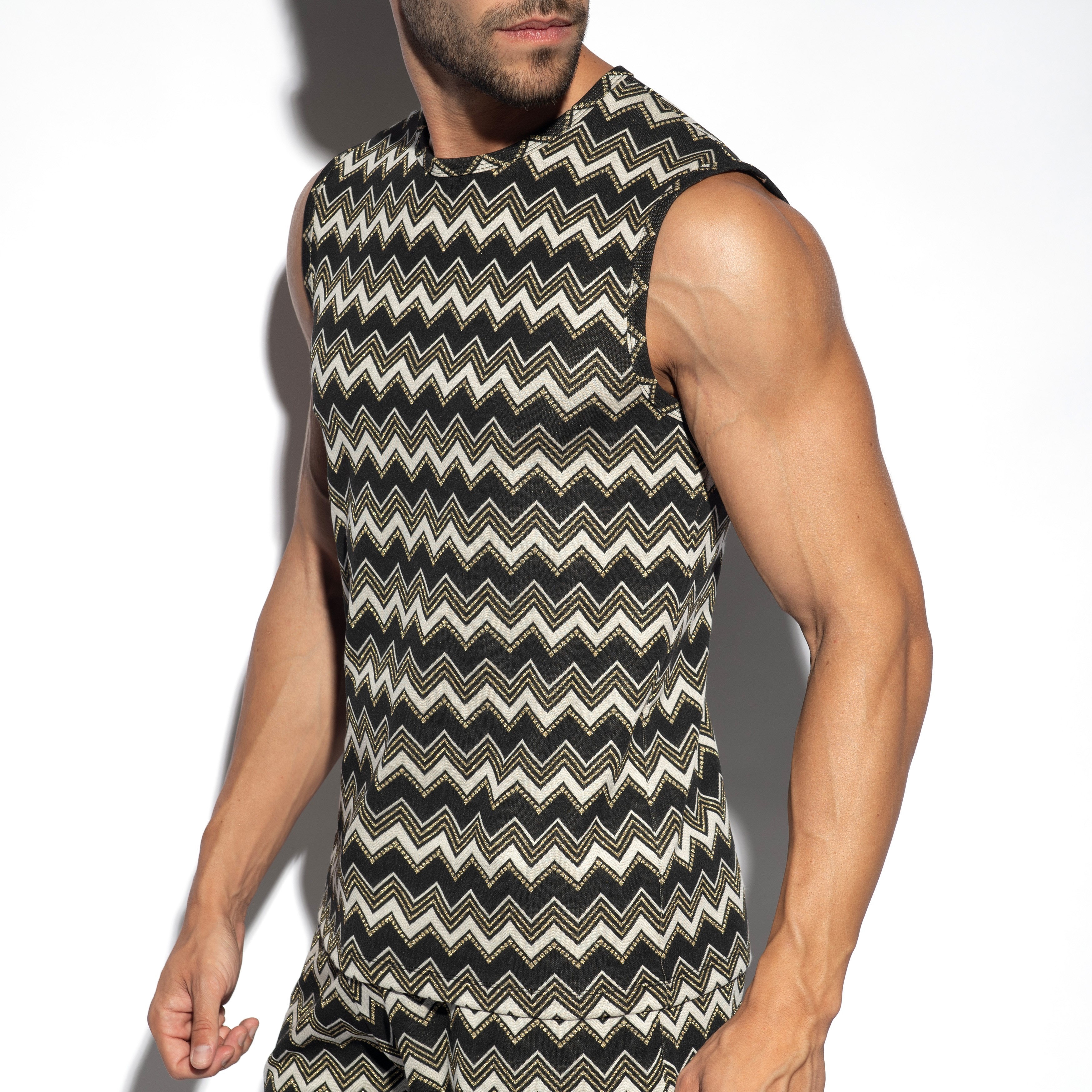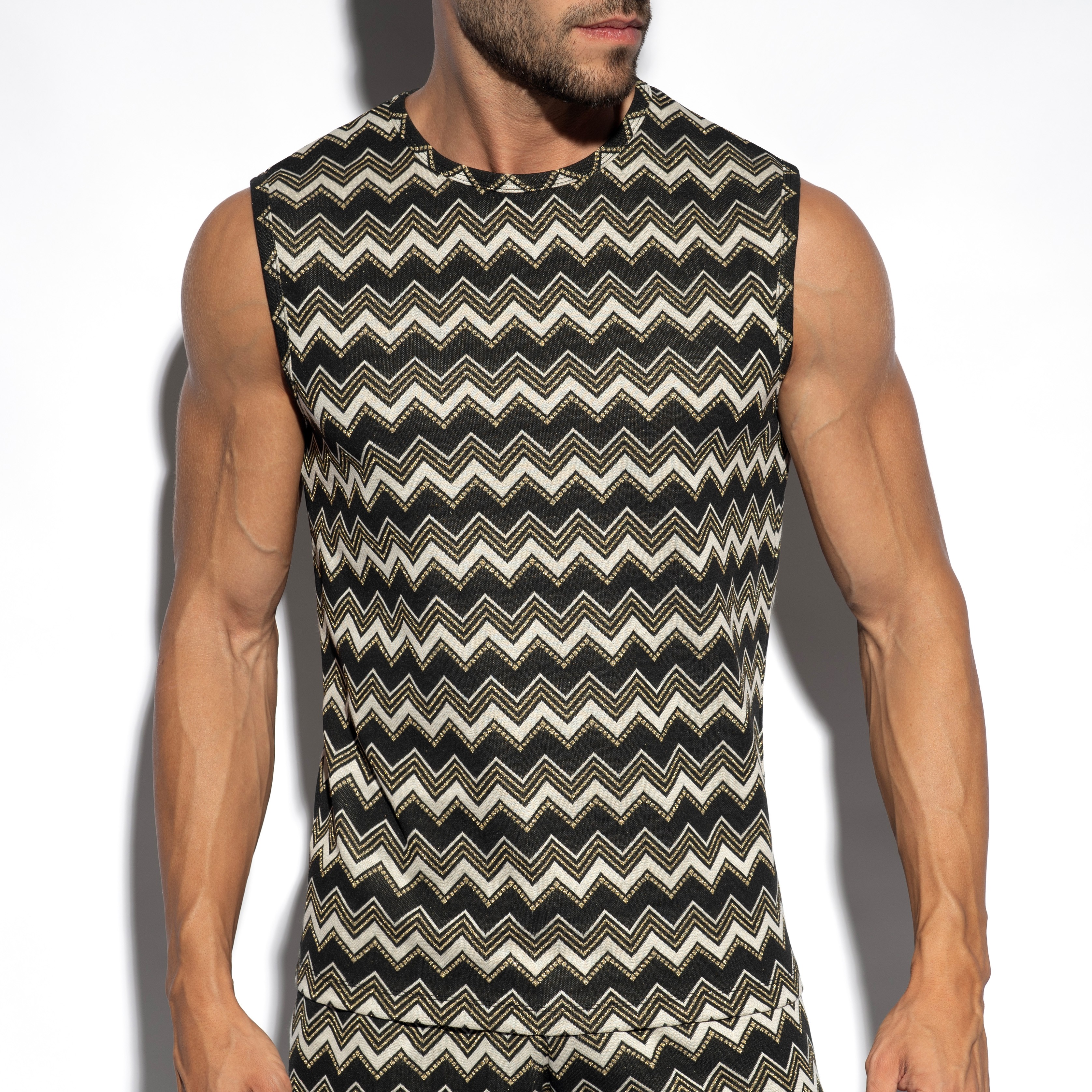 Casual de la corona. ¡Porque te mereces una corona! Estos son artículos cotidianos ocasionales que se elevan a un nivel aristocrático. Una camiseta sin mangas que no se parece en nada a la típica y aburrida camiseta de tirantes - con una exquisita estética clásica entrelazada con hilos metálicos dorados. La tela tiene un fuerte patrón ondulado con líneas doradas sólidas y un diseño de minibloque en todas partes, lo que aporta un nuevo nivel de clase a tu guardarropa diario. Brilla y brilla tanto que parece que estuvieras vestido en un castillo elegante: simplemente brillando con cada movimiento. La hermosa tela de estilo más grueso tiene un efecto súper elástico, lo que permite un ajuste perfecto mientras brilla con hilos dorados adicionales ocultos bajo los colores de rayas alternas.
