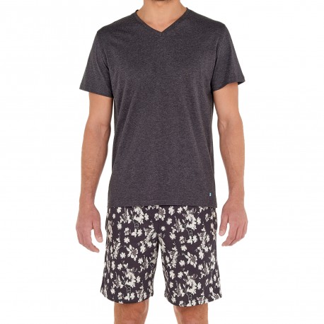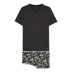 El pijama para hombres TAMBO es un pijama corto de dos piezas, camiseta de manga corta y pantalones cortos largos, de algodón, de punto jersey. El estilo de este pijama es selecto y original, fruto de la creatividad de los estilistas de la Maison HOM. El estampado de moda de los shorts largos presenta una sobreimpresión de flores grises sobre un fondo antracita, para un efecto tan poético como elegante. El top de pijama ha sido pensado en contraste, sobrio, liso y de color gris oscuro.
