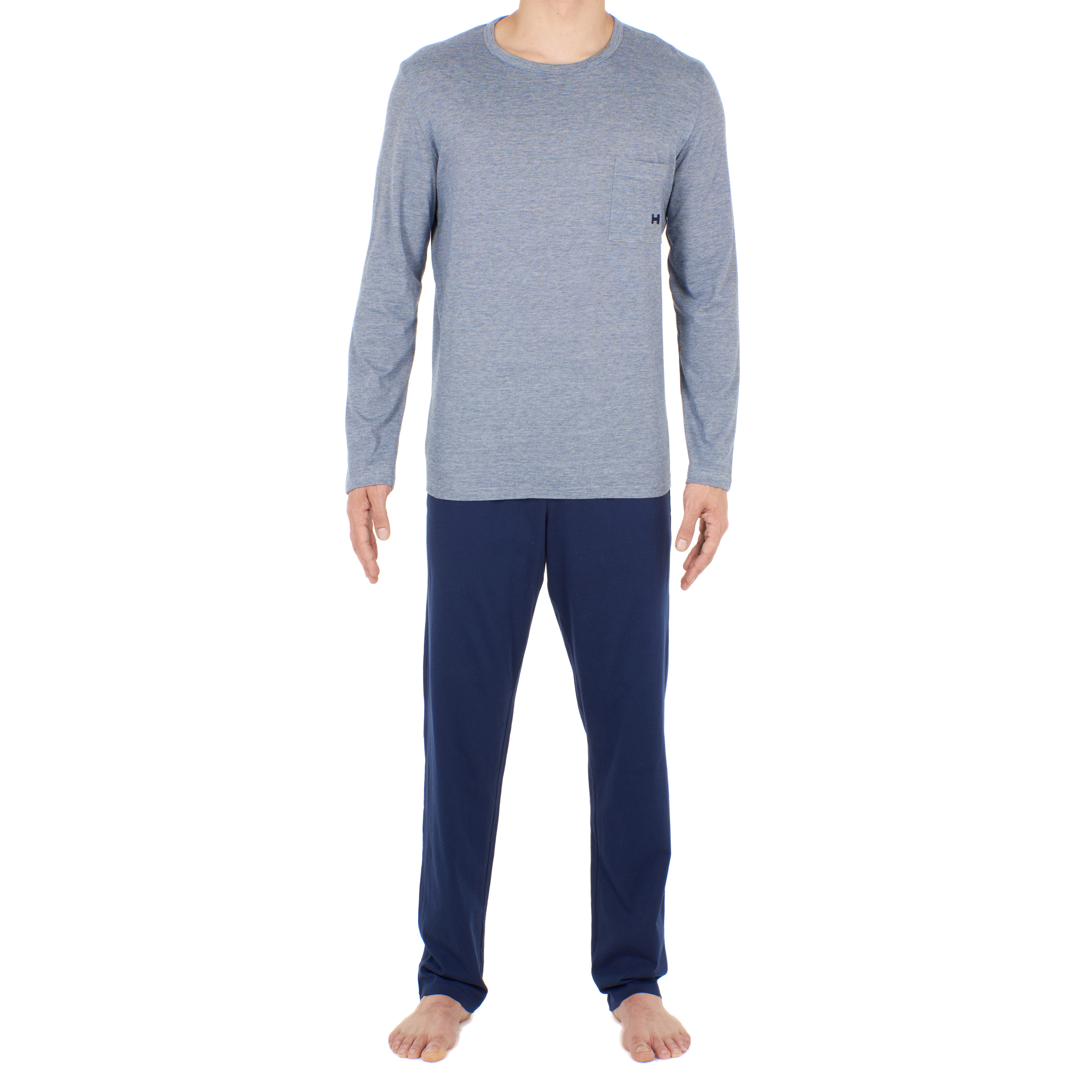 El pijama largo COMFORT HOM es un pijama de hombre en color azul marino y gris marino de algodón liso Jersey. Consiste en una camiseta de pijama de manga larga de cuello redondo y pantalón a juego.