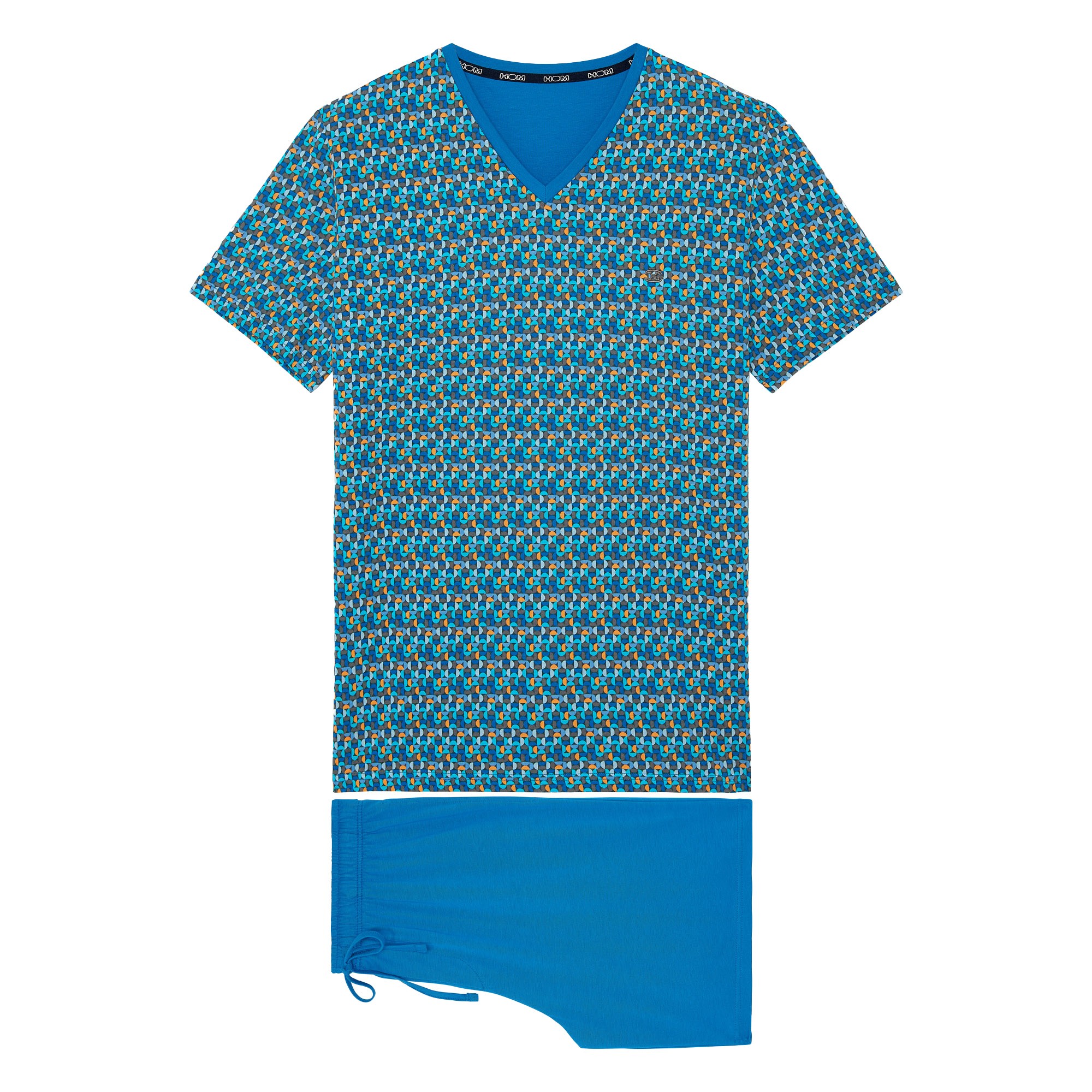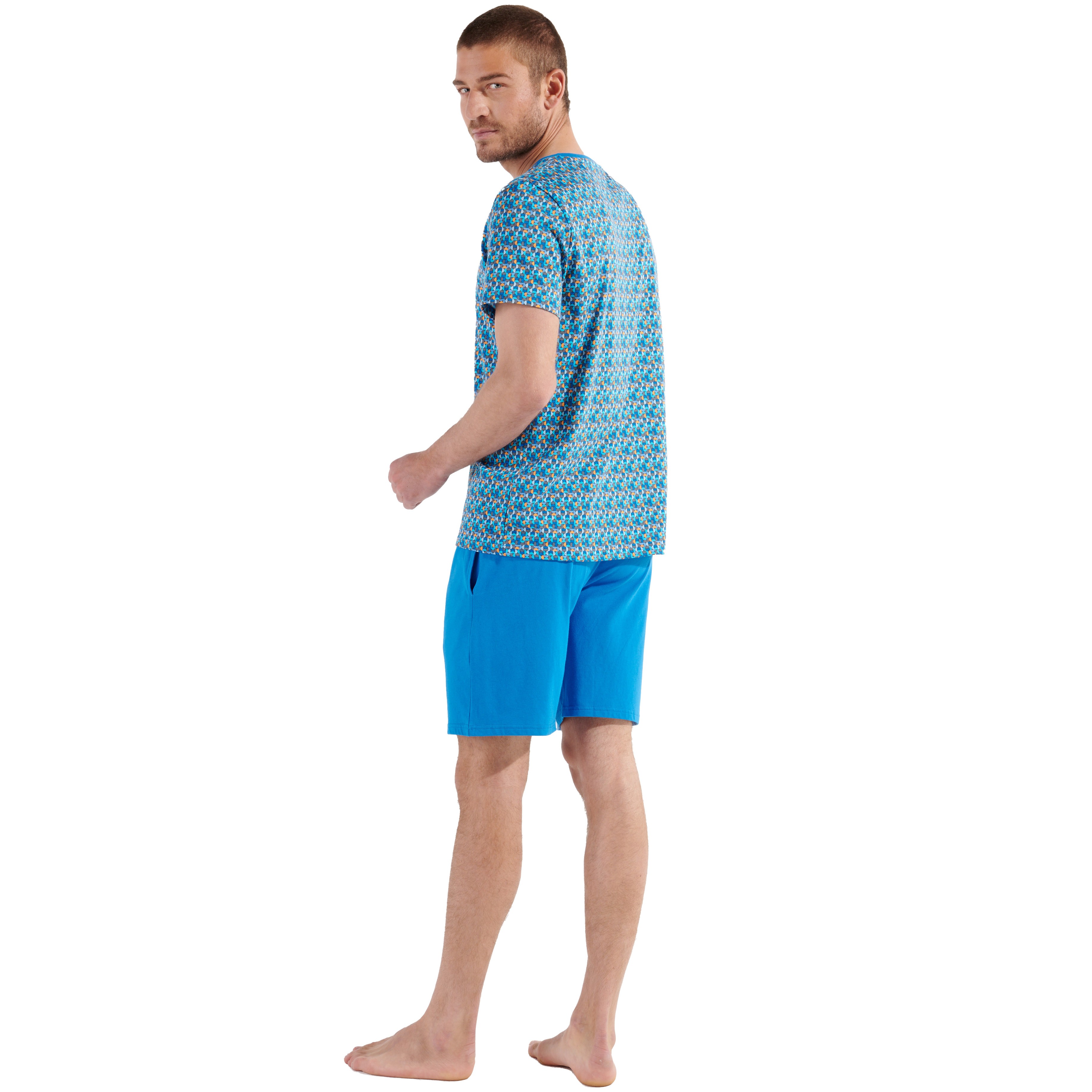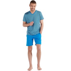 El pijama de hombre RALPHY es 100% pijama corto algodón. Su estampado de mosaico se compone con diferentes tonalidades de azul, desde gris y naranja.