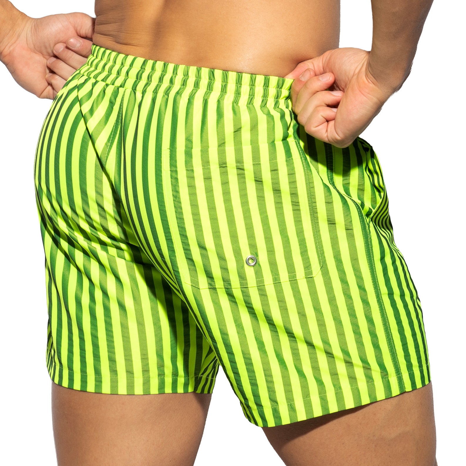 Líneas de brillo. Siente el pulso neón del verano con estos audaces pantalones cortos de baño de rayas - perfectos para tu próxima vagaytion eléctrica. Colores brillantes - casi luminiscentes - impresionantes con rayas alternas por todo el - en un tejido bellamente suave. Fabricado con tecnología U-Shape: un bolsillo interior de malla que guarda, reconforta y sostiene tu hombría - todo se mantiene levantado y seguro con el volumen que quieres mostrar. Cinturilla elástica con dos tiras exteriores - , cada una con sujetadores metálicos - para un ajuste perfecto. Dos bolsillos delanteros y uno trasero con ojal metálico para eliminar el agua.