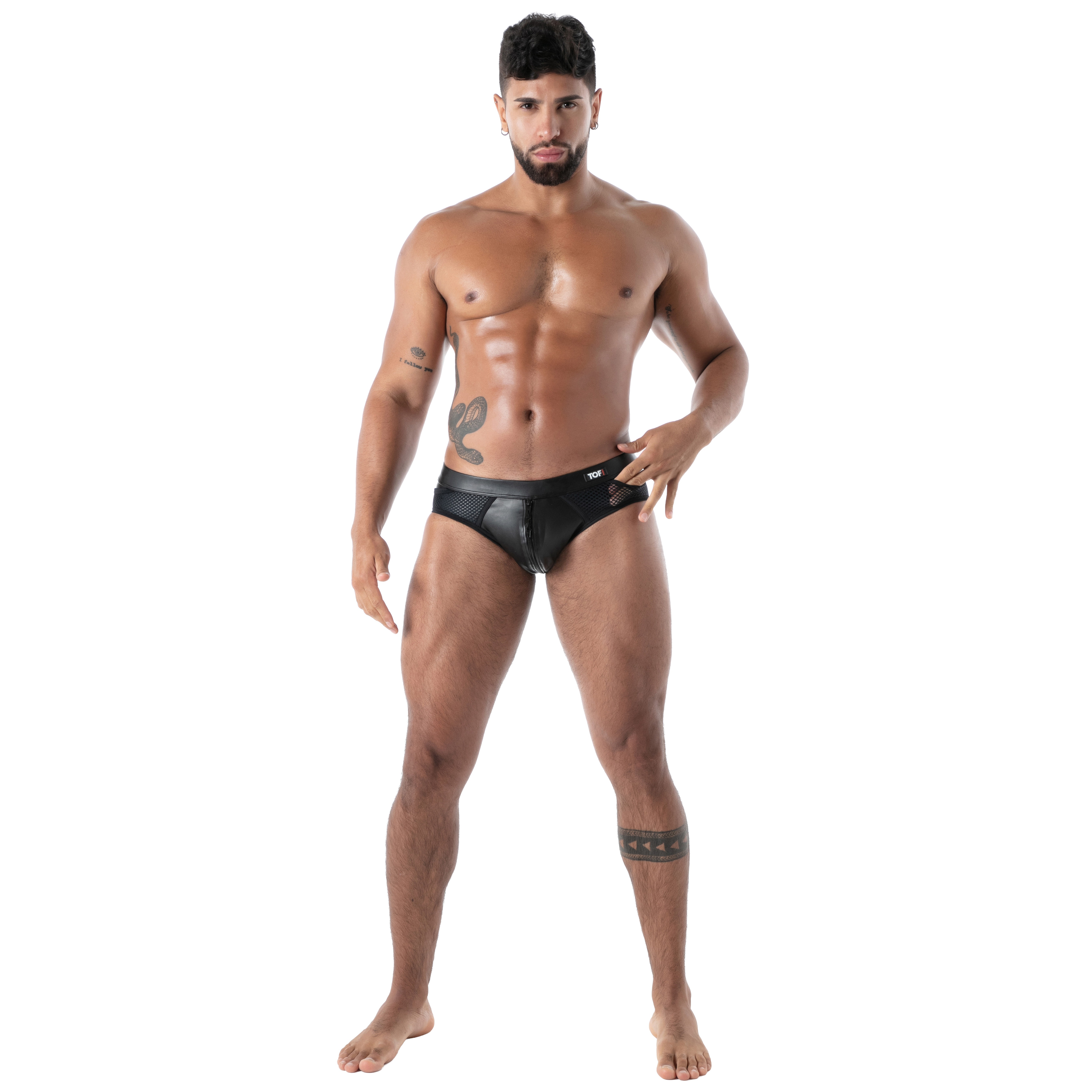 "These full-body zipped briefs are a technical and aesthetic jewel. It perfectly embodies the DNA of TOF: bold, graphic, and modular. The triple slider system allows for hyper-precise opening play. It's a must-have in any sexy or fetish wardrobe.