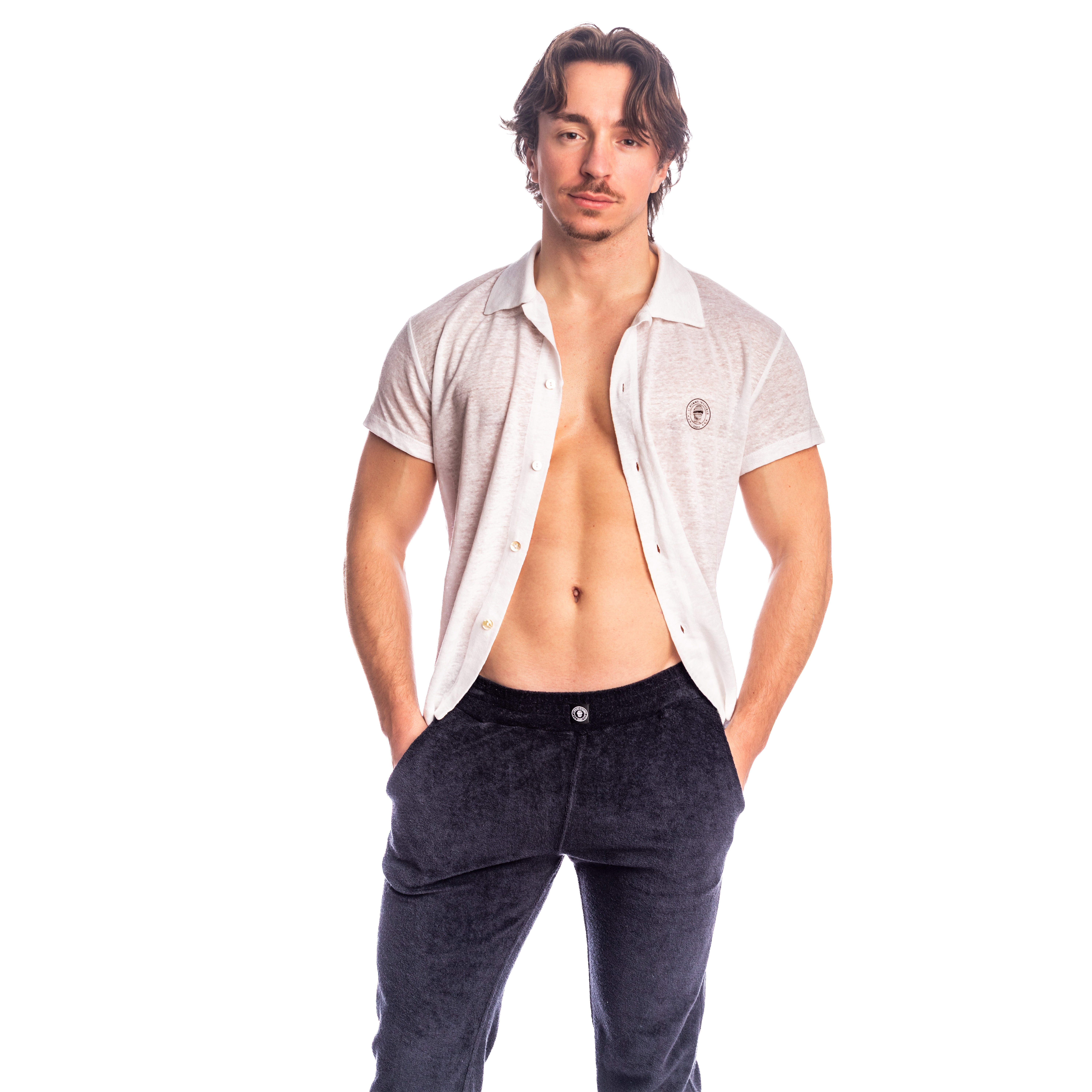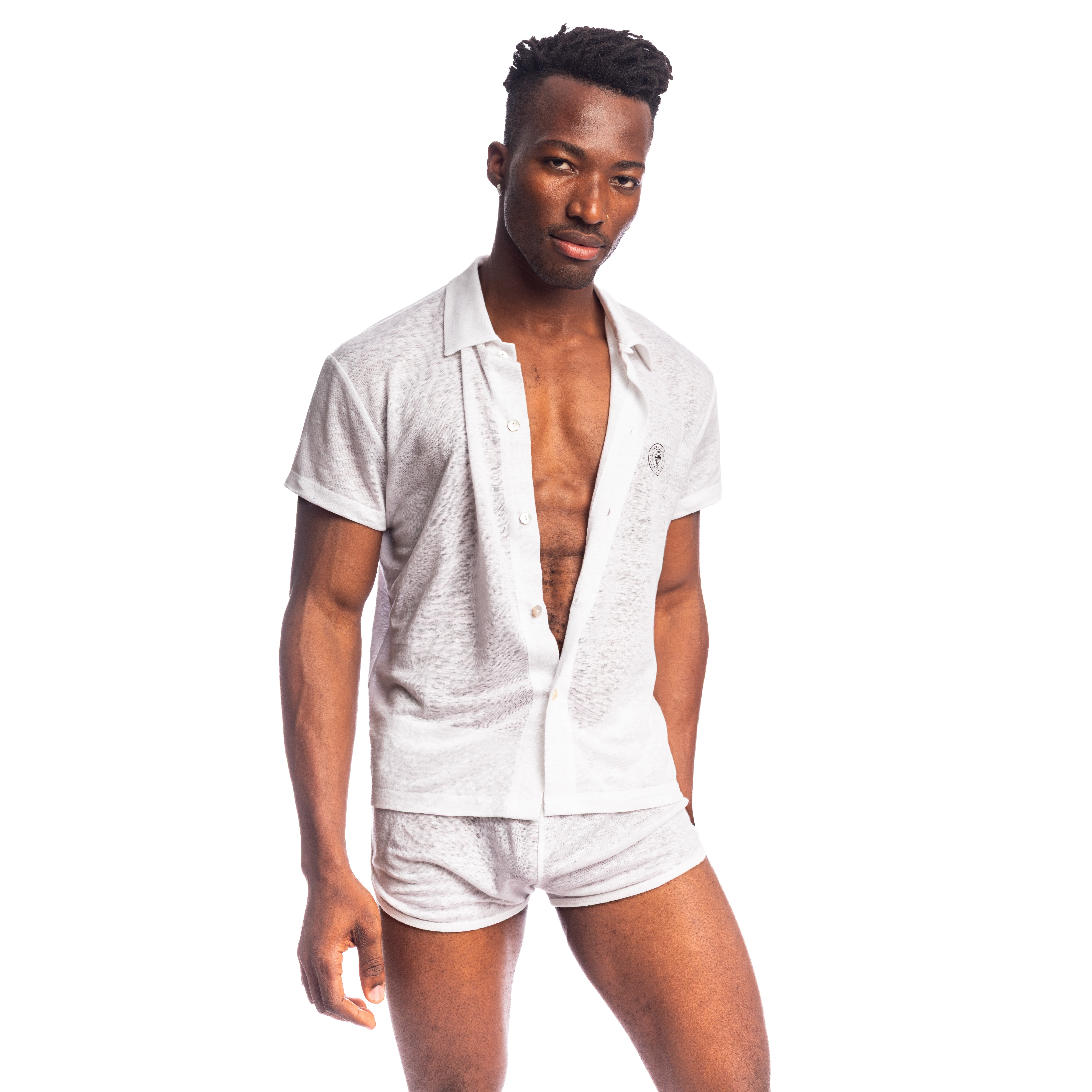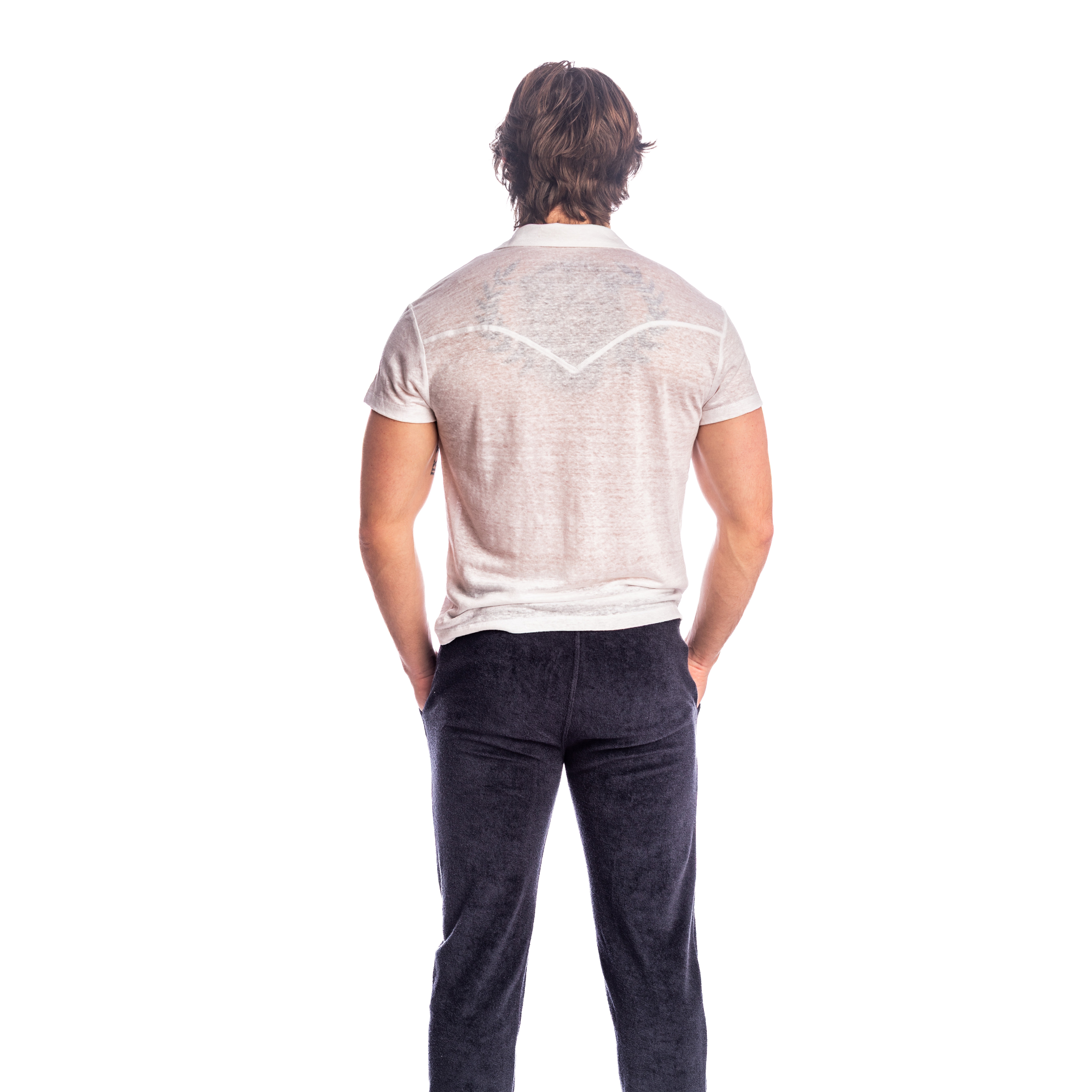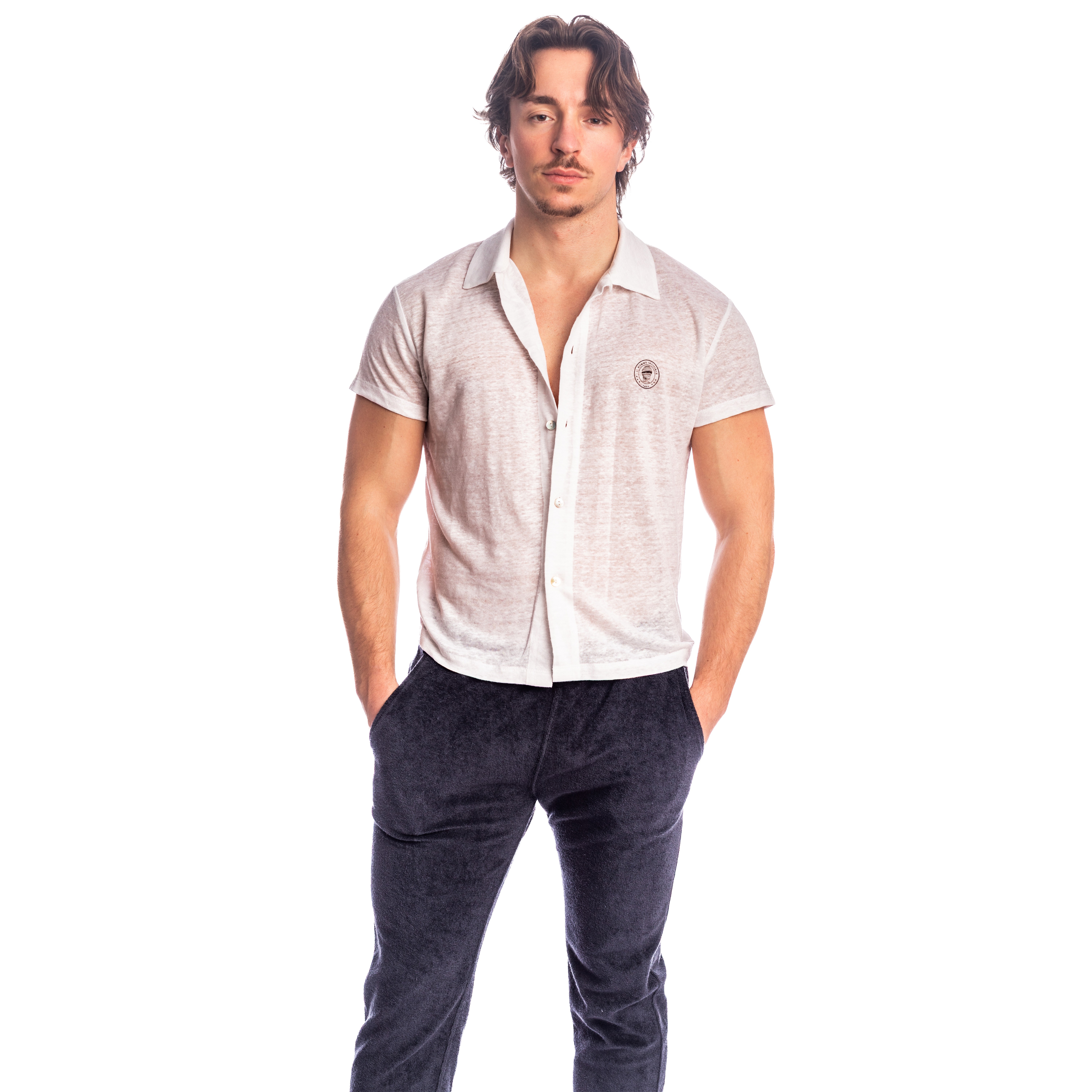Linen, a noble and living material, seduces with its fresh touch and natural drape. It lets the skin breathe and evolves with movement, creating a free and elegant look. The cropped fit reinforces its contemporary feel and makes it easy to wear with shorts or summer pants.