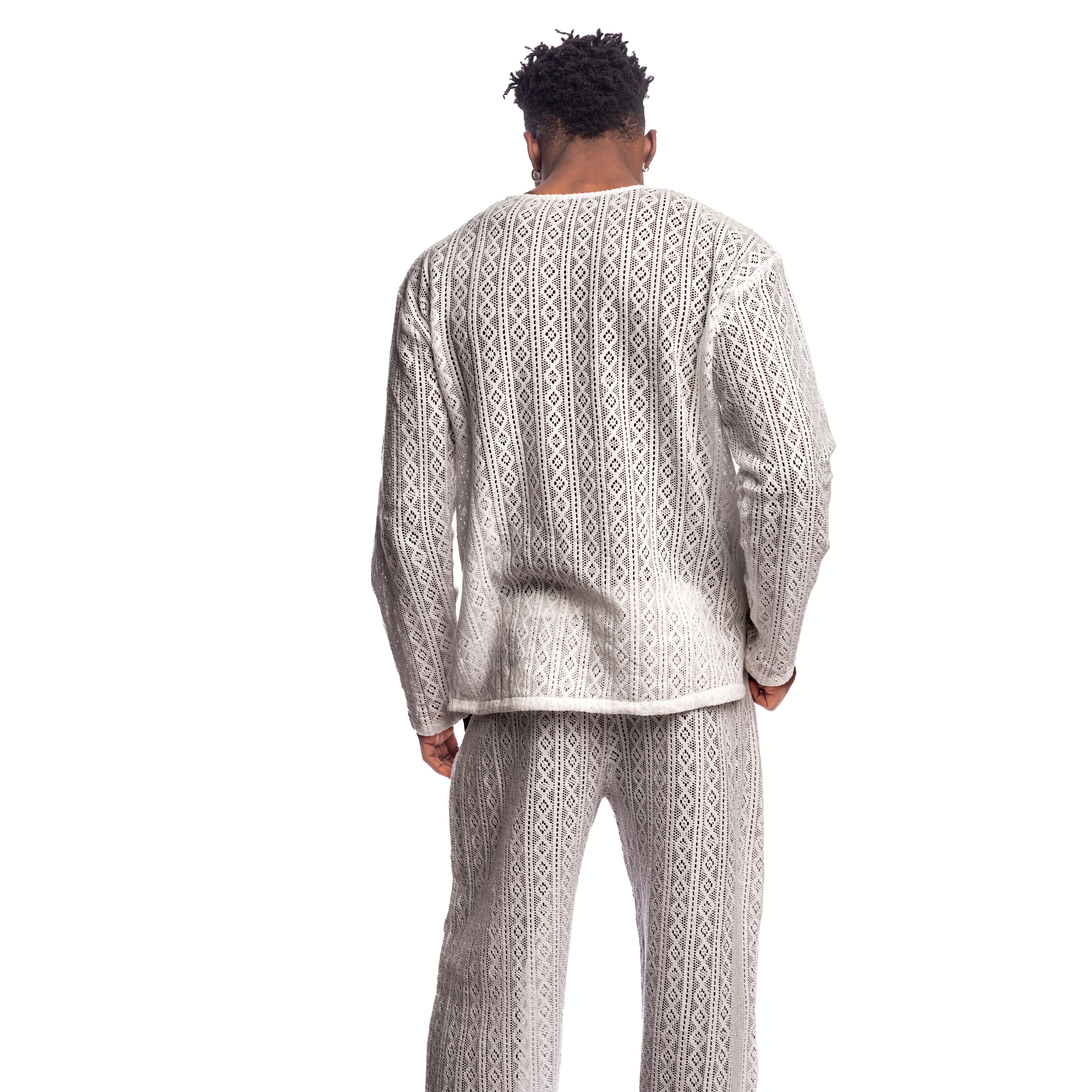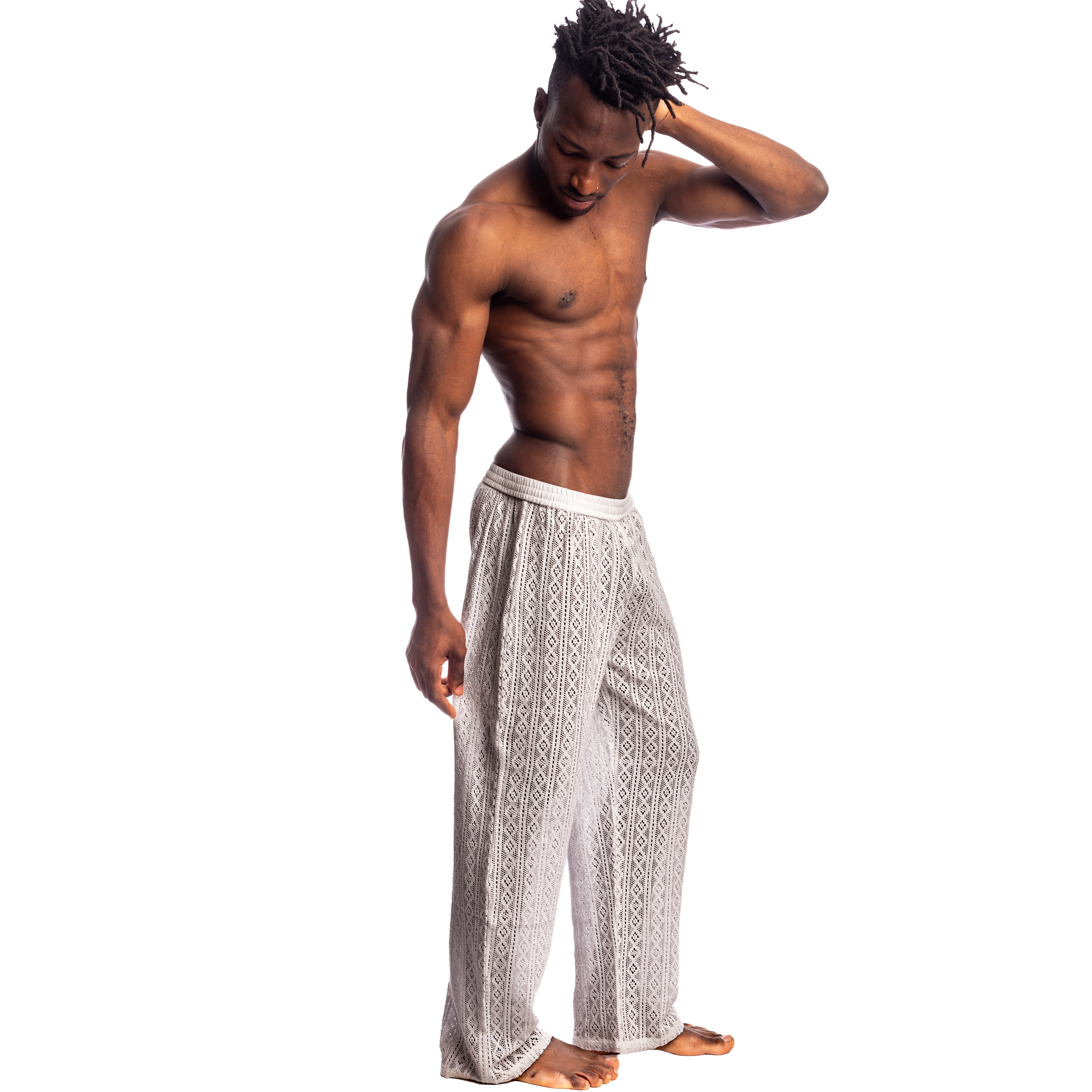 The NIREO trousers in white crochet embody natural, textured elegance. Made from an openwork knit with geometric patterns of intertwined diamonds, it lets air circulate and offers a feeling of lightness ideal for summer.