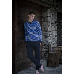 Men's pajamas DON is a Set composed of a top sweatshirt style and pants with finishes jogging. Made of interlock knitted cotton, its look is based on the Combination of black, blue and white colours in the print of the Top highlighted by the plain black of the pajama bottoms. The pajama top is designed with long sleeves with black ends, like the collar round V Stitch, the HOM logo is present in embroidery, heart side. The bottom pajamas is a very comfortable pants to wear, it has a pocket on each side and a drawstring, very practical, at the belt.
