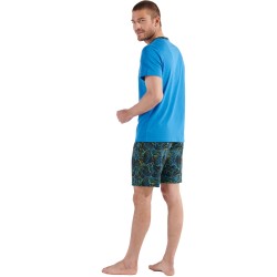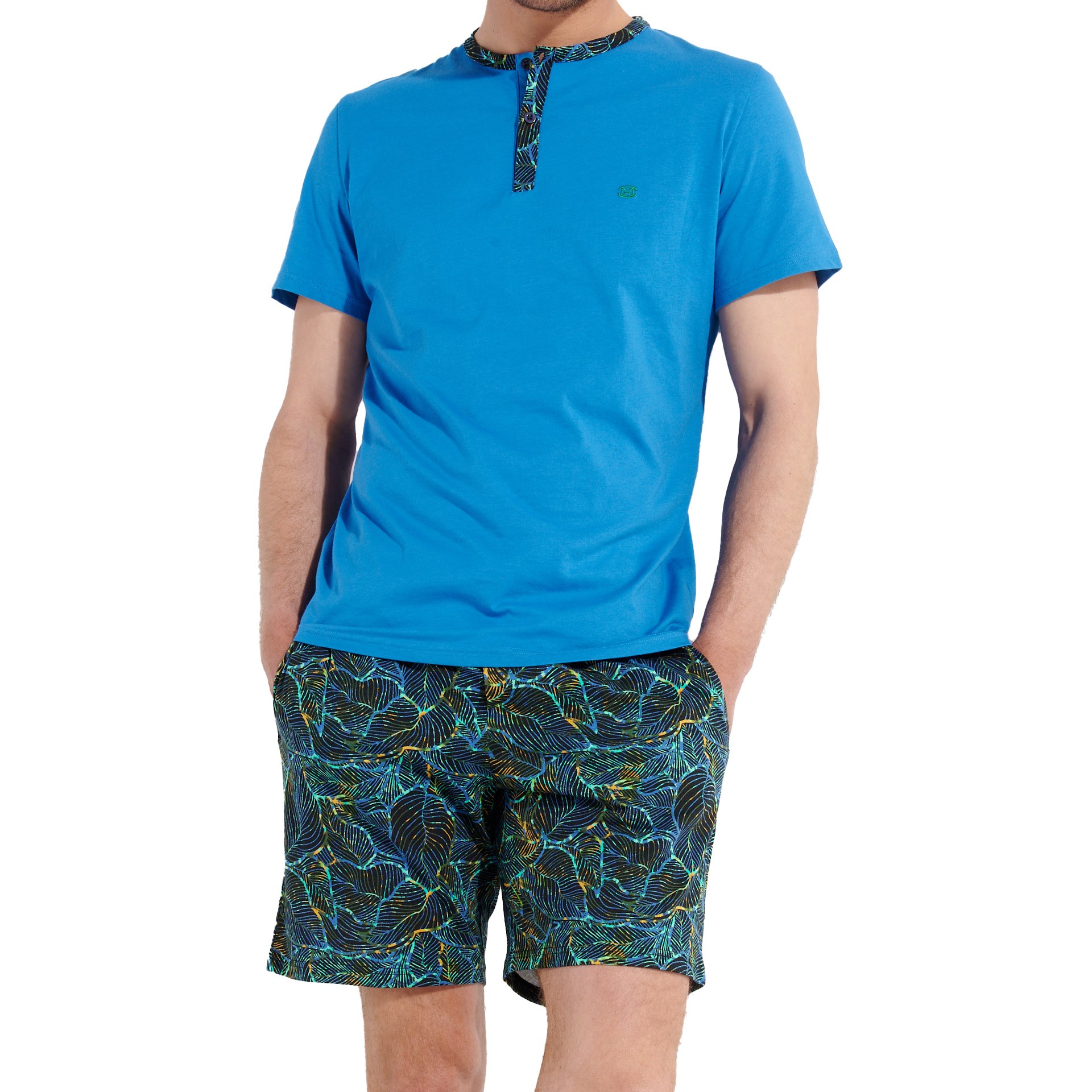 Men's pyjamas JARROD is a two-piece coordinate, made entirely of cotton, in jersey knit. It pairs a plain blue top with long shorts. Sound The print consists of plant motifs, broad ribbed leaves, blue and orange-yellow, on a black background. It is available throughout the pyjama bottoms, in direct contrast to the plain pyjama top, with a reminder of the patterns on the collar and buttonhole.