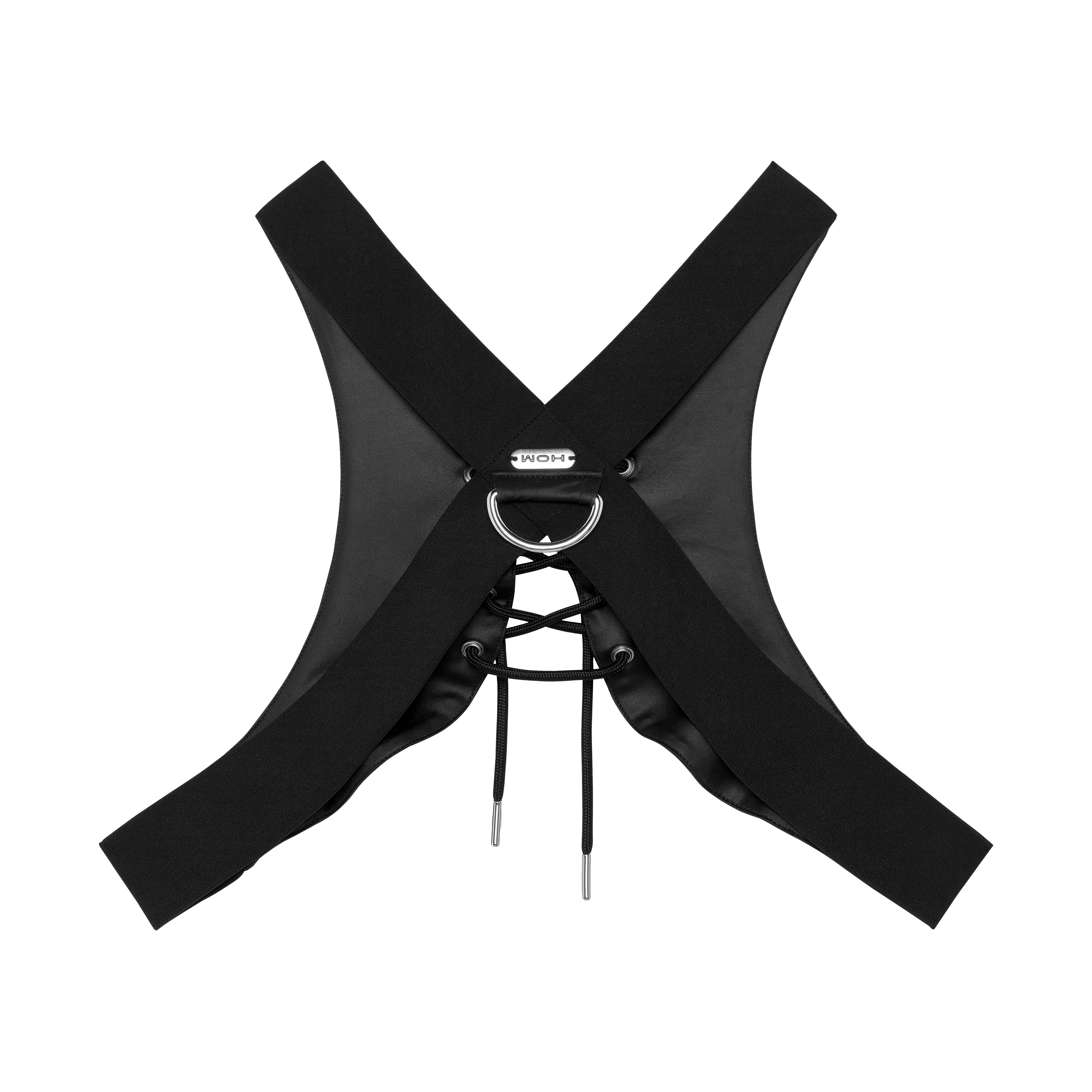 Doté d'un laçage façon corset à l'avant et de larges bandes élastiques formant un X dans le dos, ce harnais est à la fois confortable et ultra-coquin.