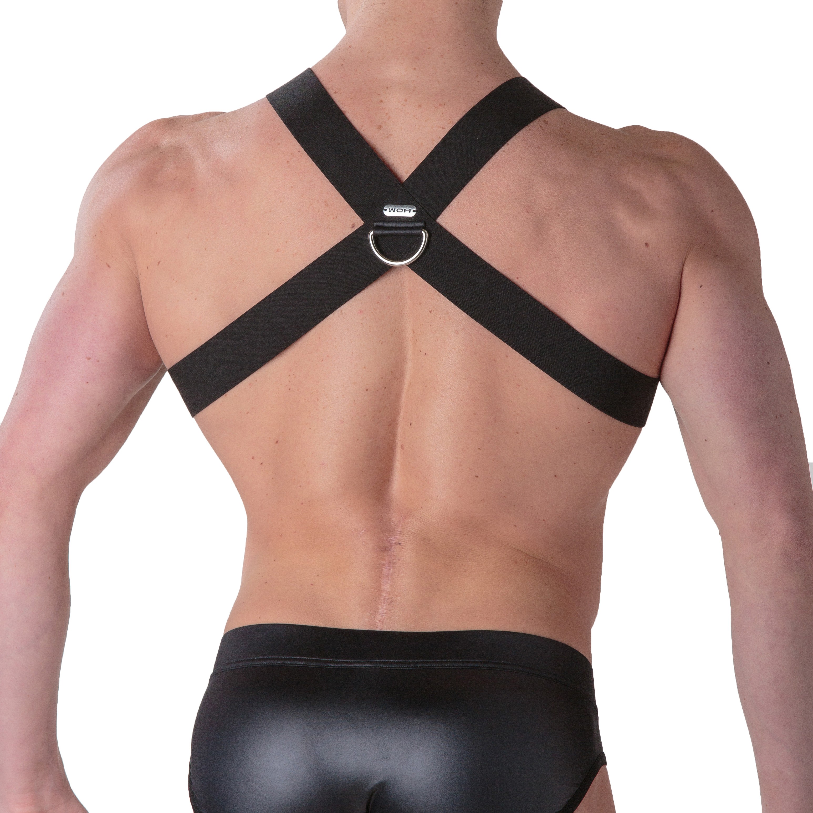 En vinyle effet cuir noir, ce harnais imite parfaitement le cuir pour un look incroyablement sensuel.