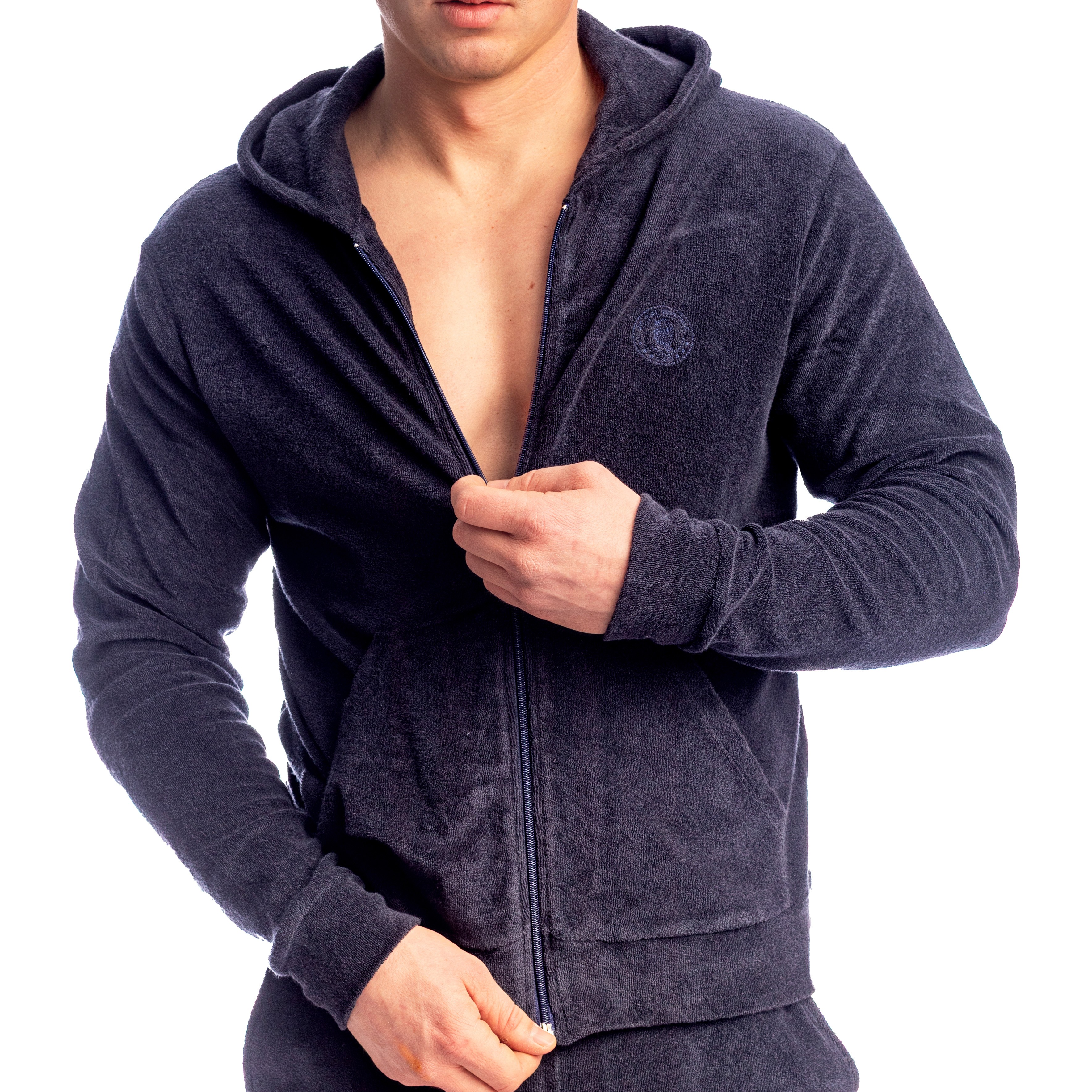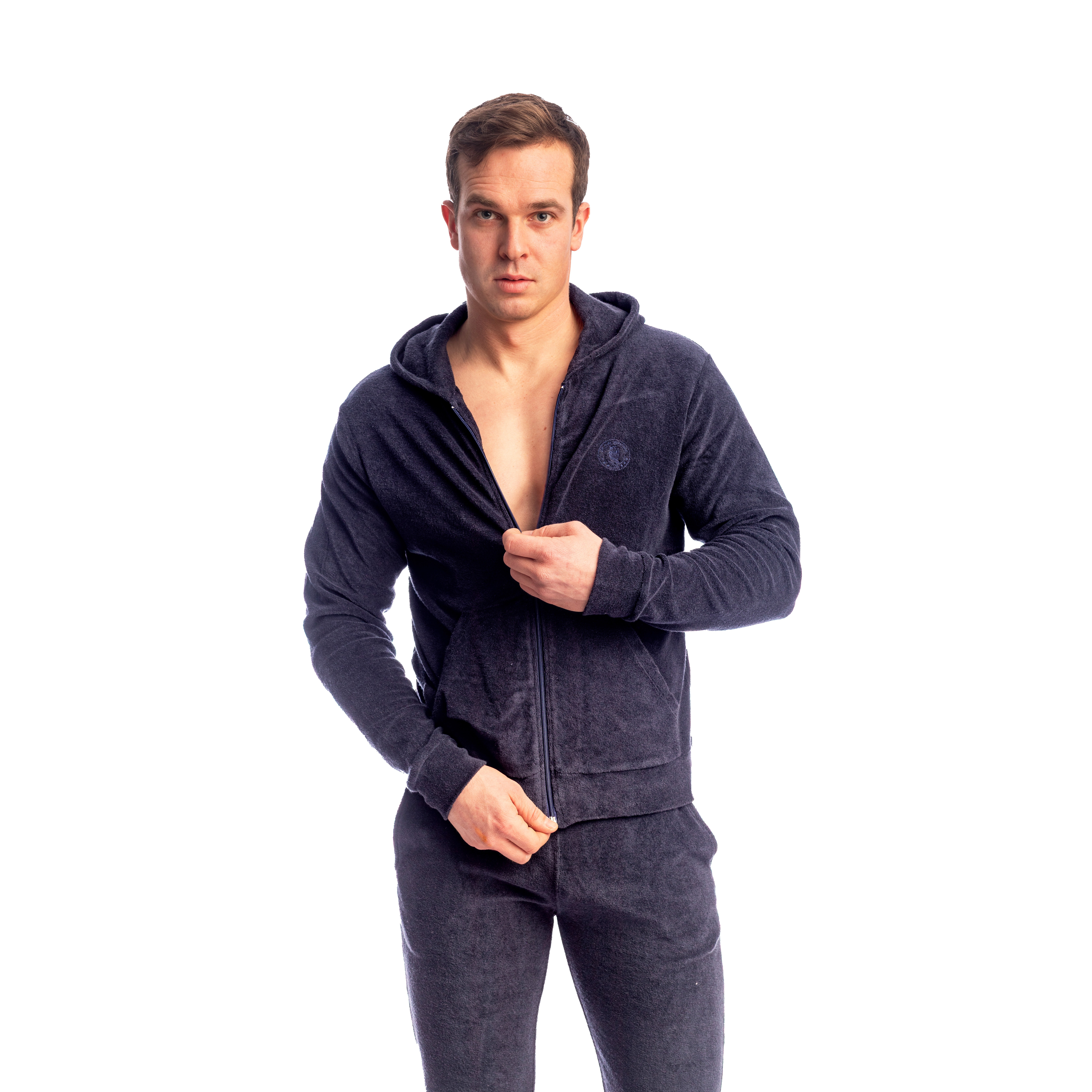 Sweat zippé à capuche en éponge navy, doux et raffiné. Coupe ajustée, double zip.