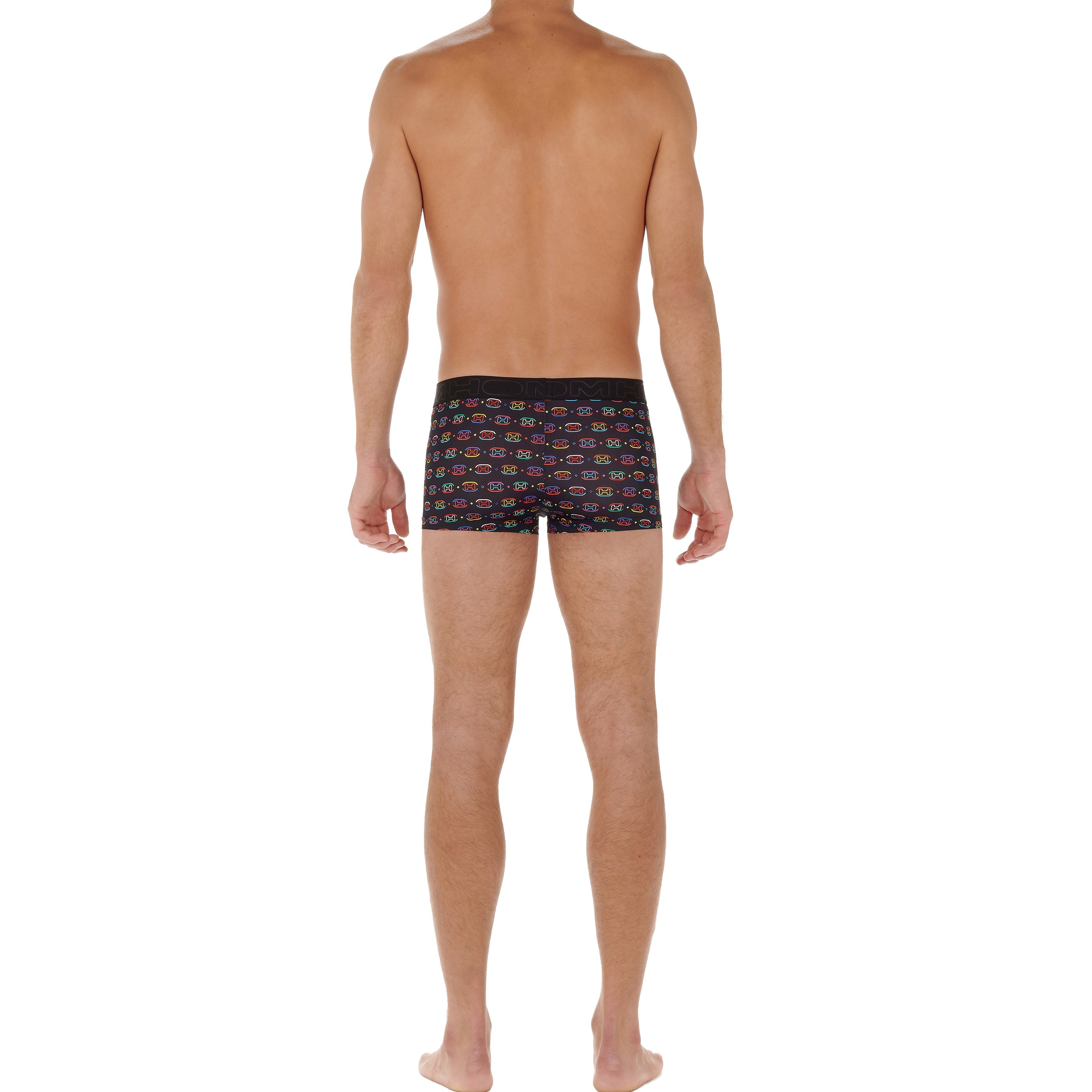 Il taglio di questo boxer è corto sulla coscia, più che per un boxer classico: si ferma sotto la linea dei glutei, ha anche una vita più bassa, conferendo così all'intimo un aspetto a fascia. La sua cintura elastica è in microfibra nera e presenta il logo HOM su tutta la larghezza della sua trama, è morbida all'interno e non si comprime.