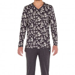 Il pigiama da uomo TAMBO è un pigiama corto di due pezzi, t-shirt a maniche corte e pantaloncini lunghi, in cotone, maglia jersey. Lo stile di questo pigiama è selezionato e originale, frutto della creatività degli stilisti della Maison HOM. La stampa fashion dei pantaloncini lunghi presenta una sovrastampa di fiori grigi su fondo antracite, per un effetto poetico ed elegante. Il top del pigiama è stato pensato in contrasto, sobrio, unito e di colore grigio scuro.