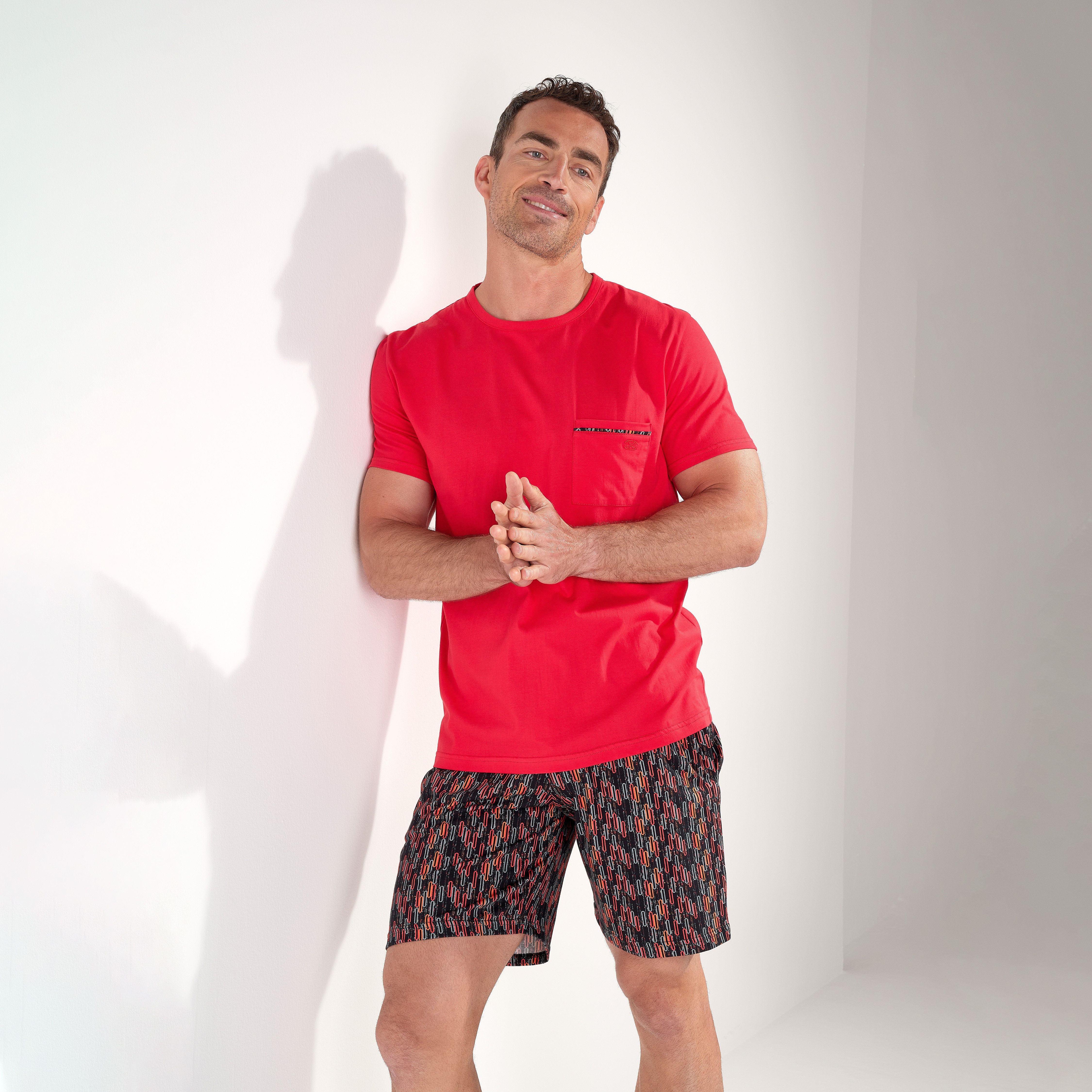 Il pigiama corto da uomo Westgate combina eleganza retrò con comfort naturale. Realizzato al 100% cotone, offre una sensazione morbida e leggera permettendo alla pelle di respirare liberamente. Questo set da casa da uomo è composto da 2 pezzi: pantaloncini fluenti e una maglietta a maniche corte con collo rotondo. I pantaloncini sono adornati con un motivo geometrico di affreschi in tonalità rosse, arancioni e grigie su uno sfondo nero, un omaggio all'arte geometrica degli anni '50. La semplice maglietta rossa è arricchita da una tasca a toppa con bordo a contrasto e da un ricamo tono-tonalità del logo HOM. Questi pigiami corti da uomo uniscono comfort ed eleganza: perfetti per notti tranquille o momenti rilassanti in uno stile chic e casual.