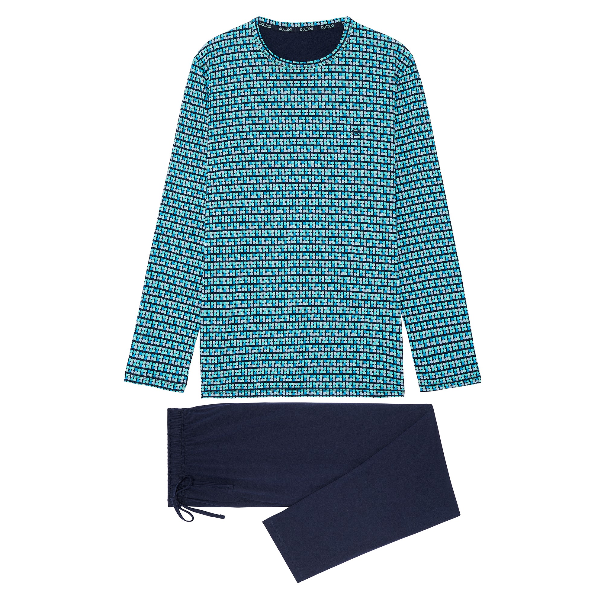 Il pigiama da uomo STAN è un coordinato t-shirt manica lunga e pantalone, in cotone, maglia jersey. Combinato con il taglio di questo modello, questo materiale offre una grande facilità di movimento. Visivamente, il motivo della trama del blues è piuttosto gioioso e rinfrescante. la stampa si sviluppa su tutta la maglia del pigiama e presenta il logo HOM in ricamo, lato cuore. Il design della parte superiore del pigiama è sottolineato dal contrasto fornito dai pantaloni del pigiama in tinta unita blu navy. I pantaloni sono molto comodi da indossare, hanno tasche laterali aperte e una pratica coulisse nella parte anteriore della cintura.