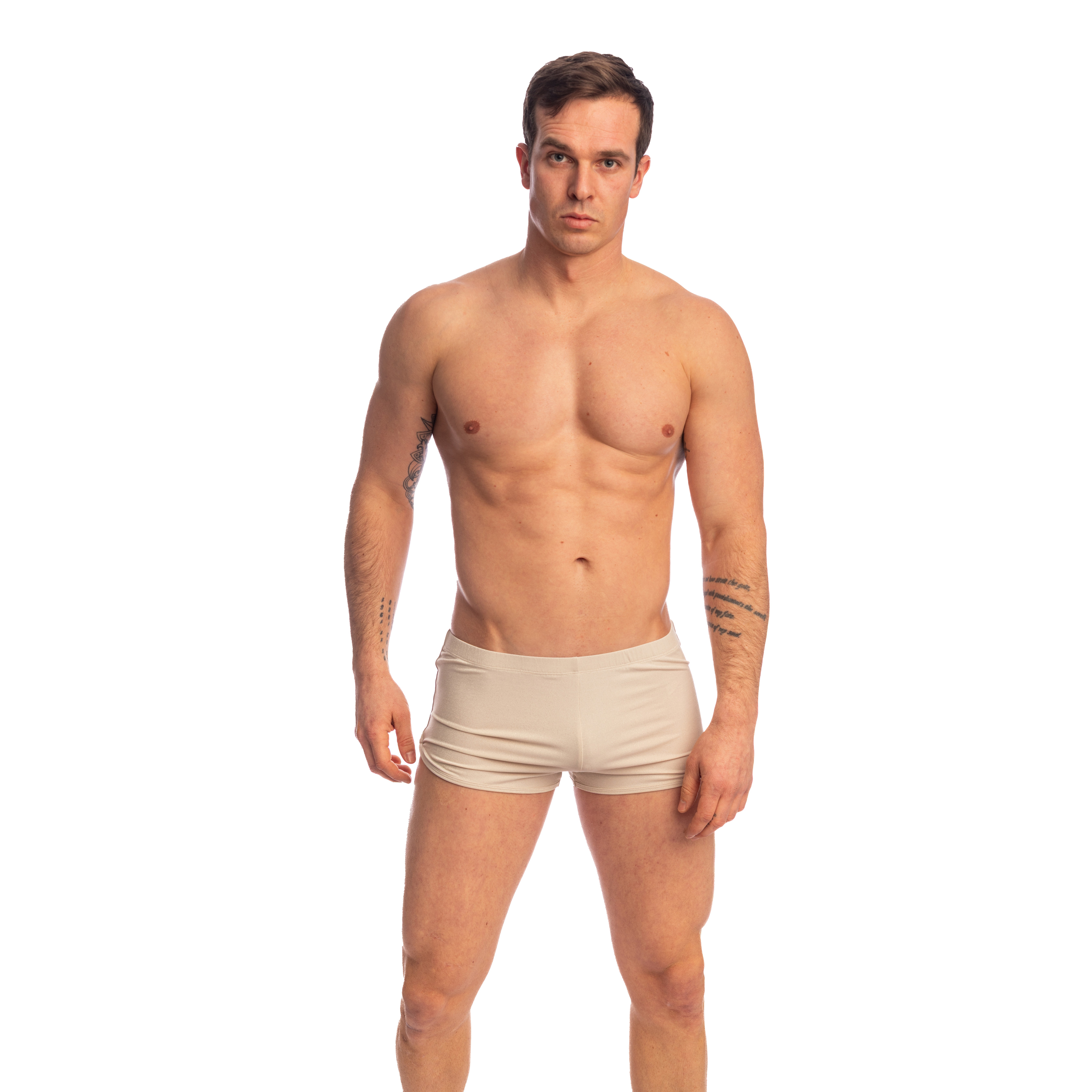 Pantaloncini maschili beige chic iridescenti, con un taglio fluido e sensuale.