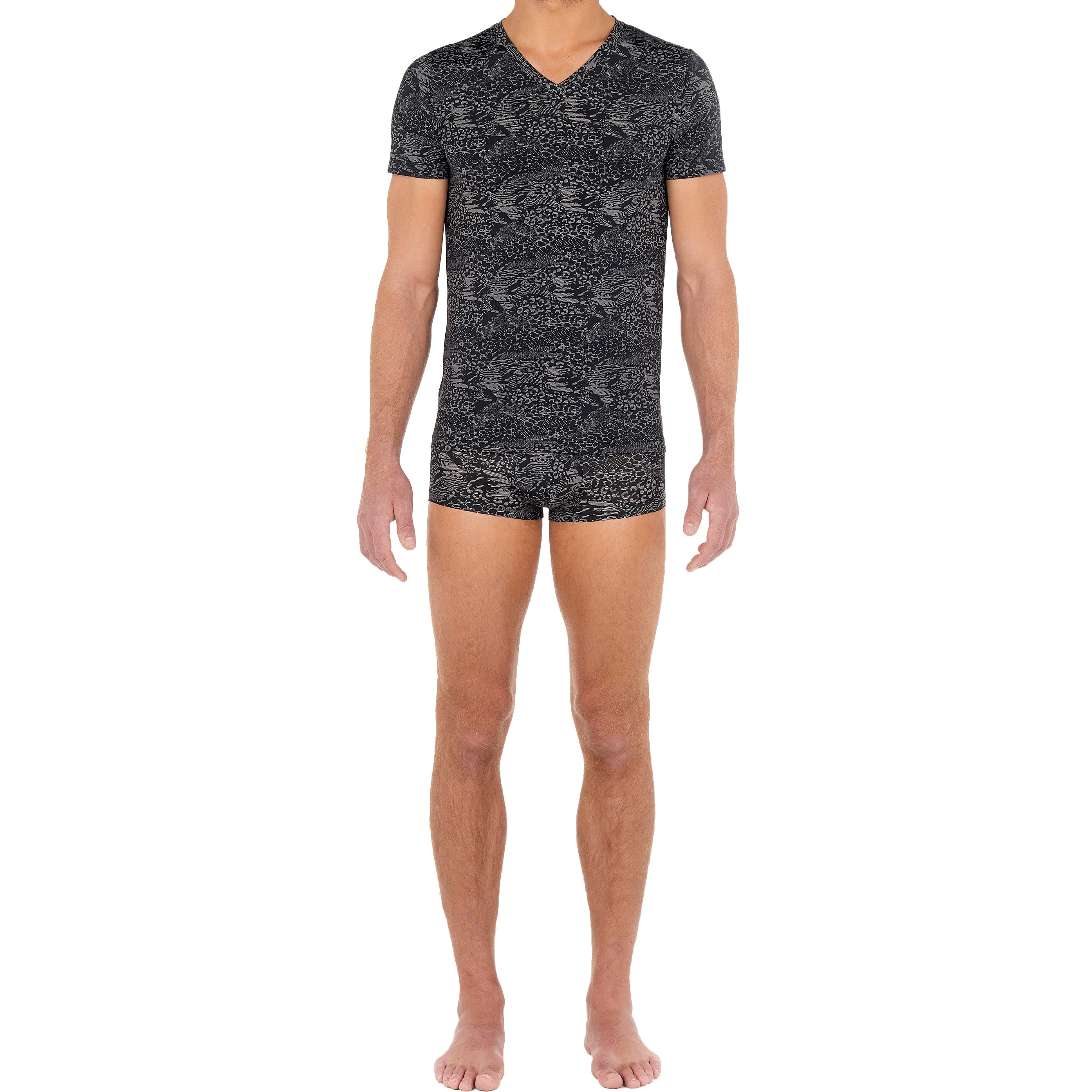 La T-shirt NAIROBI è una maglietta da uomo in microfibra. La sua stampa animale, nero e grigio, stile pizzo, coniuga i codici della seduzione. È una maglietta che evoca sia note selvagge che raffinatezza.