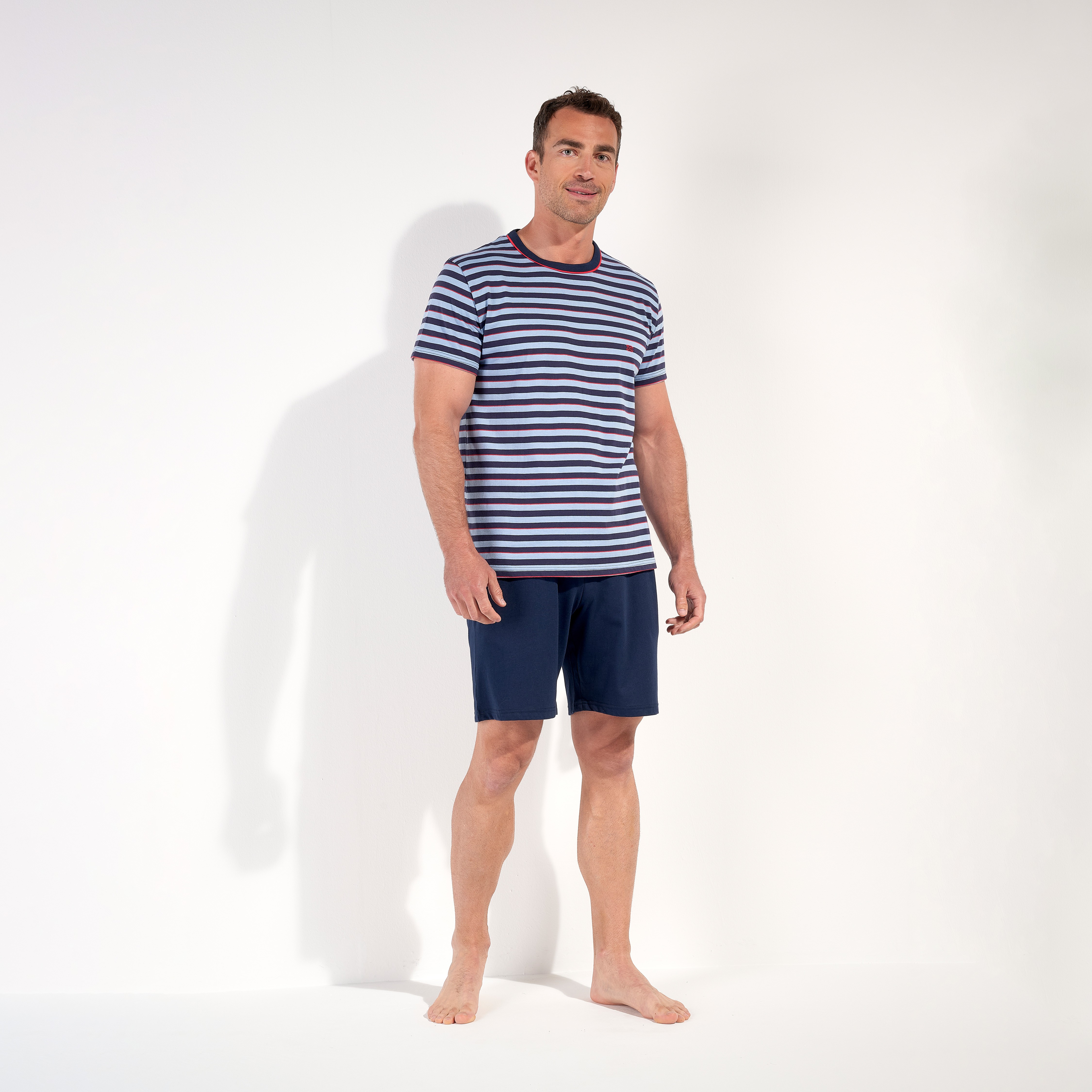 Son t-shirt aux rayures bleu et rouge, inspirées des horizons océaniques, évoque l’évasion et la fraîcheur des grandes traversées, tandis que le short assorti apporte une touche de décontraction parfaitement maîtrisée. L’ensemble crée une silhouette harmonieuse, idéale pour les soirées d’été et les réveils tout en douceur.
