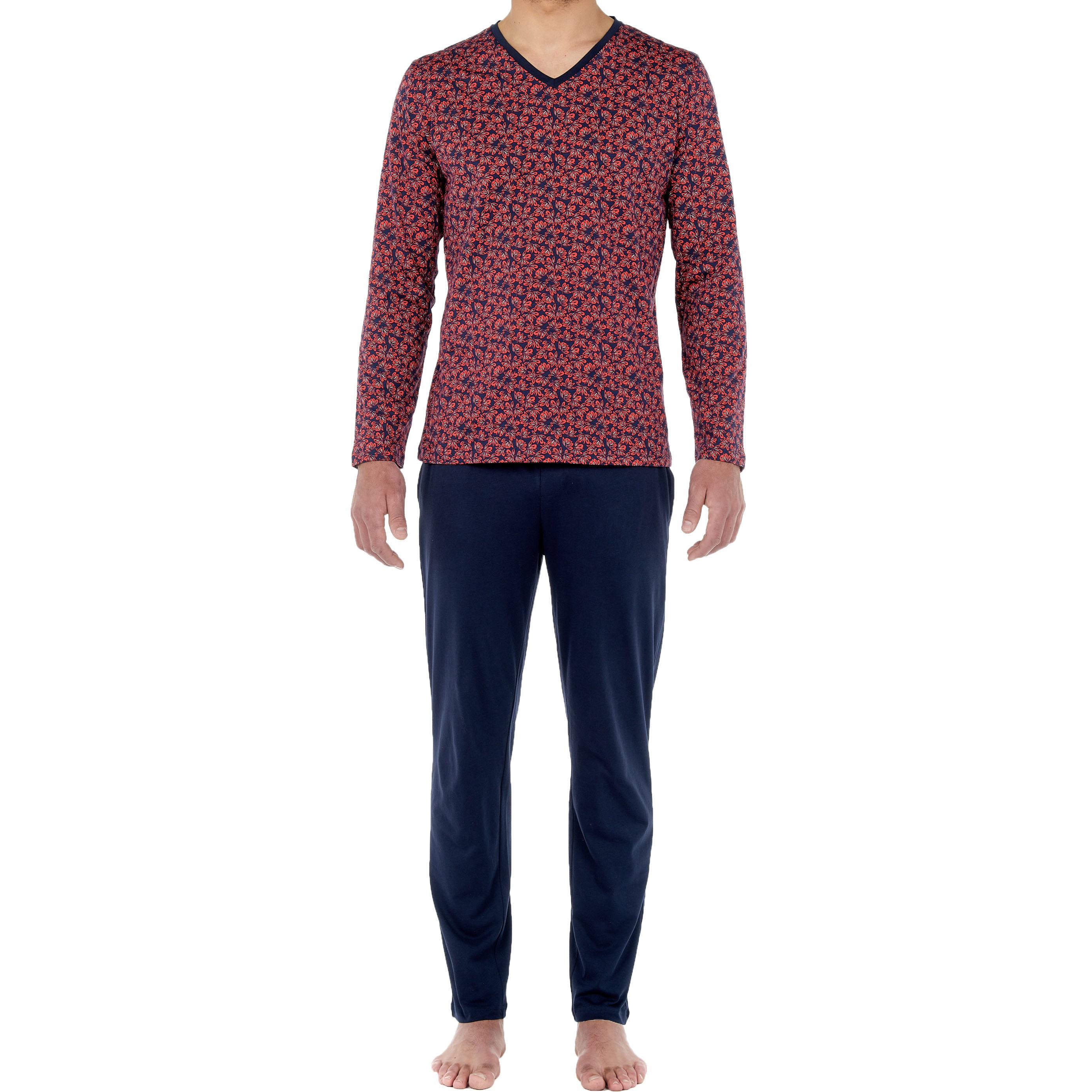 Le pyjama pour hommes LOE est un pyjama long de deux pièces, t-shirt manches longues et pantalon, en coton, de maille jersey. Son esthétique est impeccable: des finitions parfaites et un imprimé à la fois structuré et foisonnant de fleurs rouges et blanches sur fond bleu marine. Le T-shirt manches longues présente l’imprimé floral et le bas de pyjama a été pensé en contraste, sobre, uni et de couleur bleu marine.