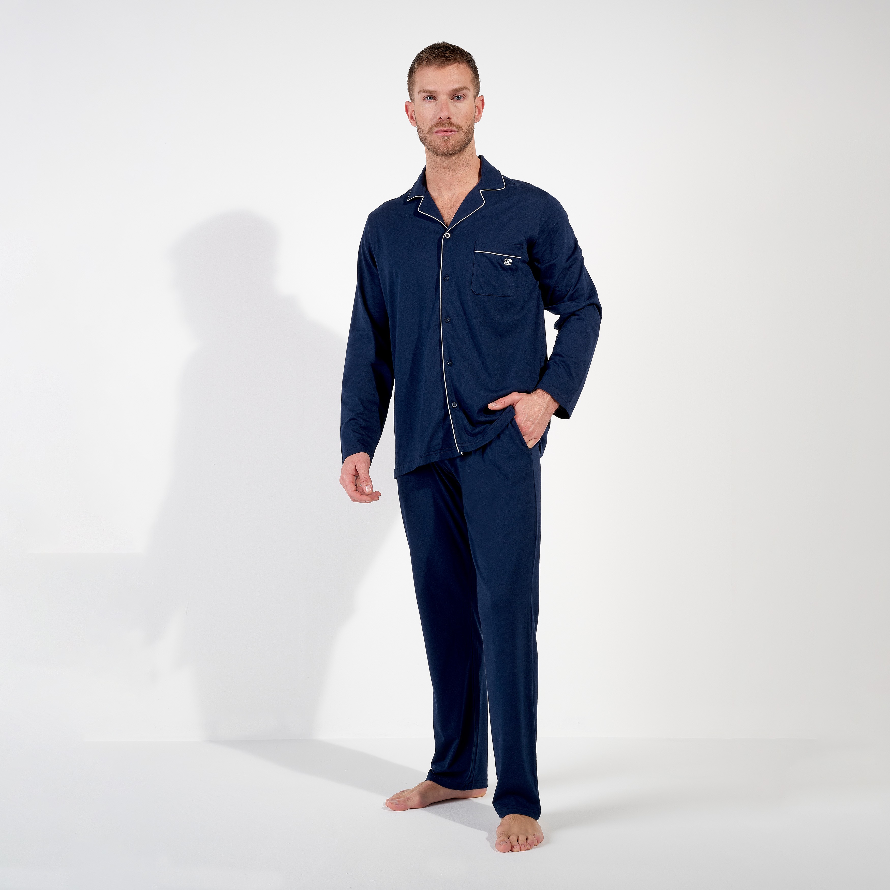 Le pyjama homme RAFAEL revisite le grand classique du vestiaire de nuit masculin avec une approche haut de gamme, élégante et confortable. Il se compose d’un ensemble long confectionné dans un mélange de coton et de modal, une matière réputée pour sa douceur exceptionnelle, sa respirabilité naturelle et sa résistance au lavage. Fluide et souple, ce tissu accompagne les mouvements sans jamais coller à la peau, pour un confort optimal toute la nuit. La chemise à manches longues est boutonnée sur le devant avec de jolis boutons gravés HOM, détail discret mais signature de qualité. Le col tailleur, les poignets et la poche poitrine plaquée sont subtilement rehaussés d’un passepoil blanc contrastant qui souligne les lignes avec sophistication et ajoute une touche de raffinement à ce modèle de pyjama long. Le pantalon long assorti reprend la même matière douce et souple. Sa coupe droite assure une aisance naturelle, idéale pour dormir comme pour les moments de détente à la maison. RAFAEL est bien plus qu’un simple pyjama pour homme : c’est une pièce de homewear élégante pensée pour ceux qui aiment le confort, sans renoncer au style.