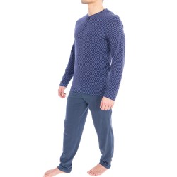 Ce pyjama homme attire avec son motif qui joue sur les tendances de cette nouvelle collection. Le motif est composé de rayures qui forme un ensemble graphique bleu marine et indigo. Le pyjama est coupé dans un jersey, 100% coton gratté ce qui le rend chaud, doux et très agréable au porter.