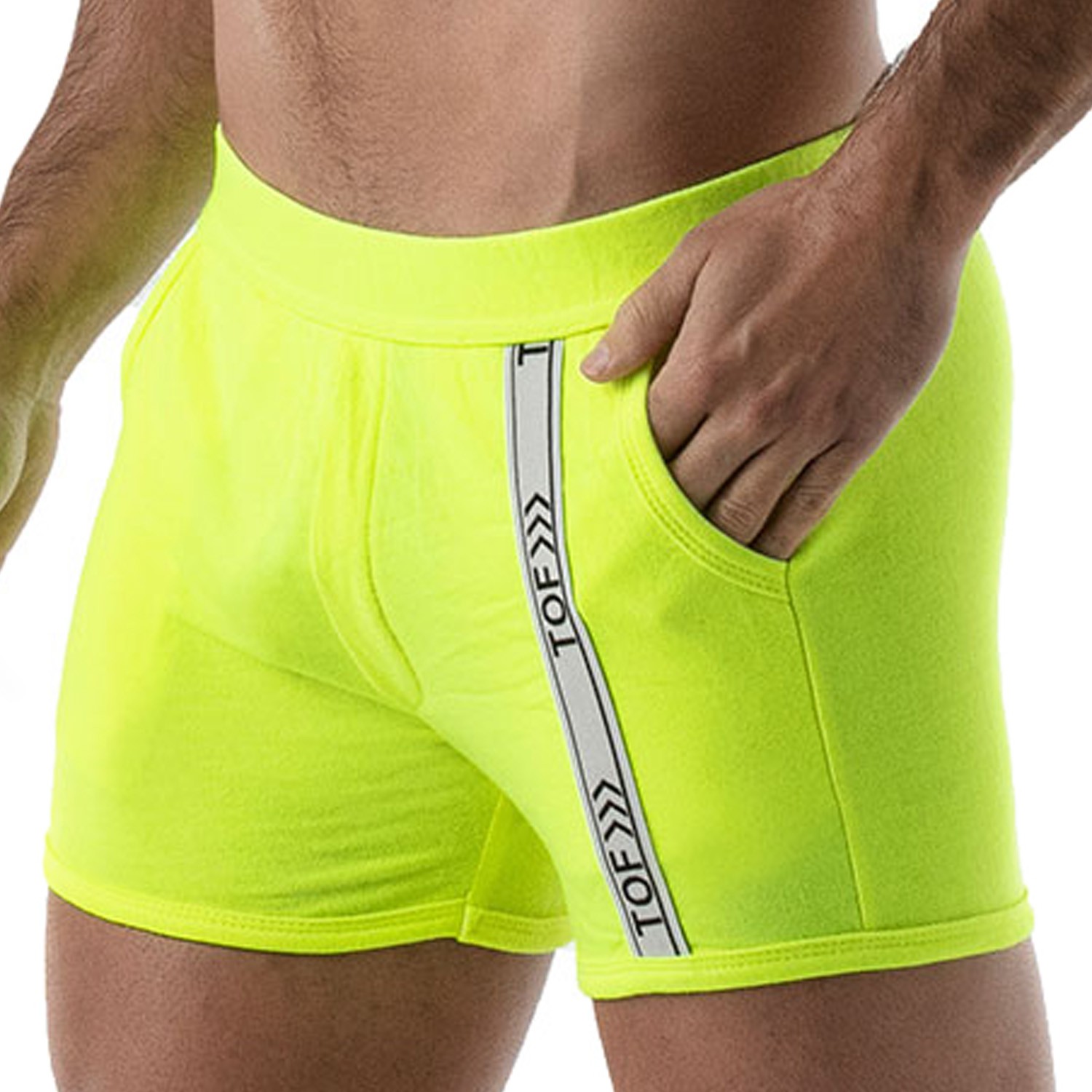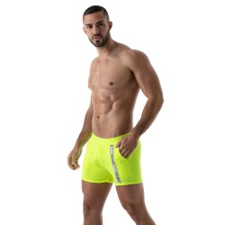 Short de sport taille basse sexy jaune fluo avec bande latérale siglée et contrastée