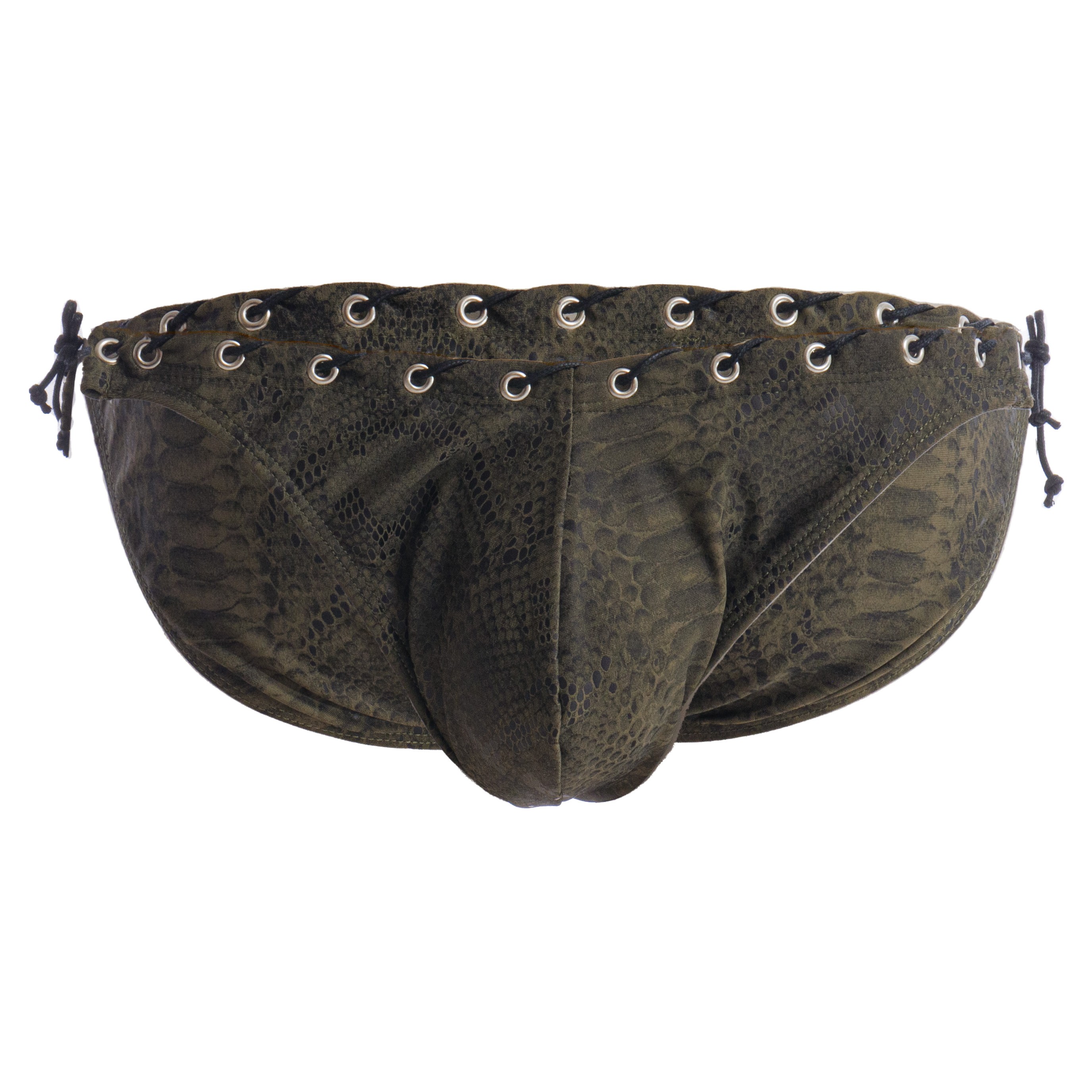 Le tissu principal de ce slip de bain pour homme est laminé avec un matériaux qui simule la peau d'un serpent. Il est doté de cordons imitation cuir visibles tout autour du slip.