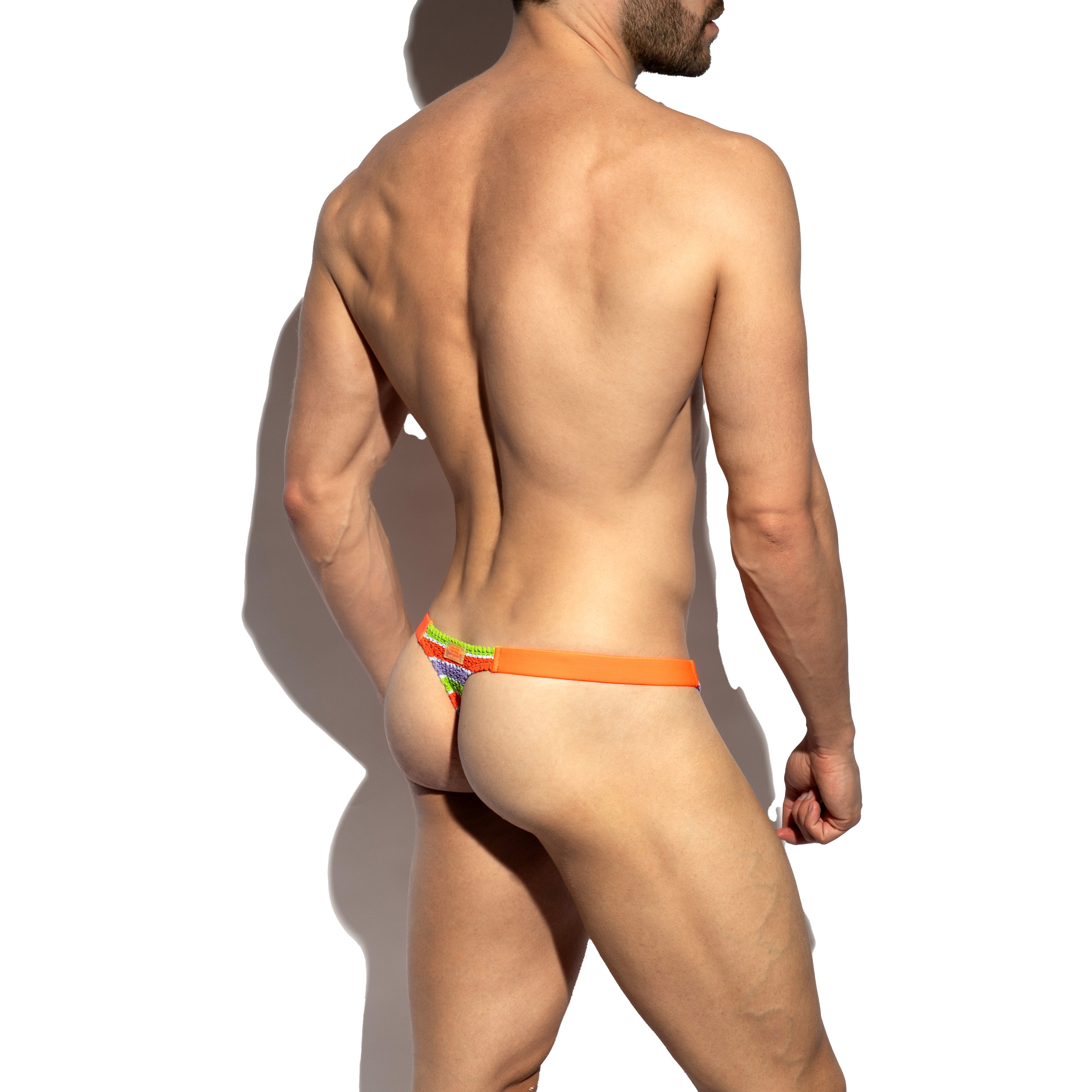 Découvrez le **String de Bain ADDICTED 70'S Stripes - Orange**, une pièce iconique de la collection de slips de bain pour homme signée **ES Collection**.