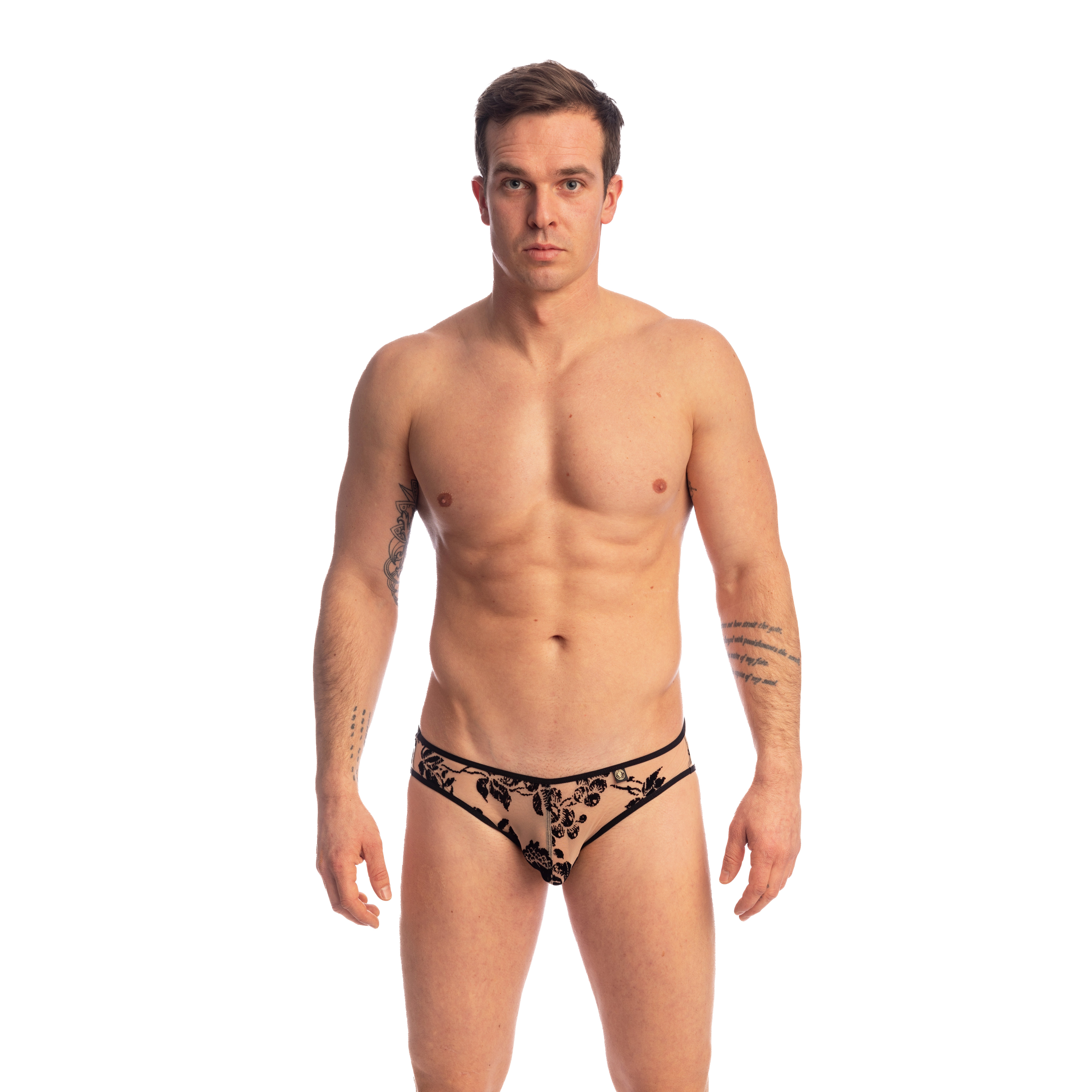 Plongez dans l'univers raffiné de la lingerie masculine avec le Velours & Luxure Mini Slip L'Homme Invisible, une pièce qui allie audace et délicatesse. Conçu pour l'homme moderne, ce mini slip transparent se distingue par sa coupe minimaliste, sublimant la silhouette avec une élégance saisissante. Son tulle nude, délicatement floqué de motifs floraux noirs en velours, crée un effet visuel intense, évoquant un tatouage floral qui épouse le corps comme une seconde peau.