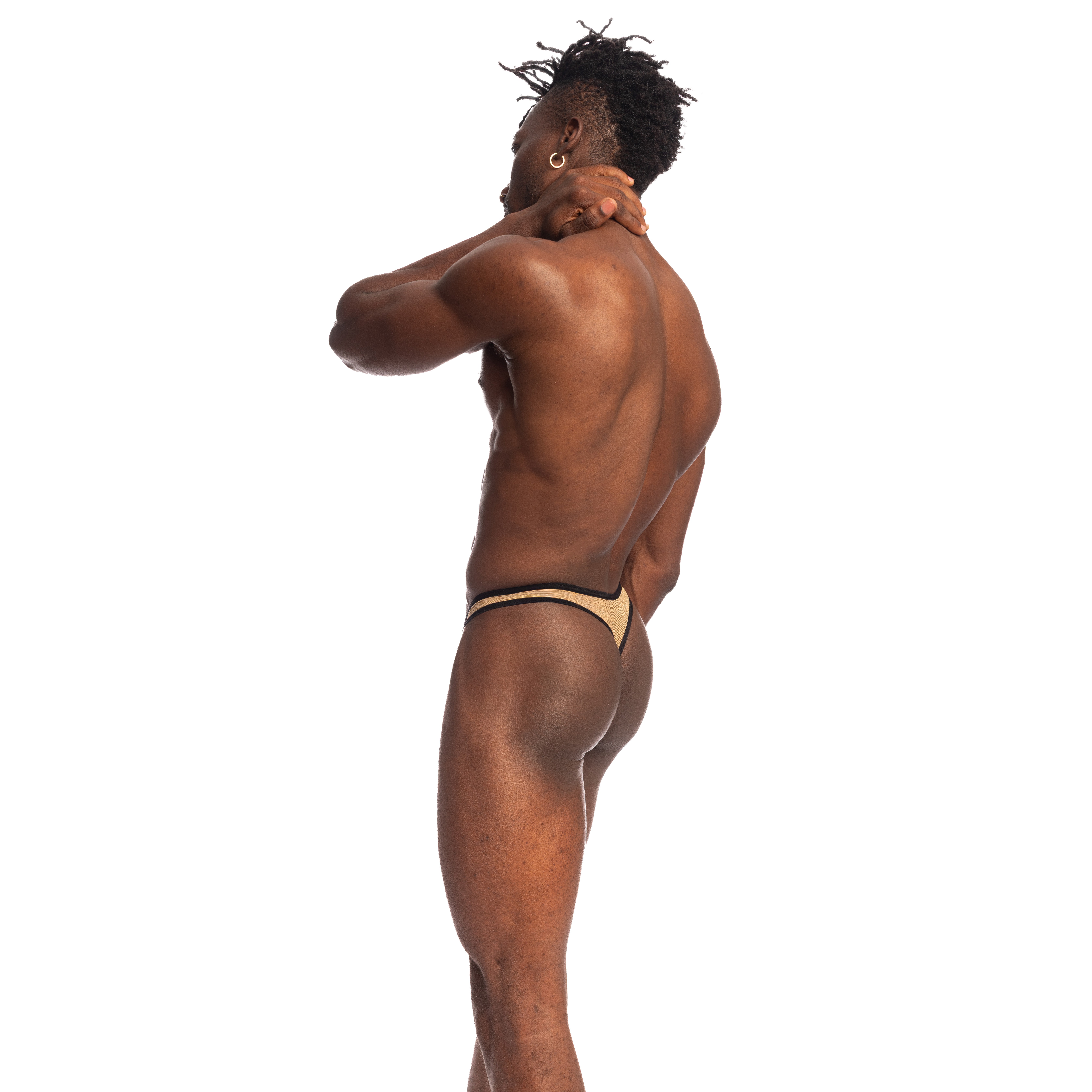 La microfibre premium qui compose ce string doré homme possède des qualités techniques exceptionnelles. Ultra-légère, elle offre une respirabilité optimale tout en maintenant une élasticité parfaite. Le traitement moiré n'est pas qu'un effet visuel : il crée une texture sophistiquée qui accroche délicatement la lumière, transformant ce string homme luxe en véritable bijou textile. La ficelle arrière, finement travaillée, assure un confort sans marque même sous les vêtements les plus ajustés.
