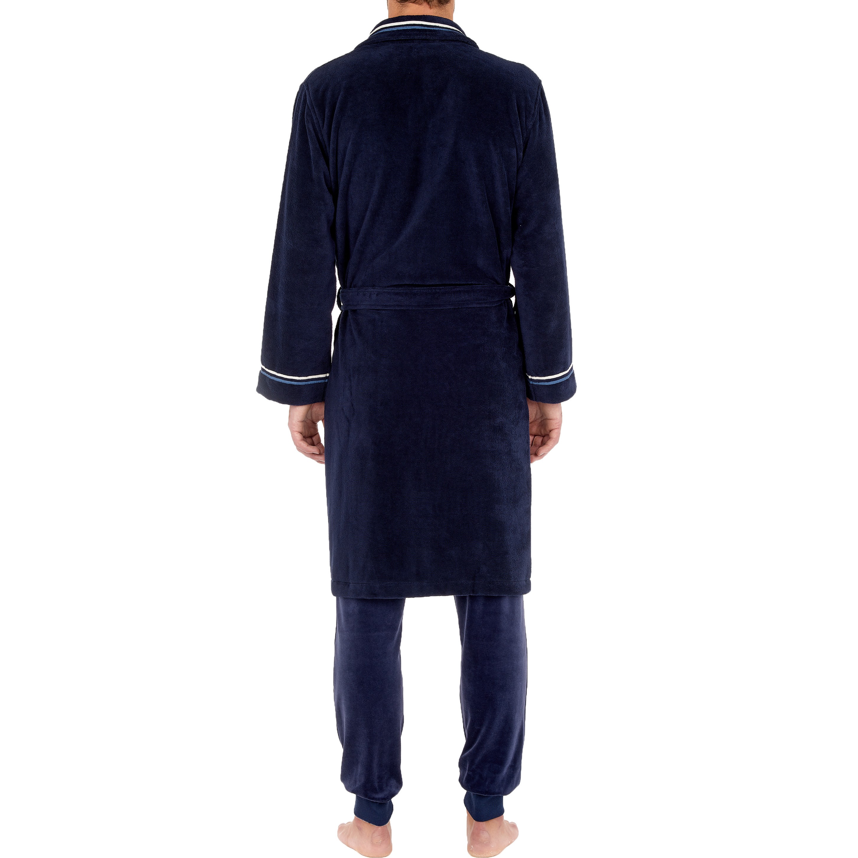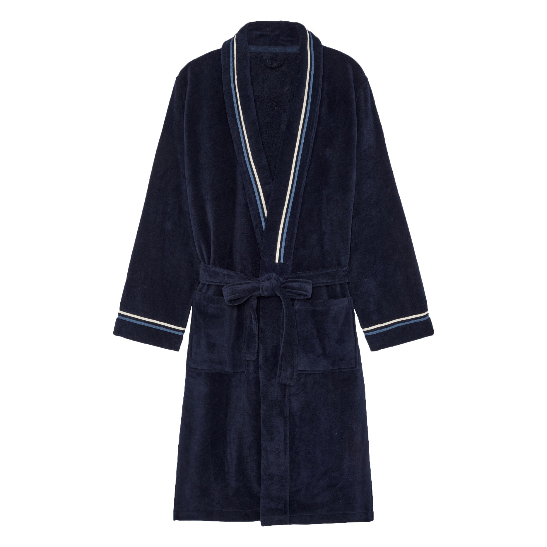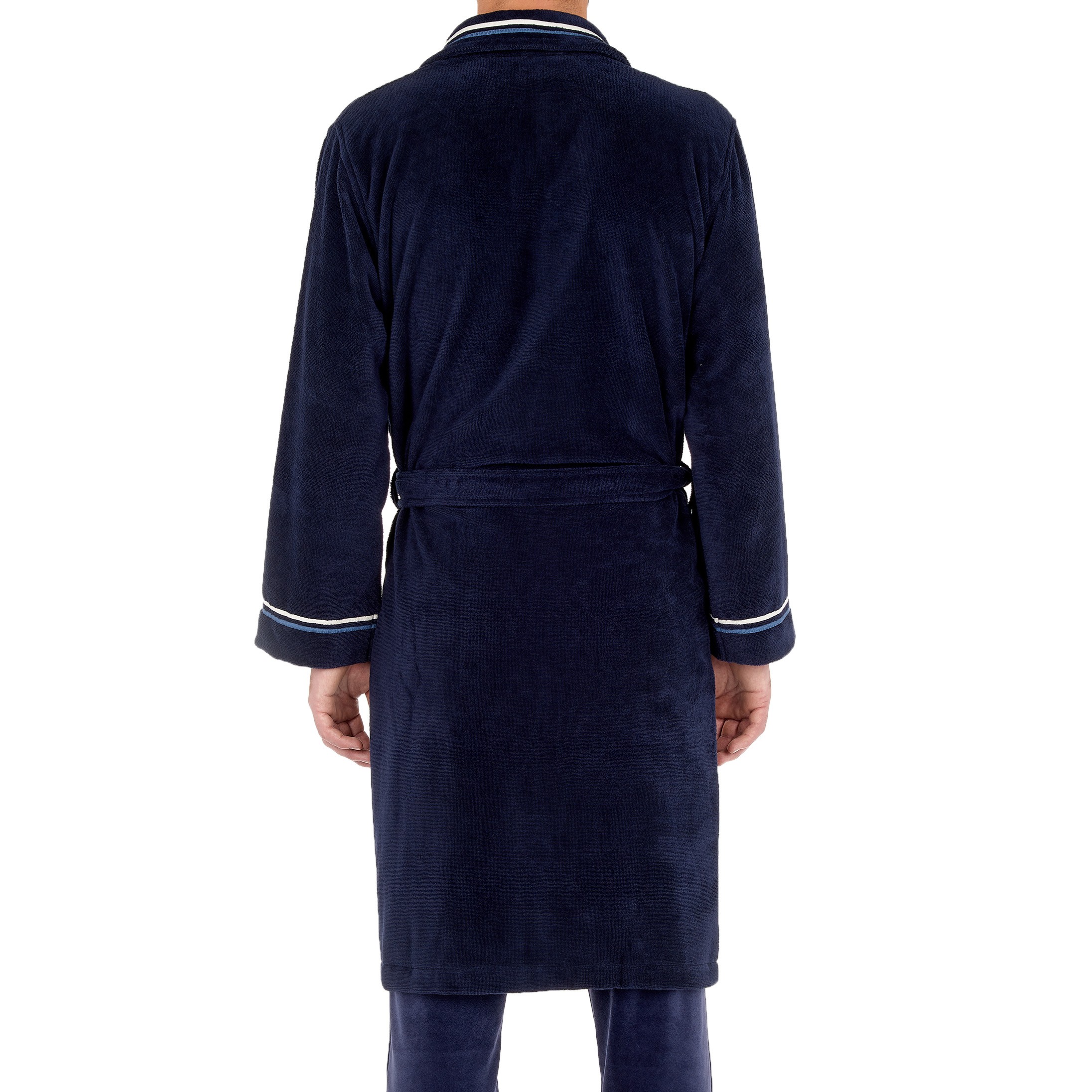 Le peignoir pour hommes TRANSAT est en velours de coton, ultra-doux et confortable. Il est de couleur unie, bleue marine aux finitions rayées blanches et bleues claires sur le col et aux extrémités de manches. Pour cultiver l’élégance jusque dans la décontraction...