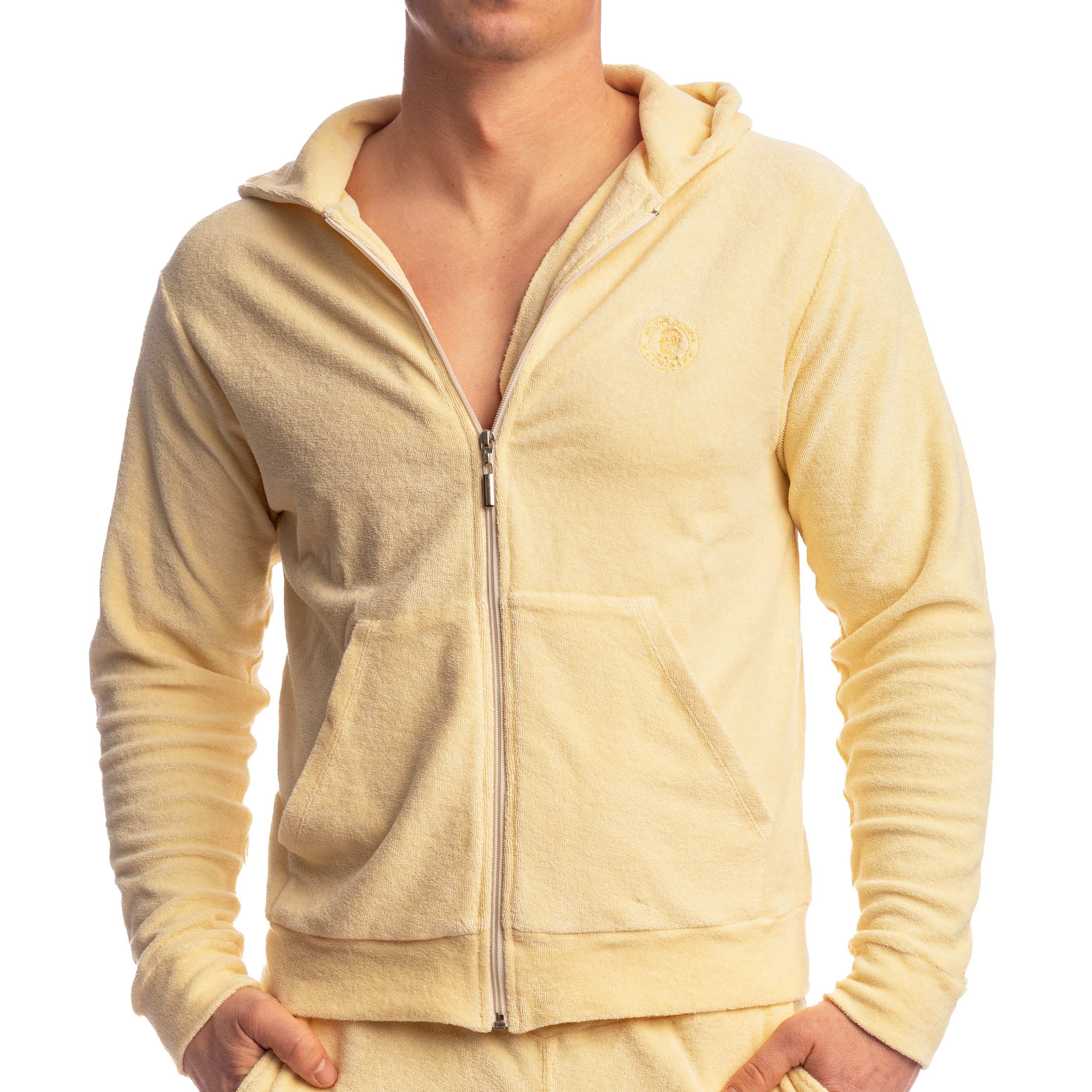 Hoodie zippé en éponge light lemon, doux et lumineux. Coupe ajustée, double zip.